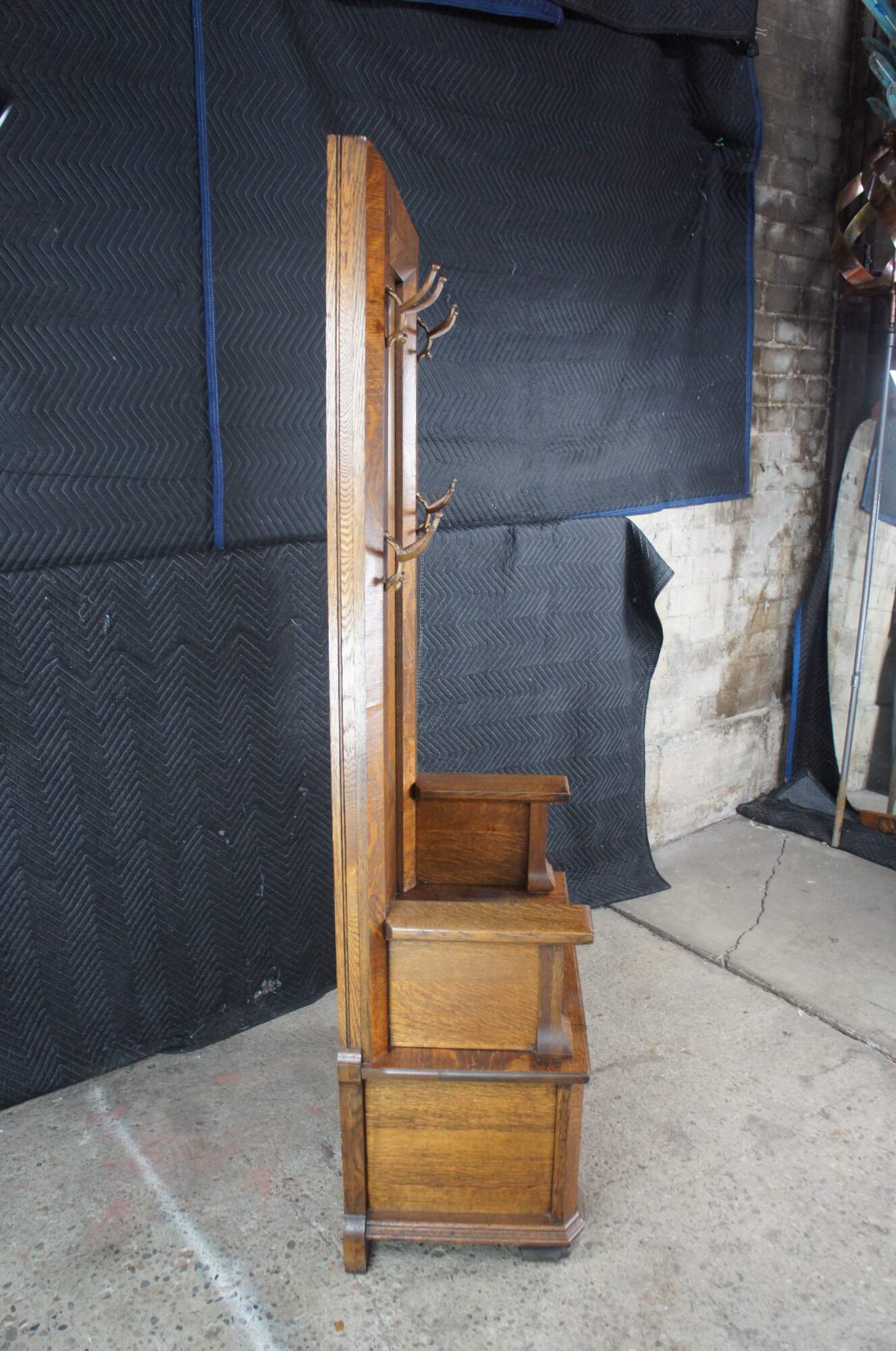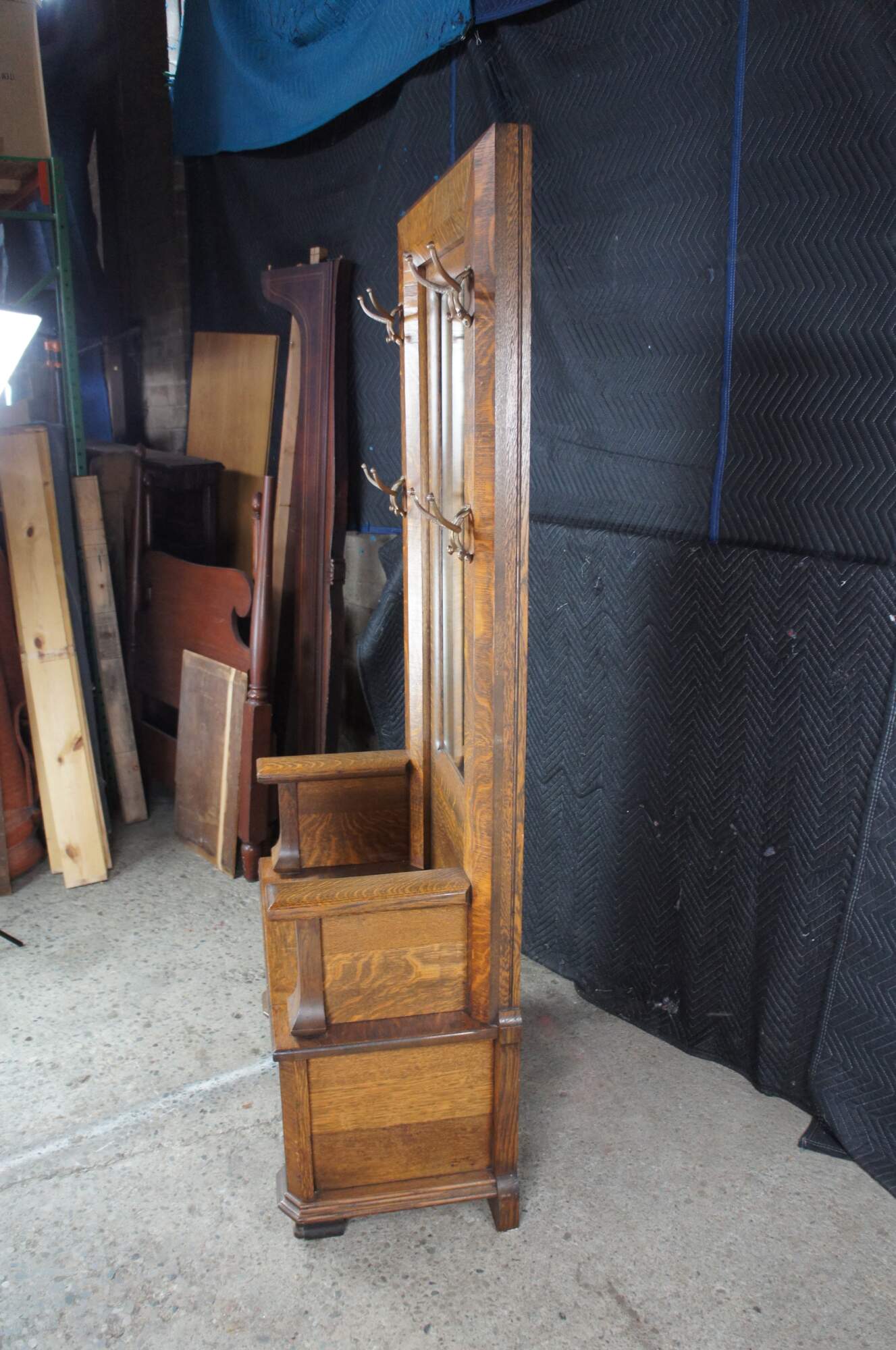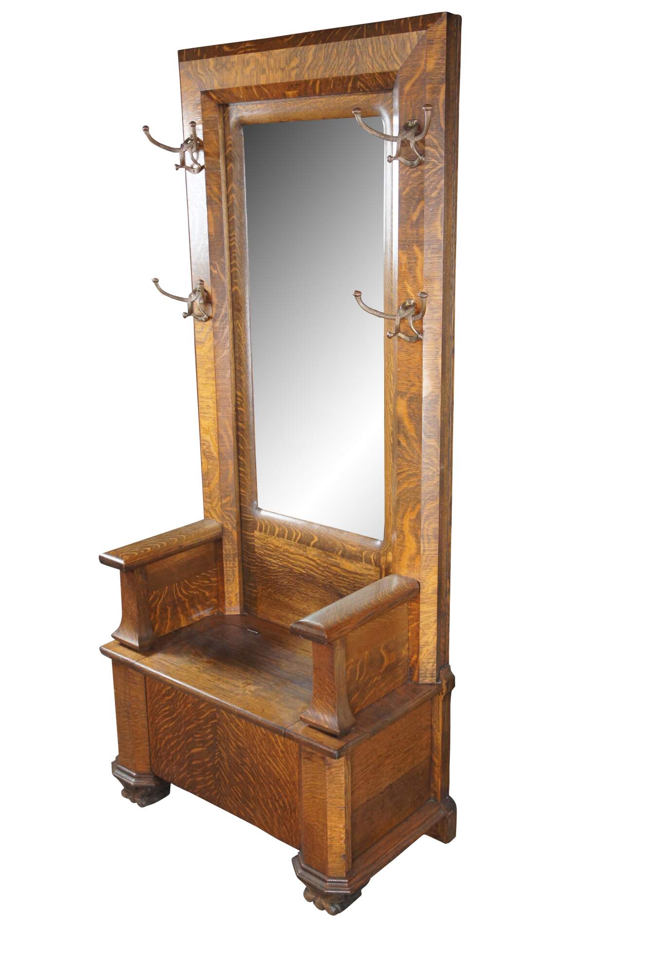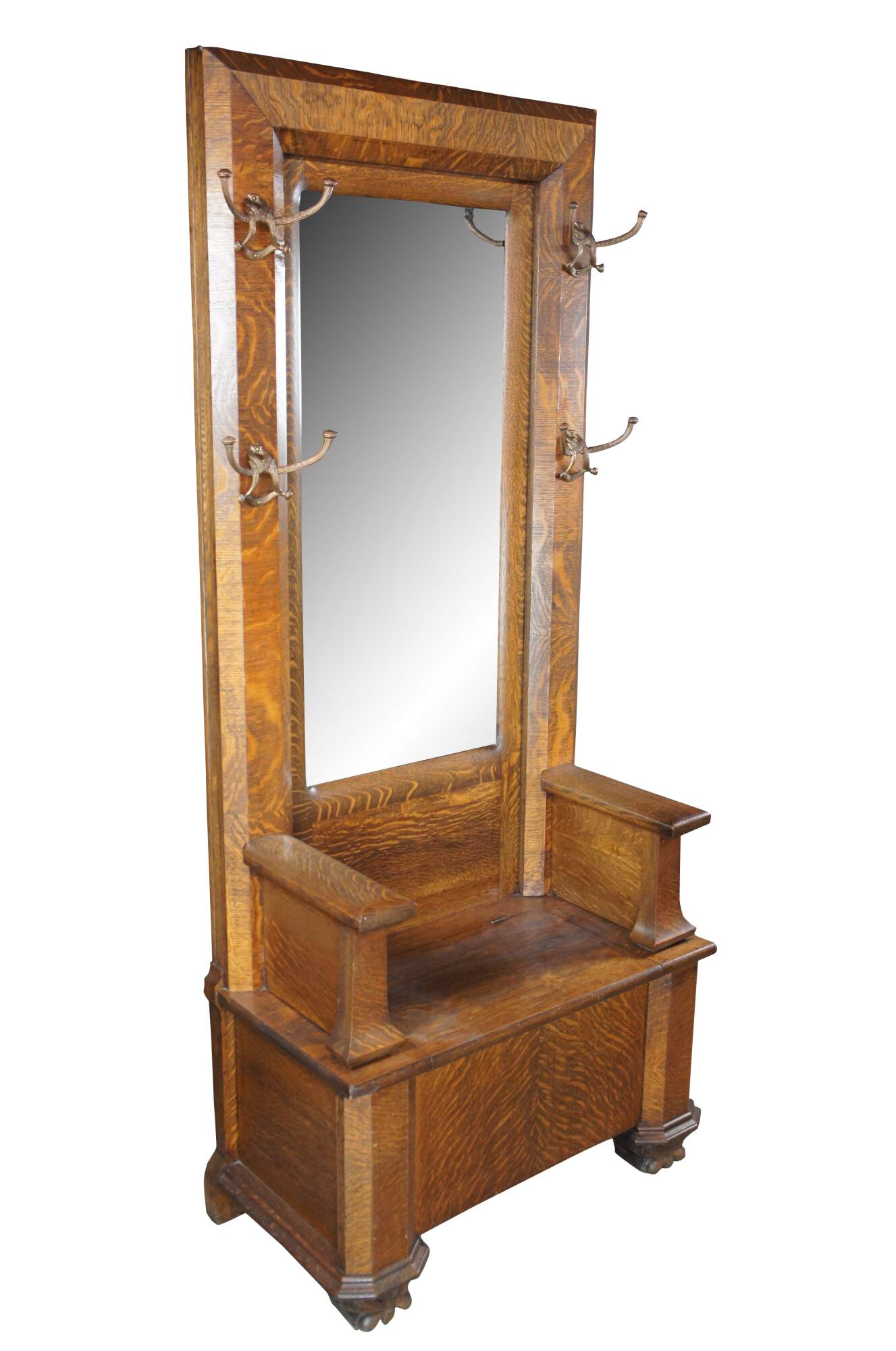 Antique Victorian Quartersawn Oak Hall Tree Bench Seat & Storage Beveled Mirror