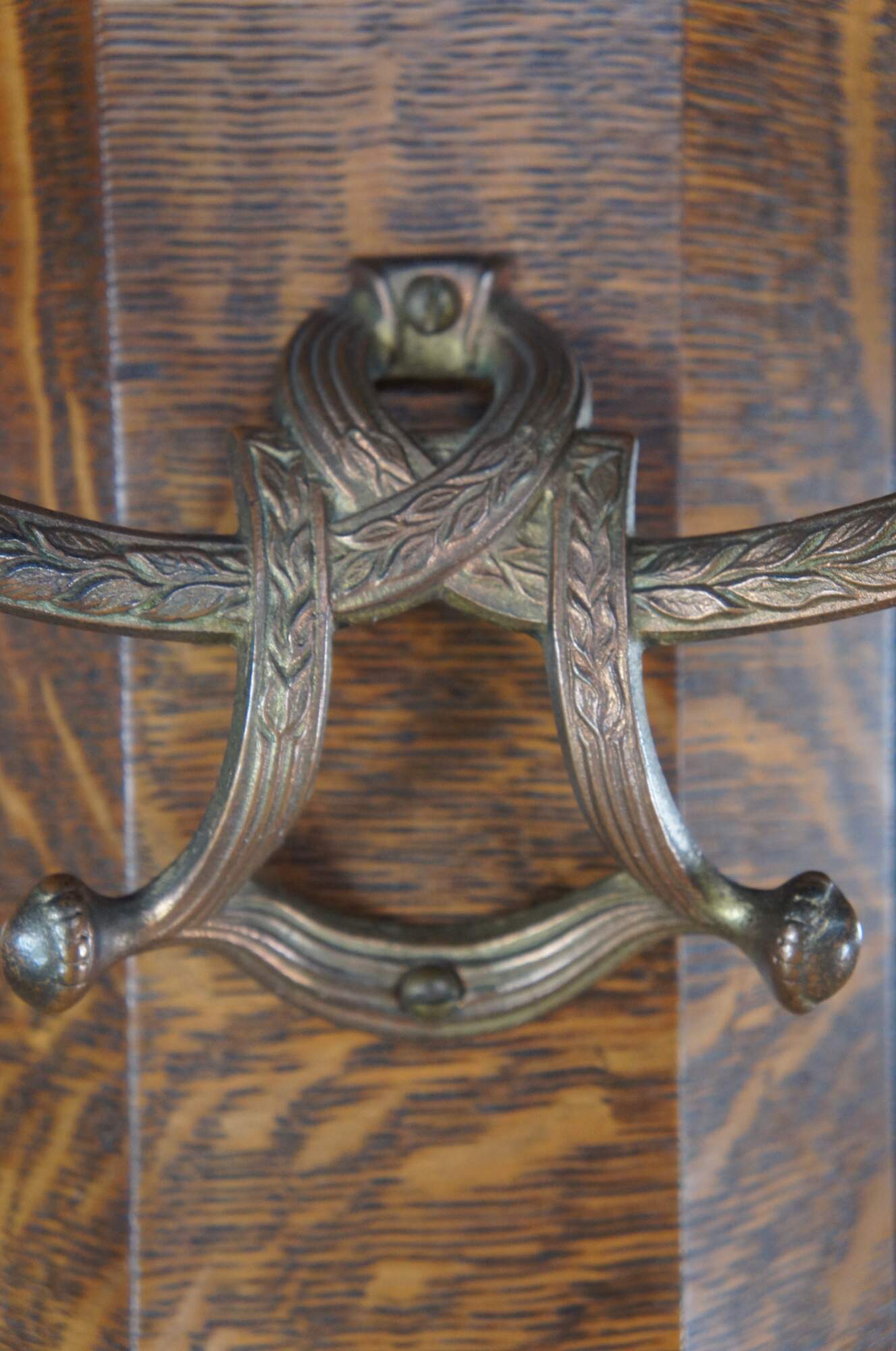 An Equisite Victorian Era Hall Tree & Bench Seat.. Features a chunky oak frame with Tiger Oak finish, beveled wood and mirror. Includes four ornate baroque style coat or hat hooks, underseat storage and fleur feet along the front. A stately addition to any space.