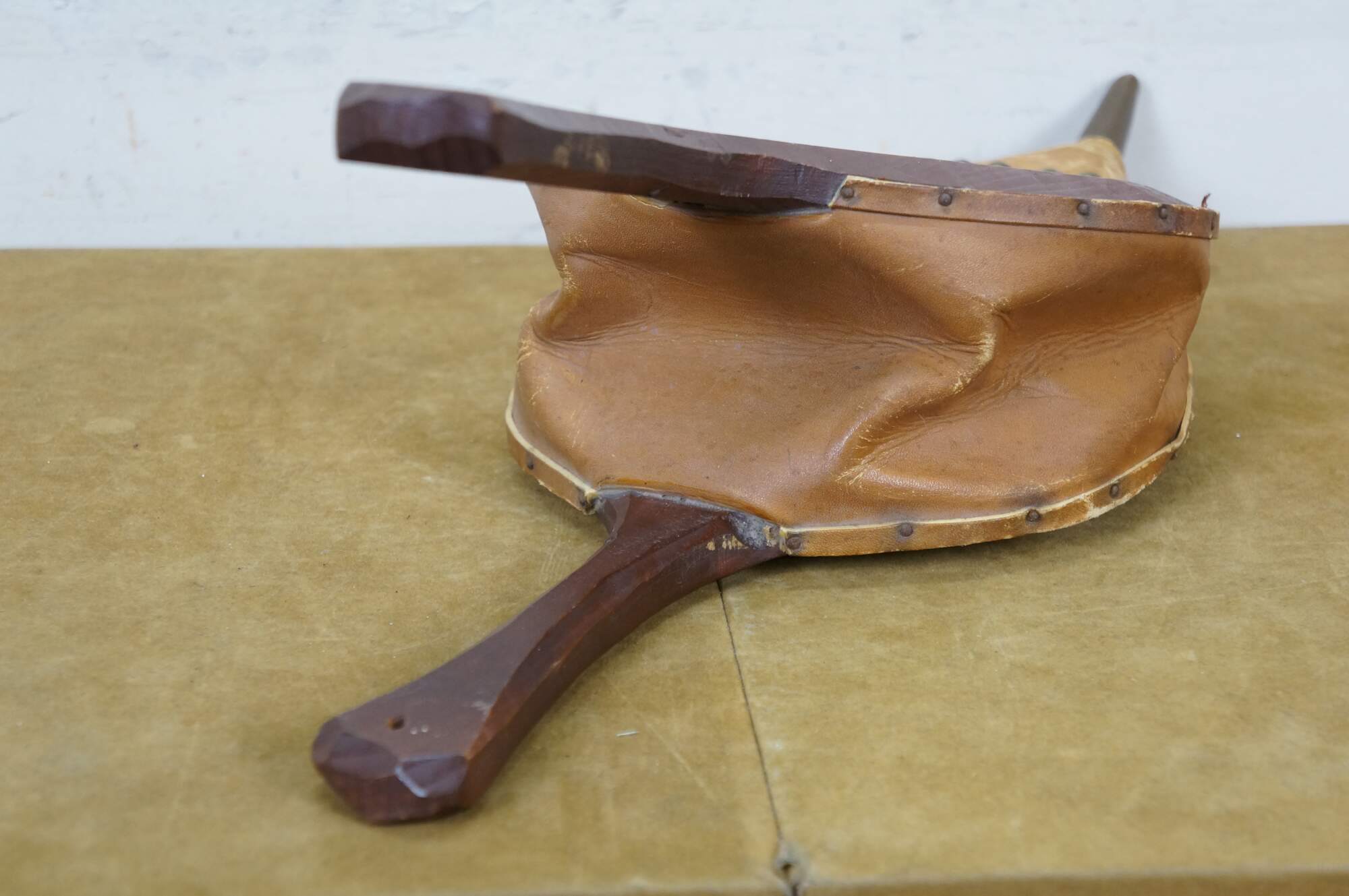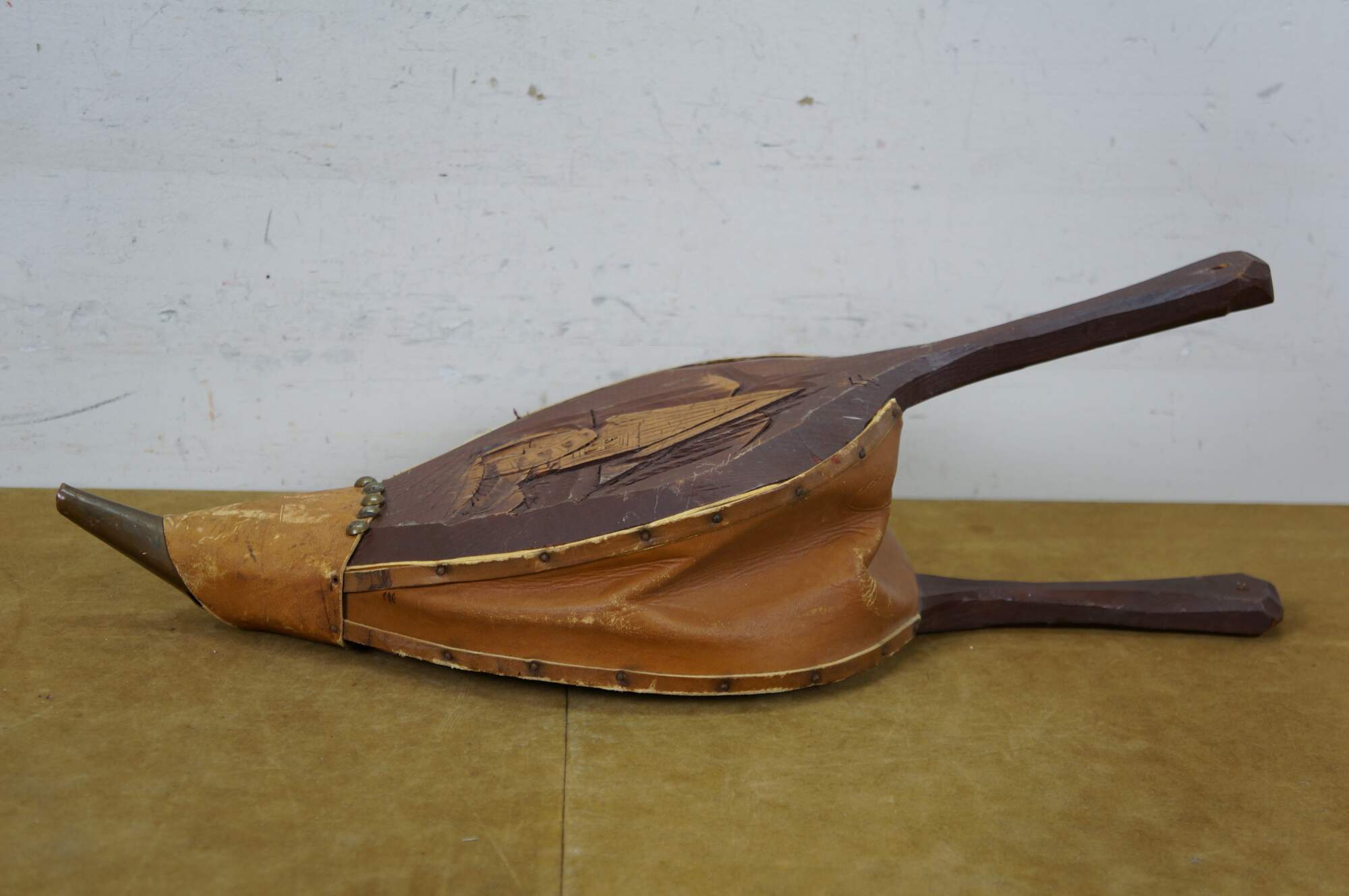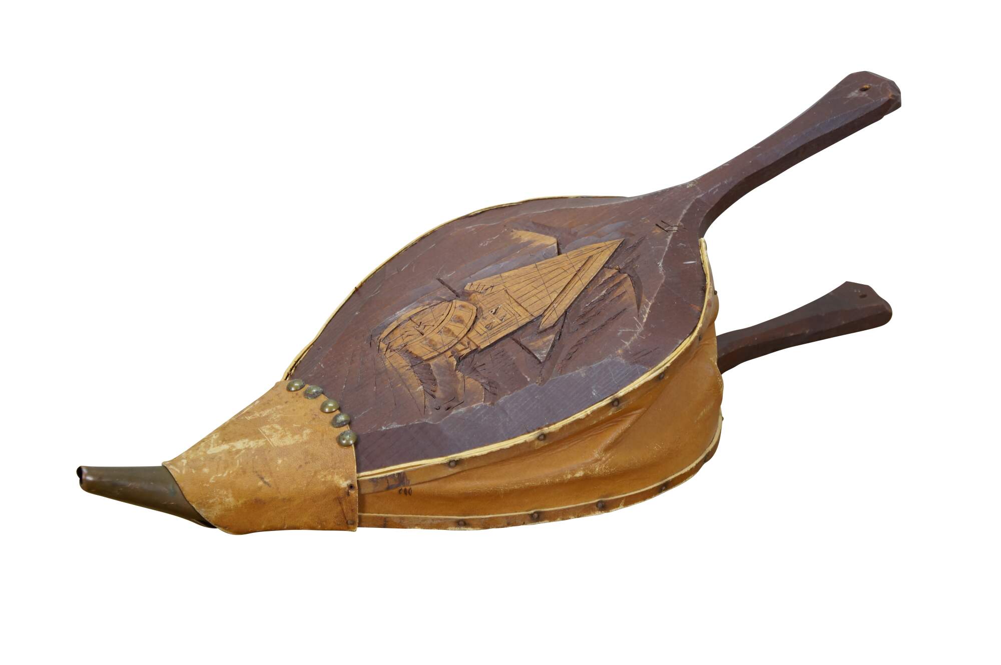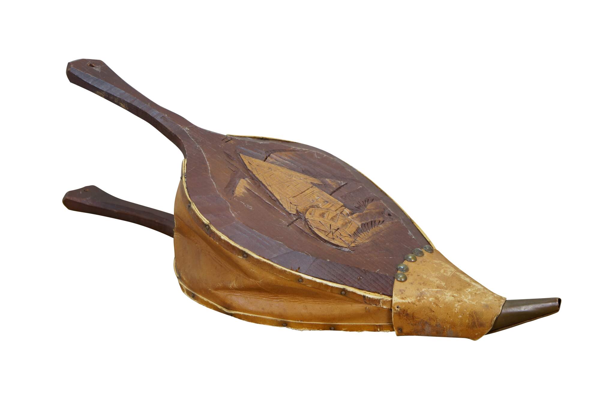 Early 20th century folk art carved wood and leather fireplace bellows / hearthware. Brass tip / spout, brown leather sides and wrapping. Rough carved wooden paddles, decorated with the image of a small farmhouse water mill.