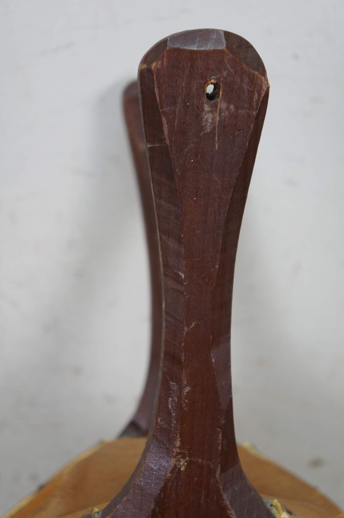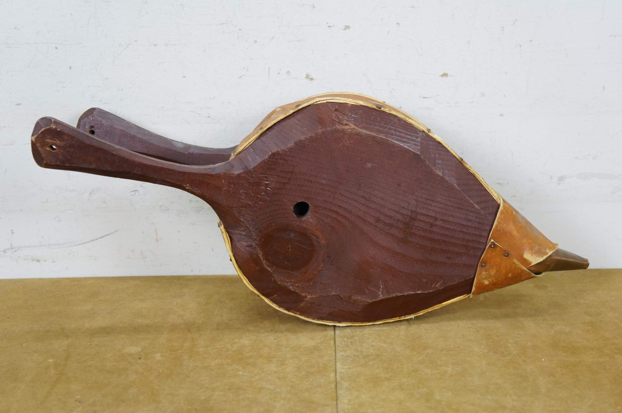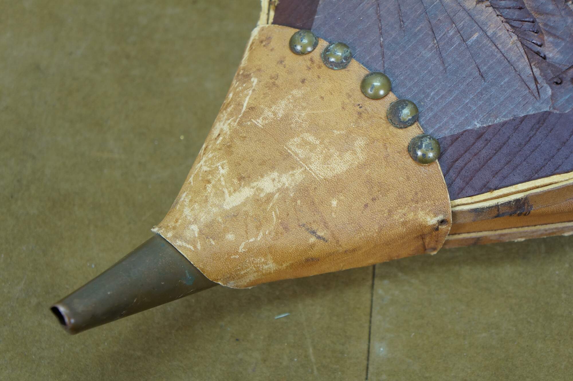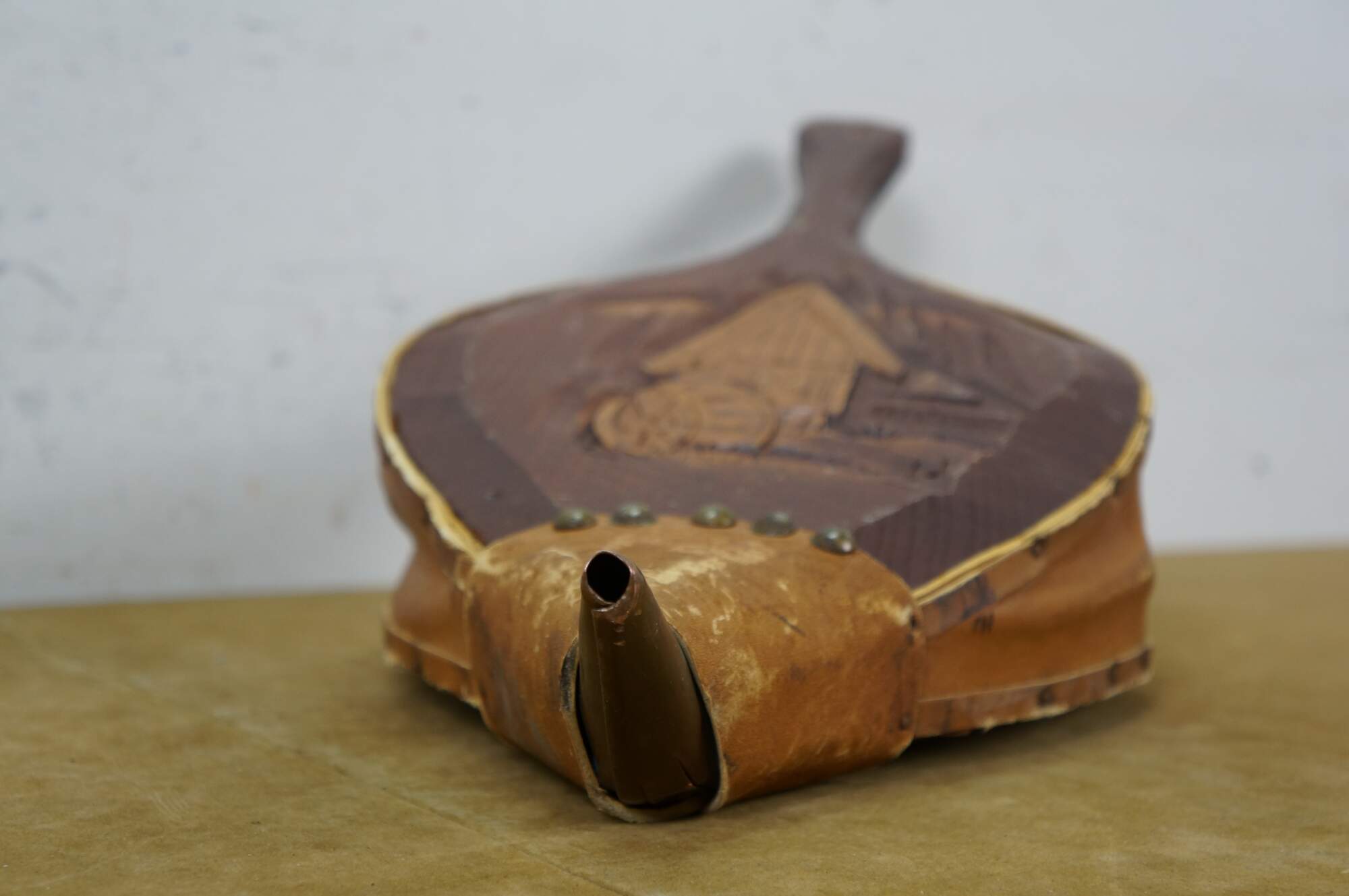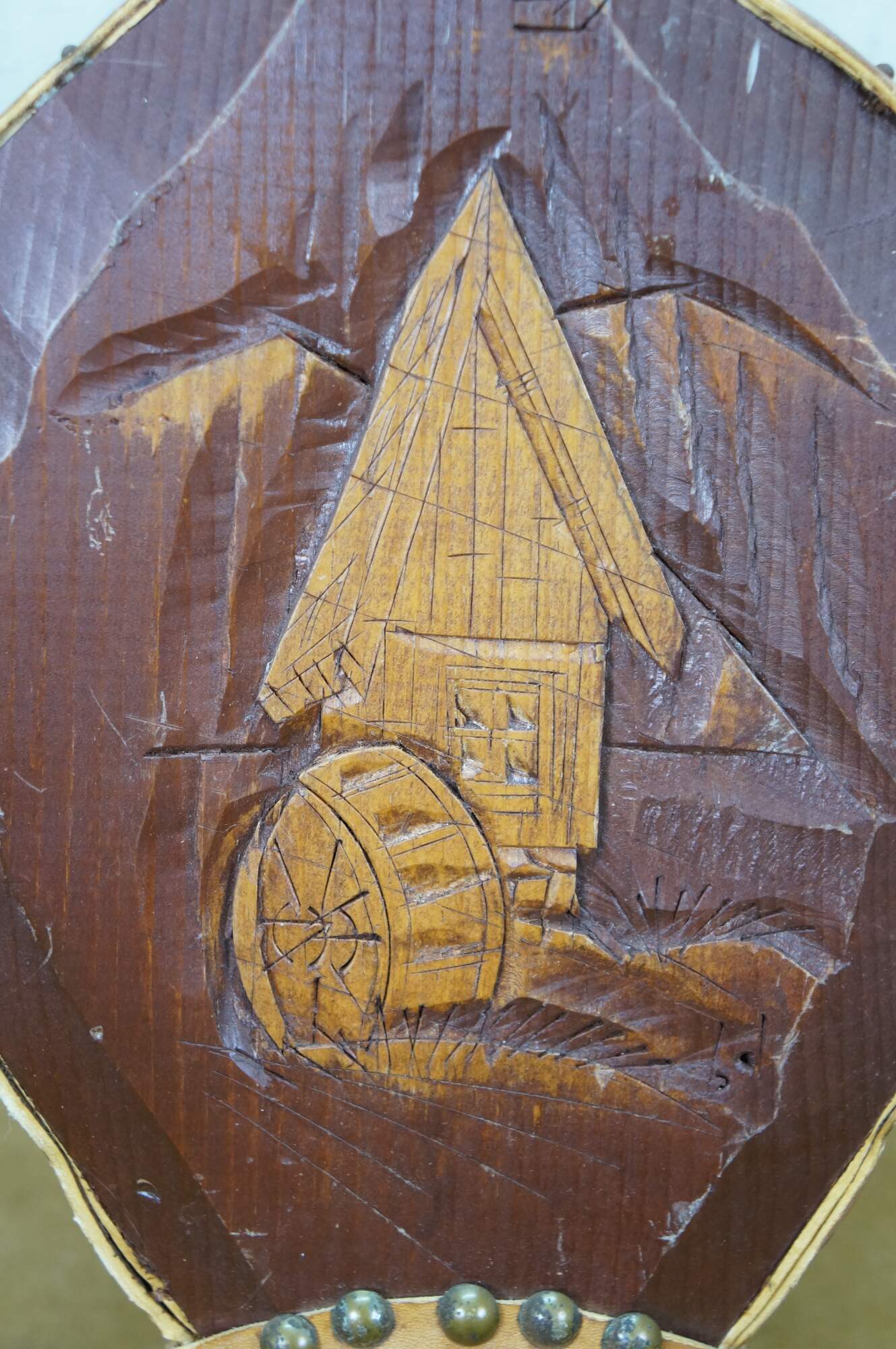 Early 20th century folk art carved wood and leather fireplace bellows / hearthware. Brass tip / spout, brown leather sides and wrapping. Rough carved wooden paddles, decorated with the image of a small farmhouse water mill.