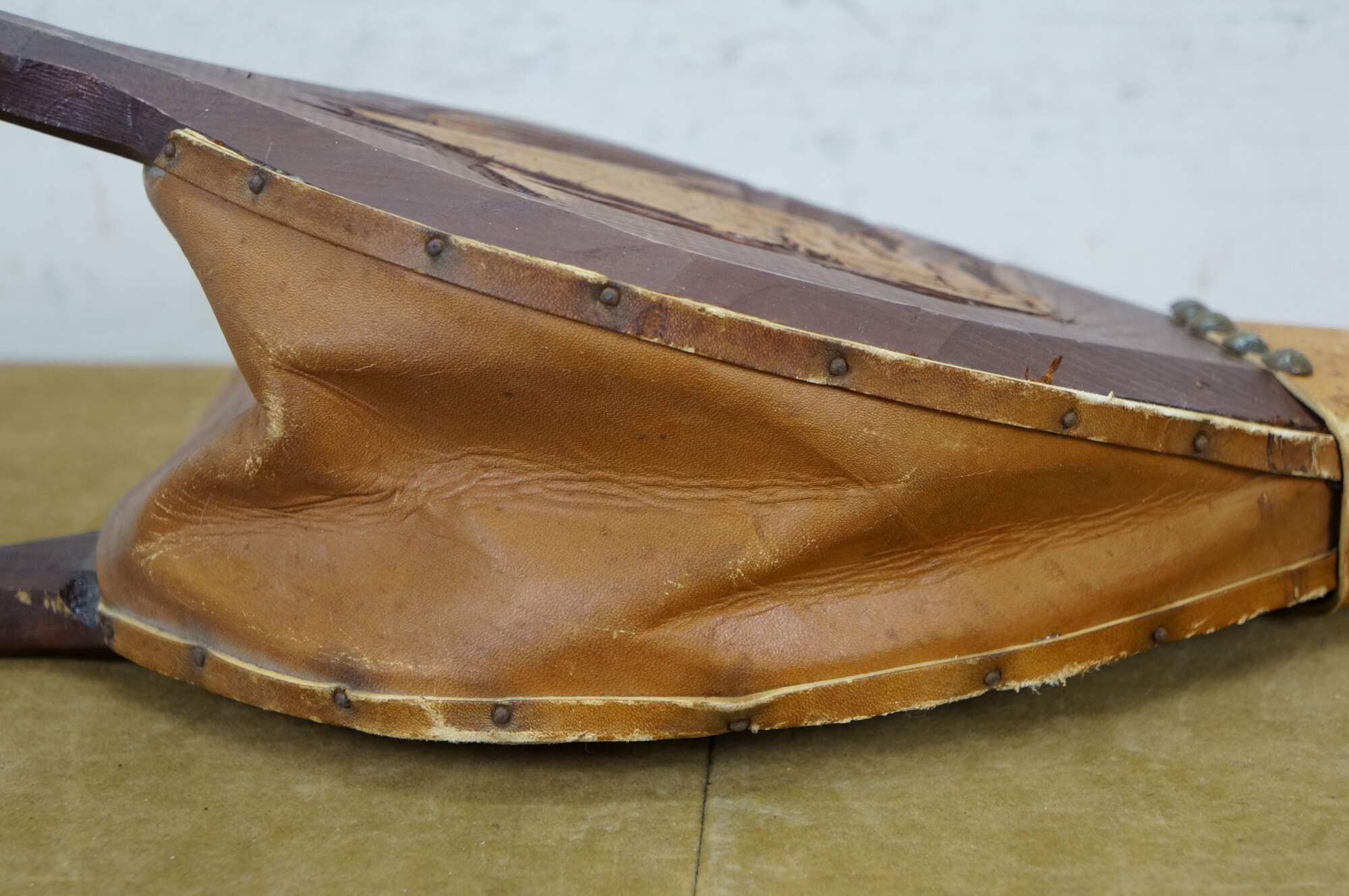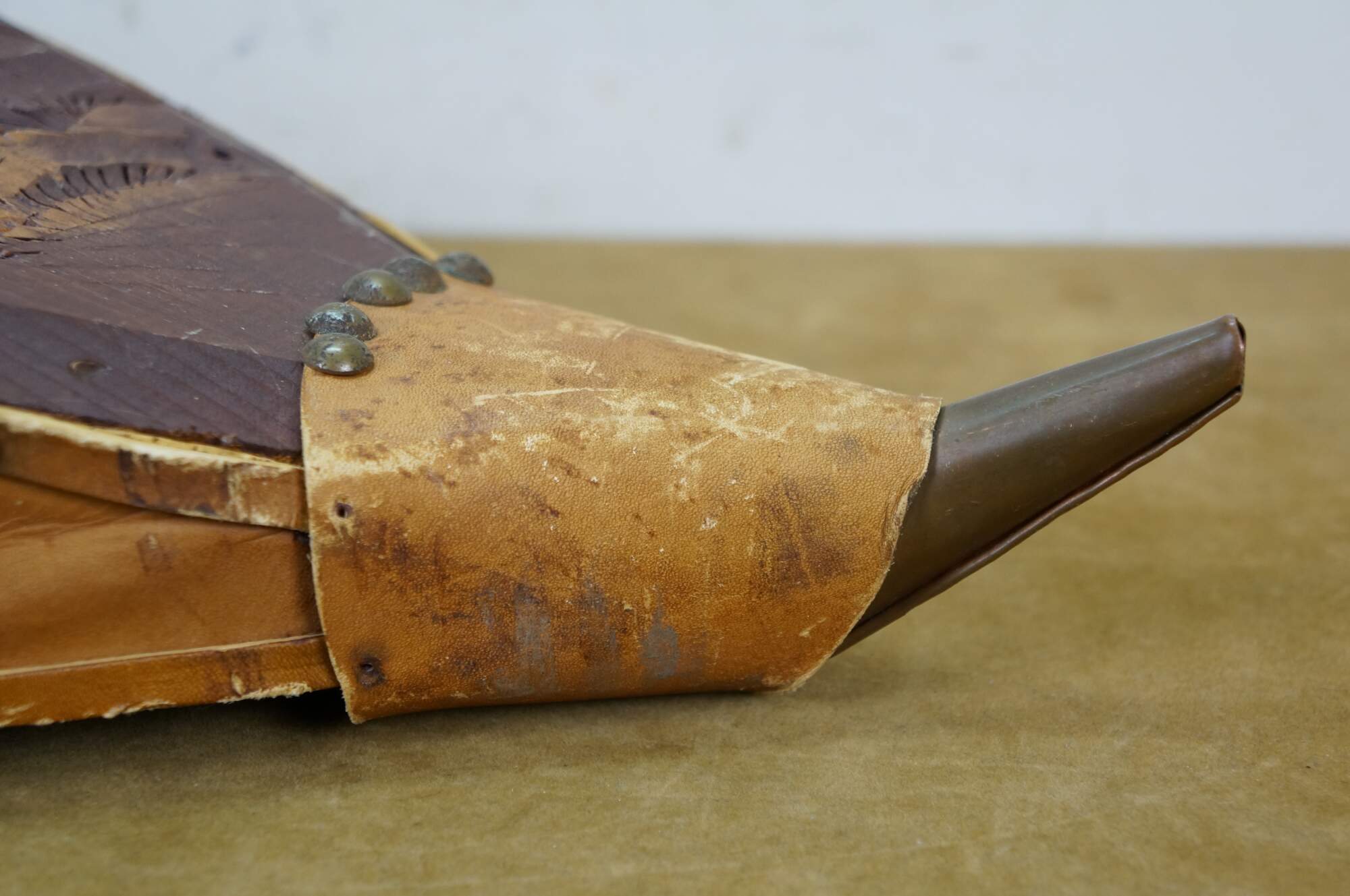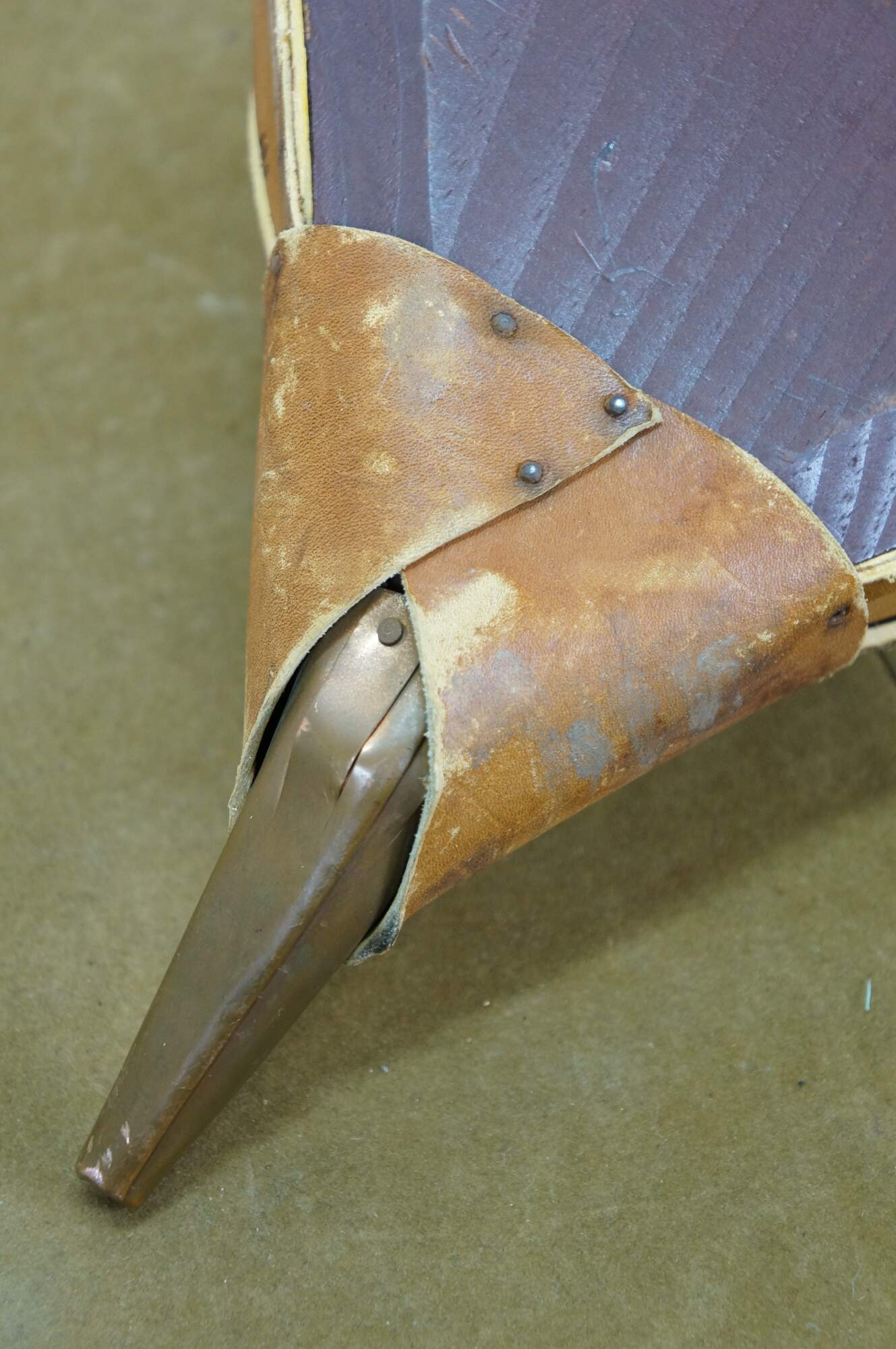 wear; scuffs/scrapes throughout; leather stiff, missing a few nailheads
