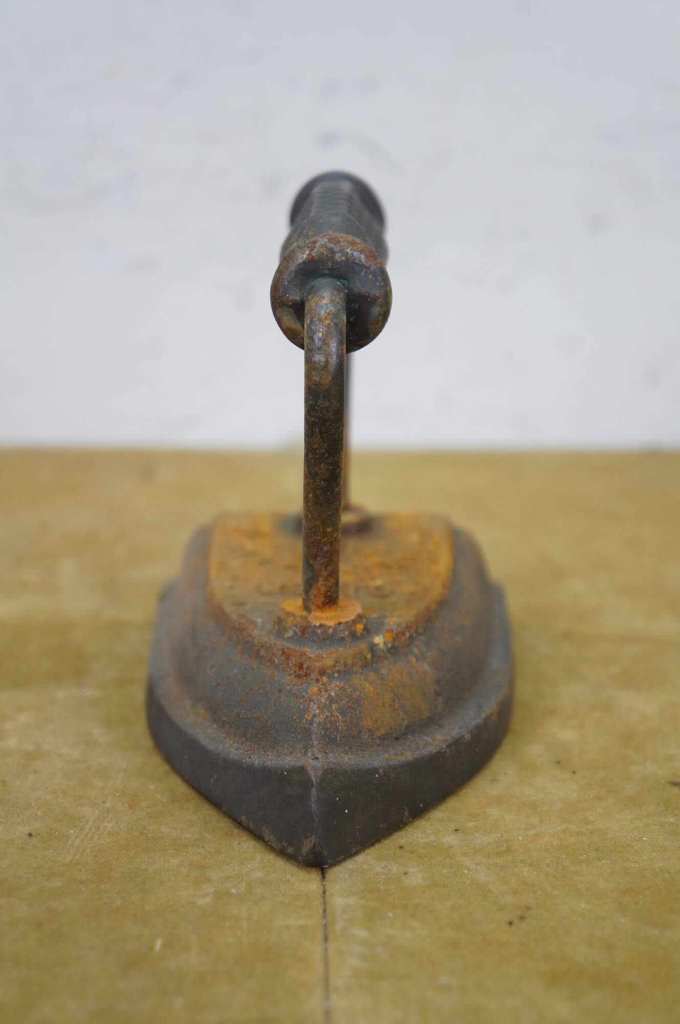 Lot of 8 late 19th to early 20th century sad irons / clothing irons and one wrought iron trivet. Includes one small hand forged iron, UDX No. 4 and No. 6, Ober No. 6 and No. 8, Downs & Co No. 8, and a No. 4 and No. 8 of unknown makers.