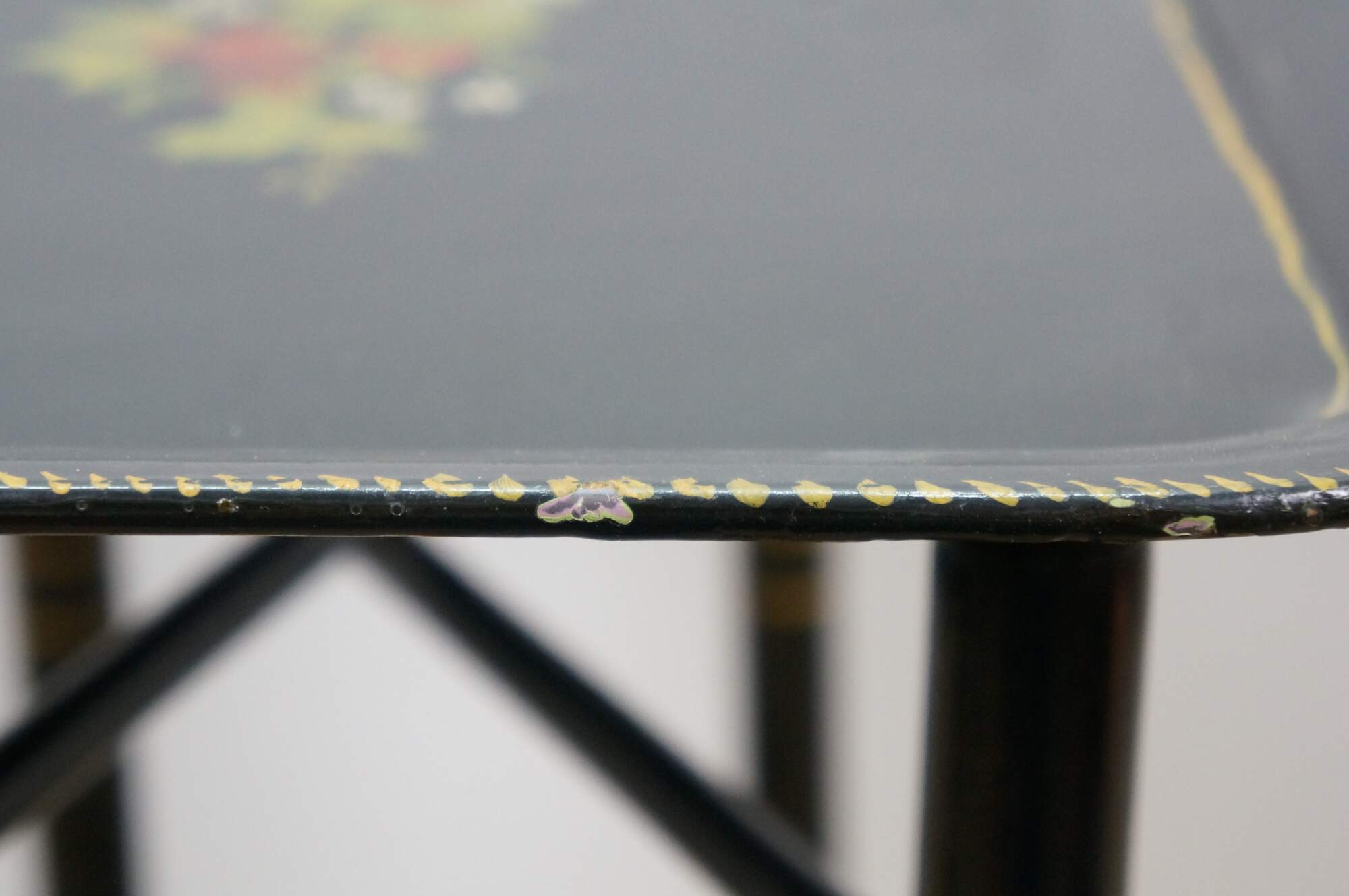 Vintage black painted toleware tray table consisiting of a rectangular serving tray hand painted with a cluster of strawberries and gold details and a four legged black lacquer folding stand with suction cups at the tops of the legs.
