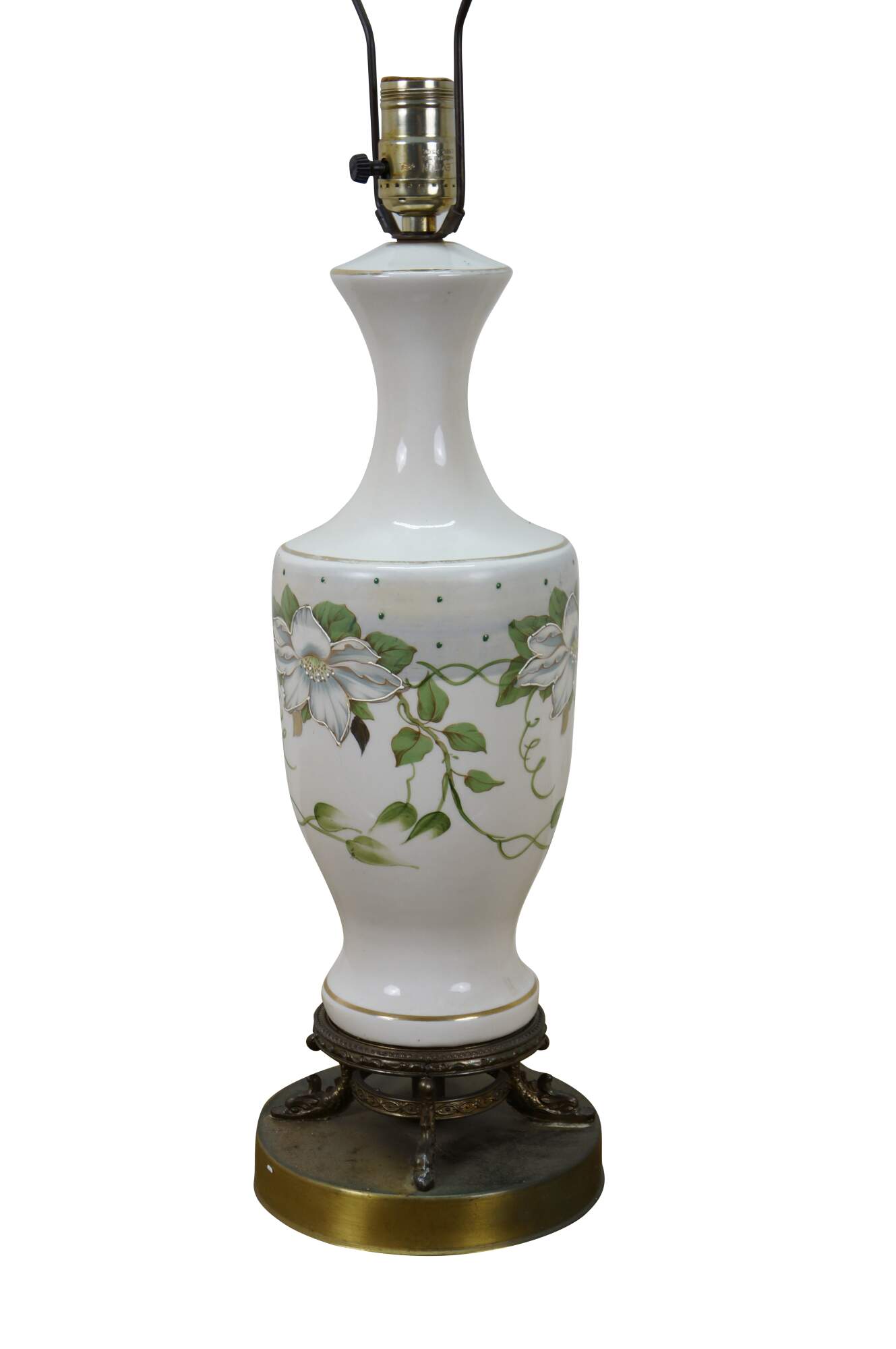 Early to mid 20th century white porcelain vase shaped table lamp, printed with a design of large white flowers and green vines, supported on a round brass base with dolphin / delphin / serpent head shaped feet. Includes harp anf brass finial.