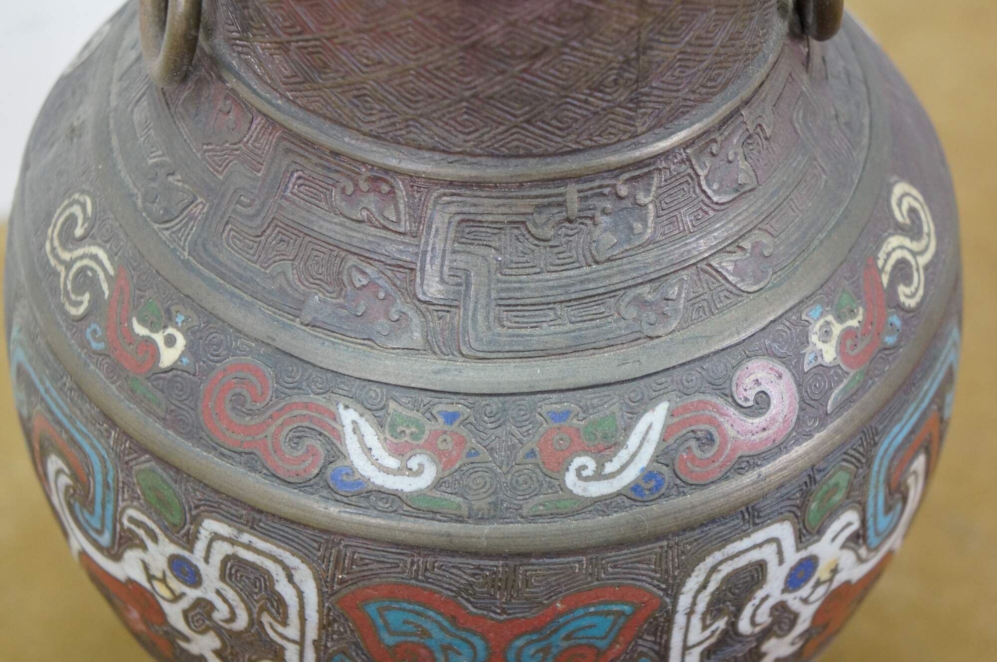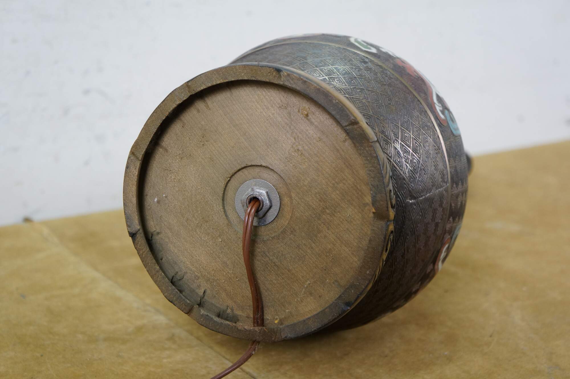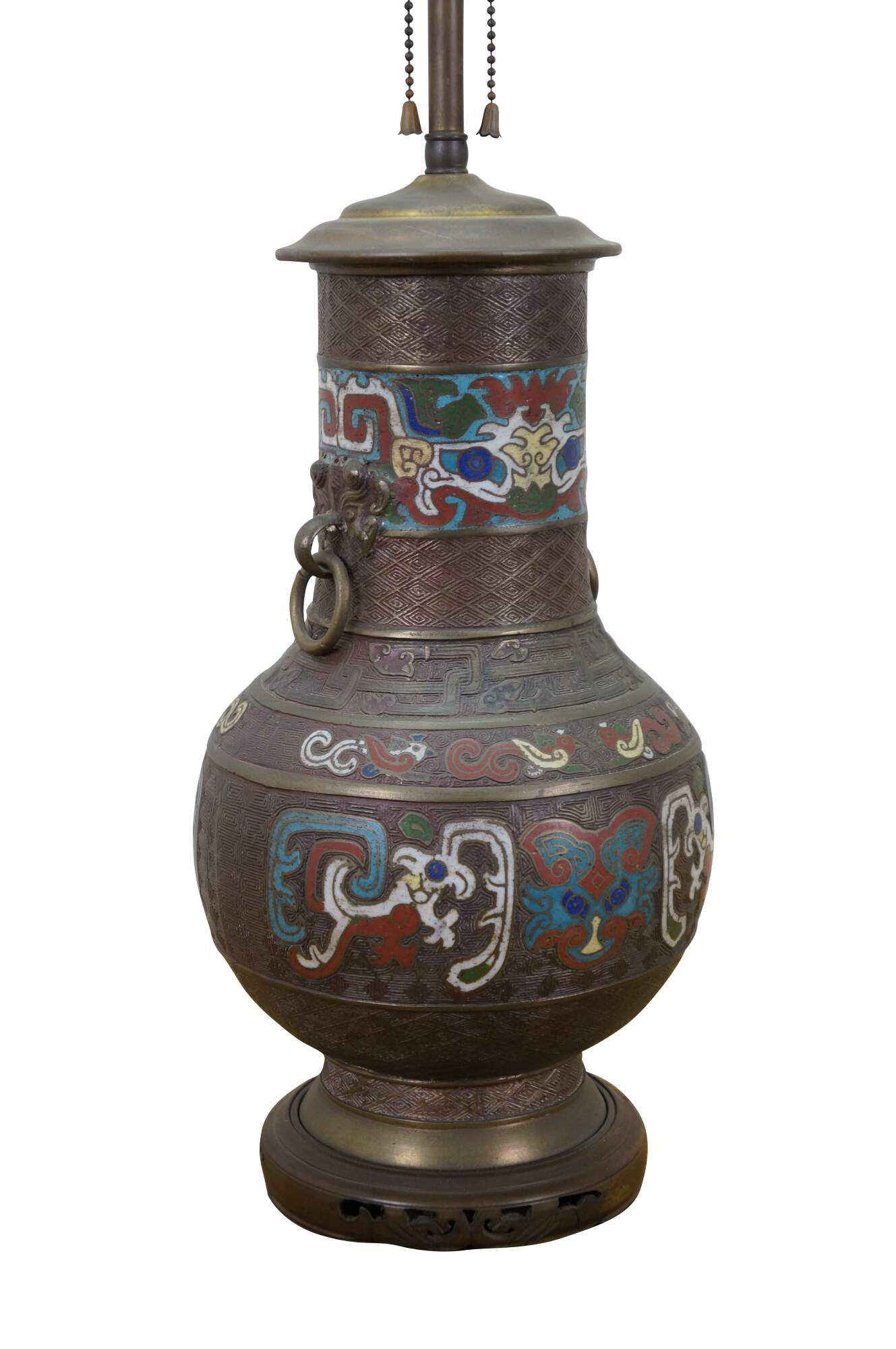 Antique Japanese enameled bronze mantel vase / urn, fitted with a two light pull chain. It features an urn with rings on either side, decorated with animal motifs in multicolored enamel. Carved wood base. Includes brass finial.