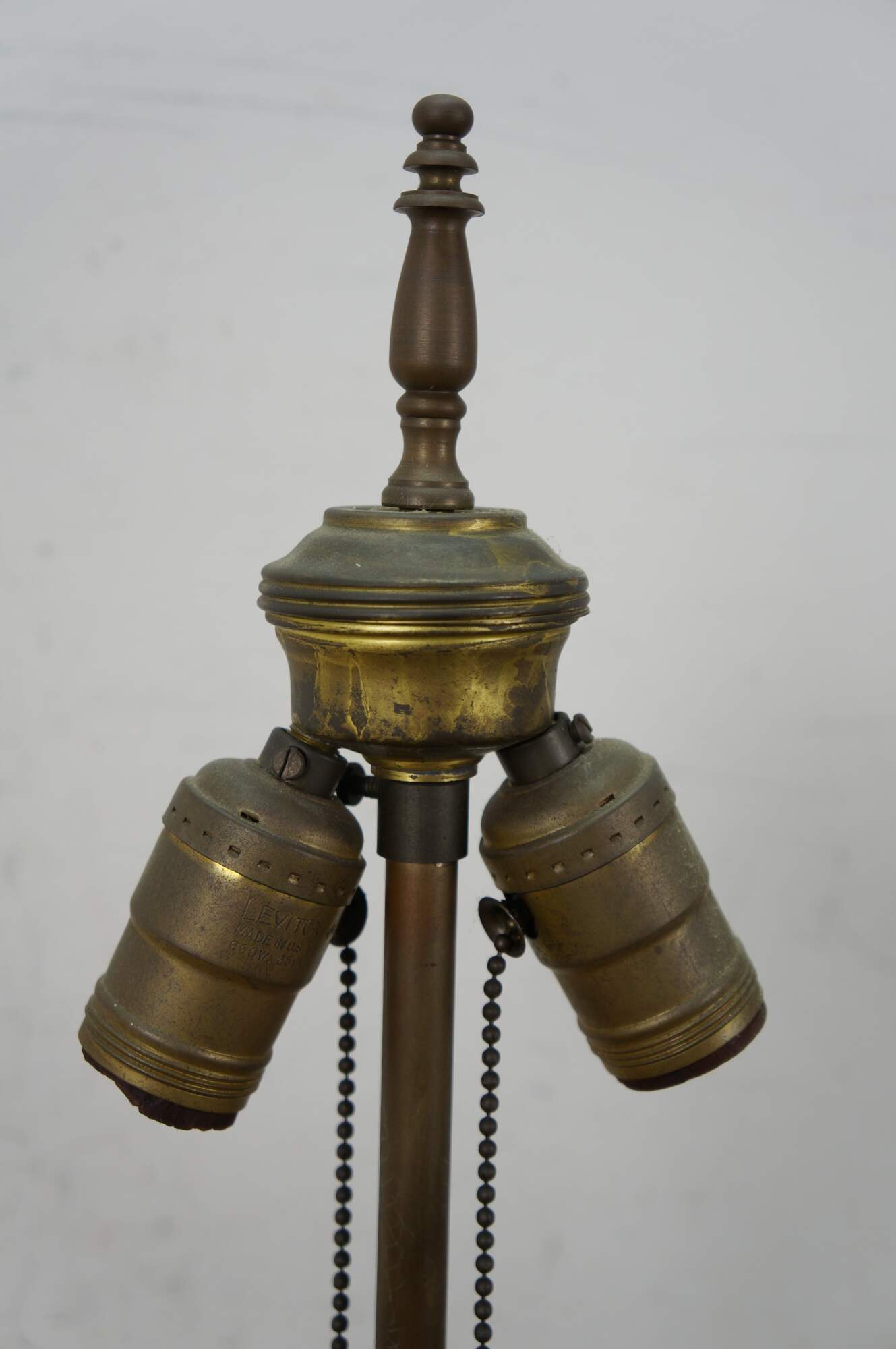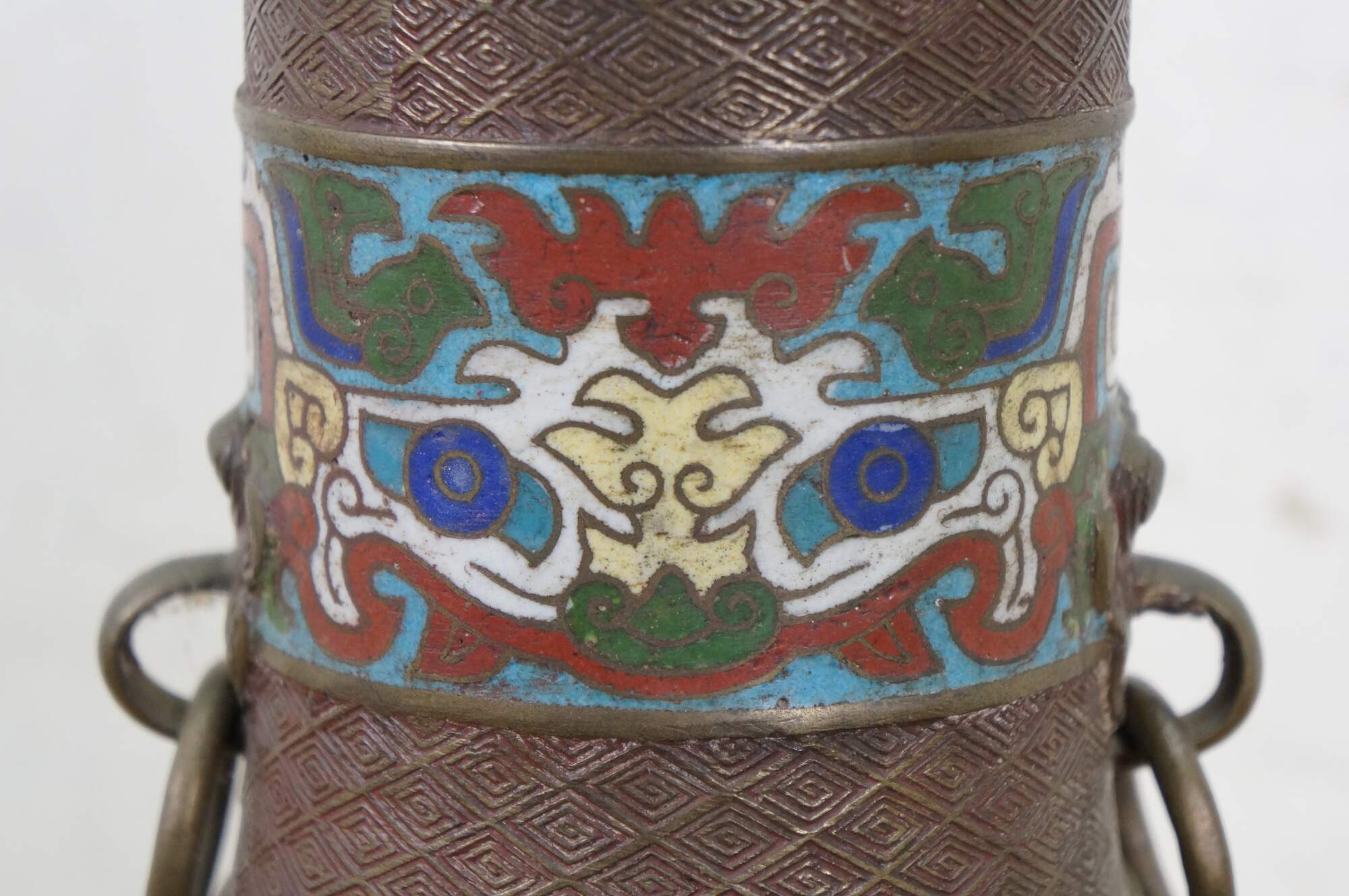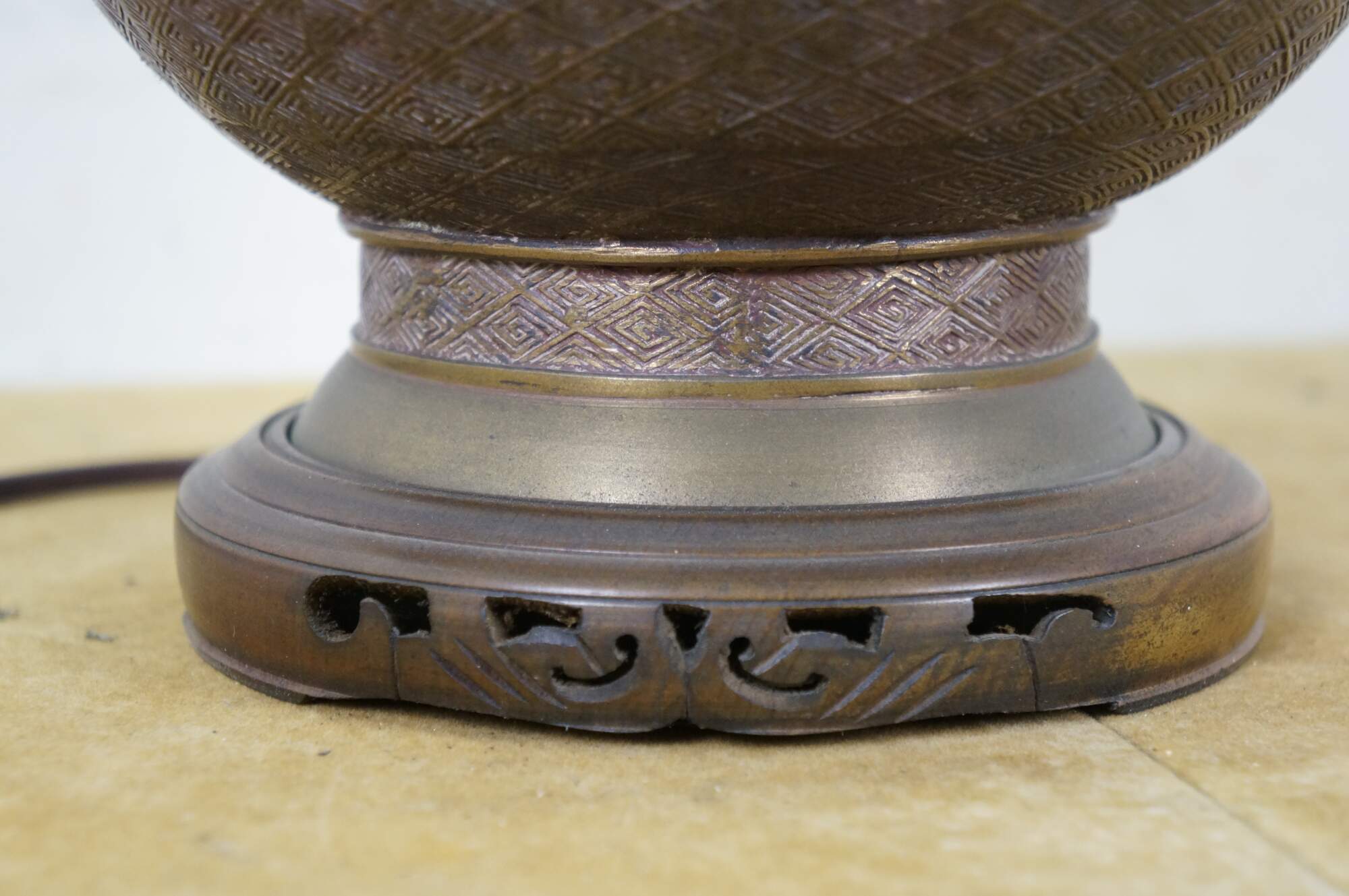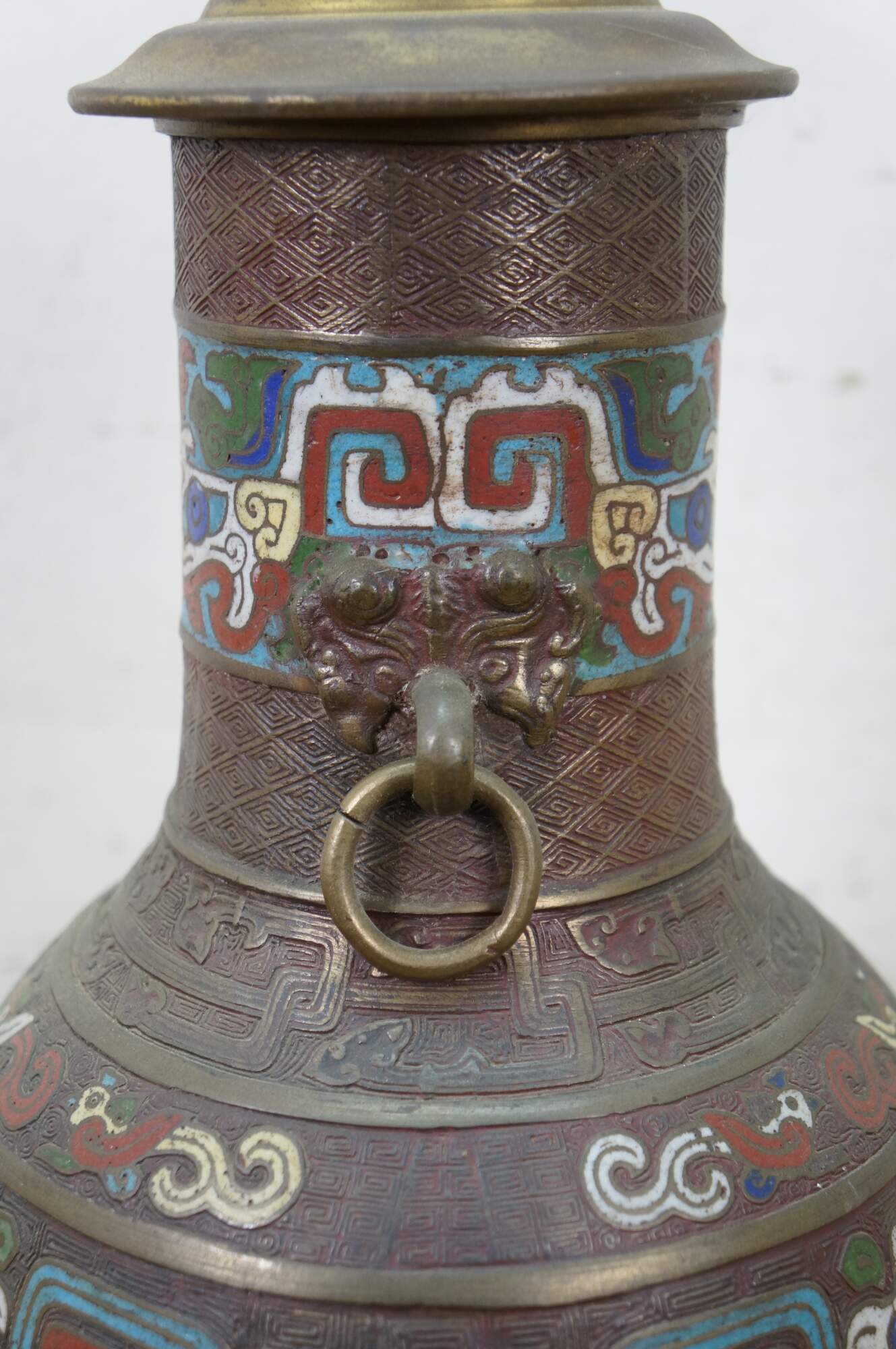 Antique Japanese enameled bronze mantel vase / urn, fitted with a two light pull chain. It features an urn with rings on either side, decorated with animal motifs in multicolored enamel. Carved wood base. Includes brass finial.