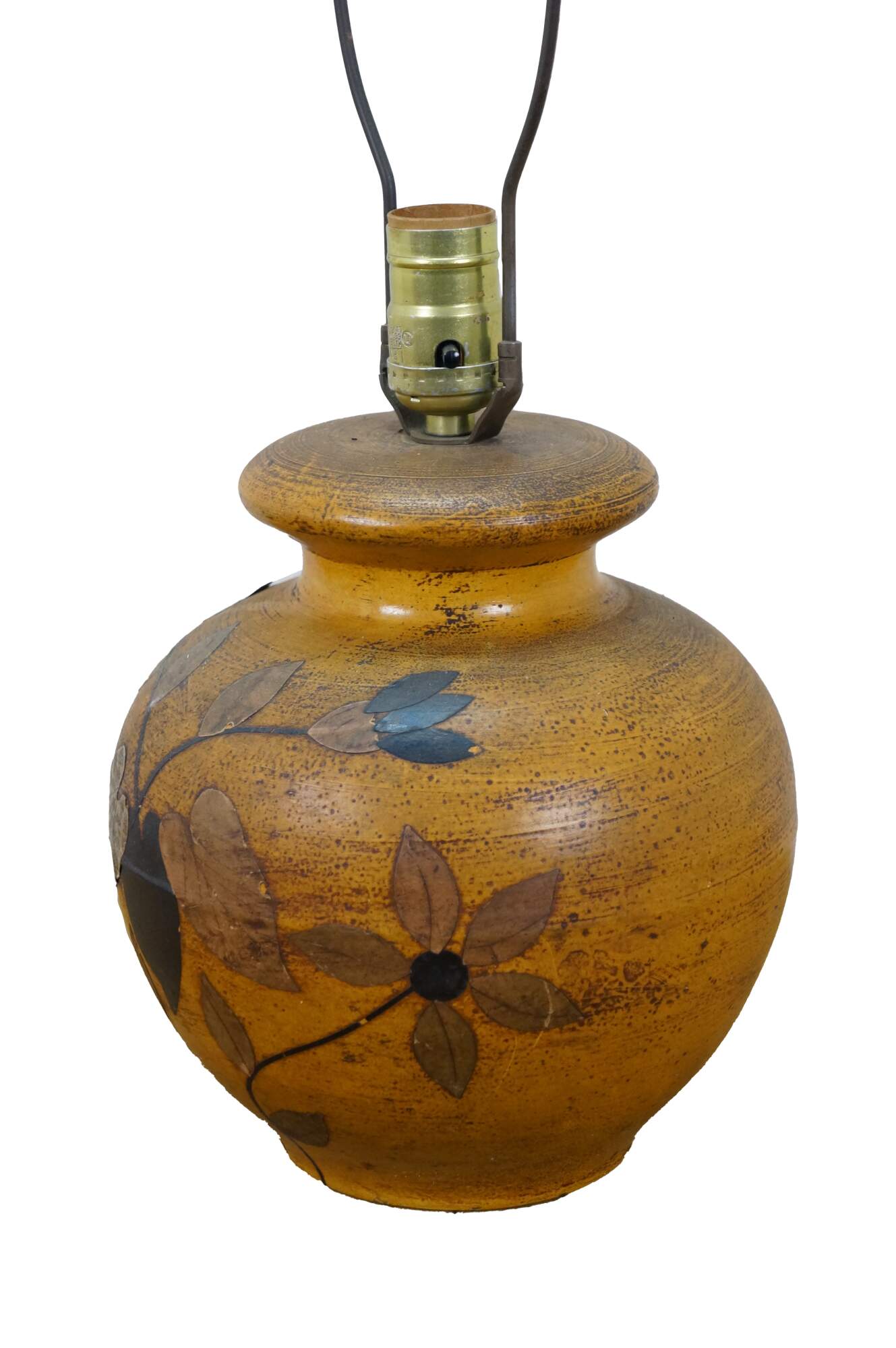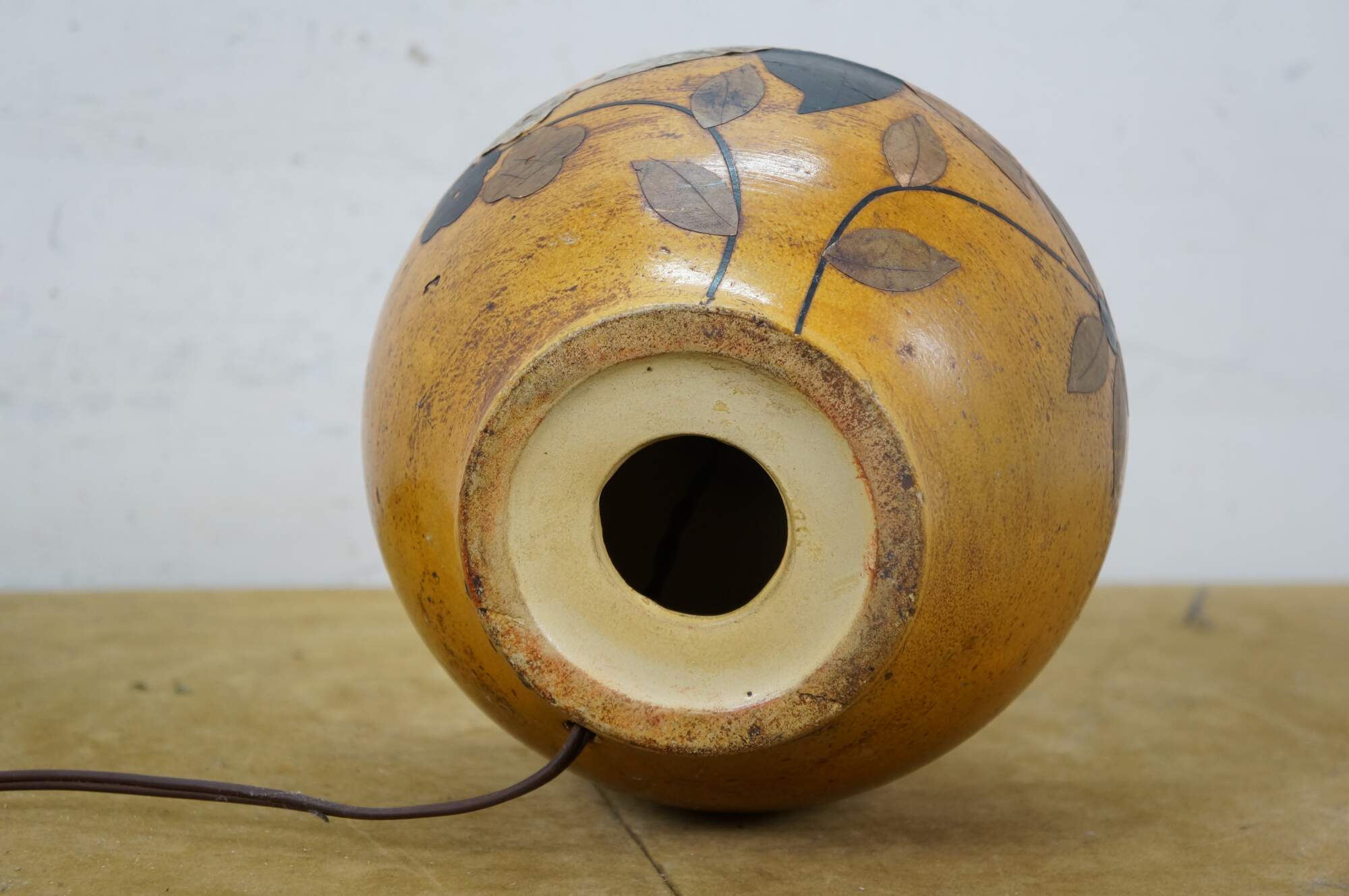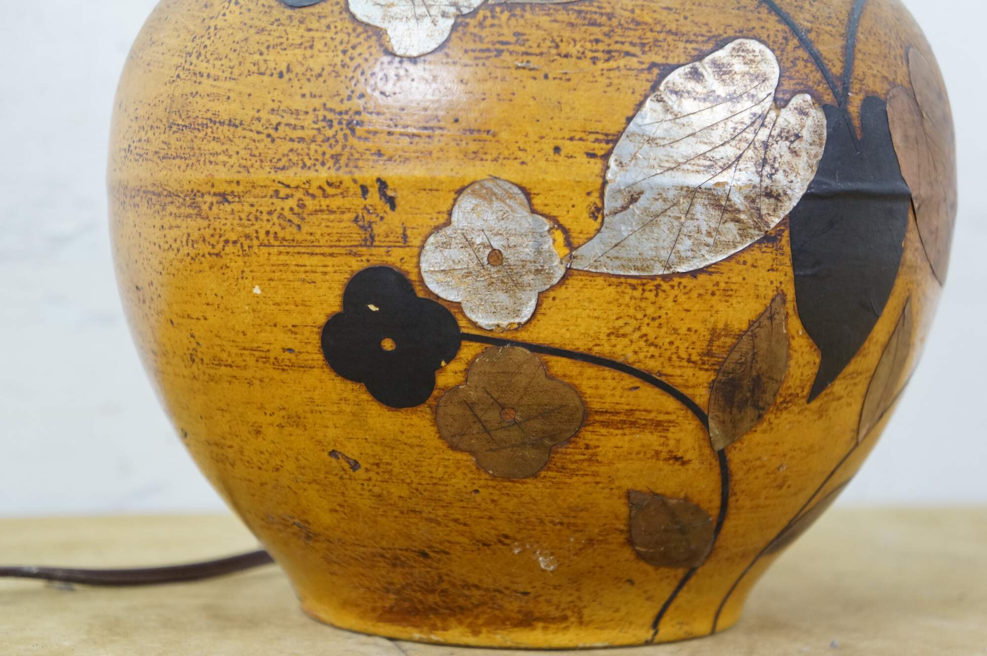 Mid to late 20th century ceramic table lamp in the shape of a round orange pot / urn, etched and decopaged in brown, black, and metallic silver with stems of flowers. Includes harp / finial.