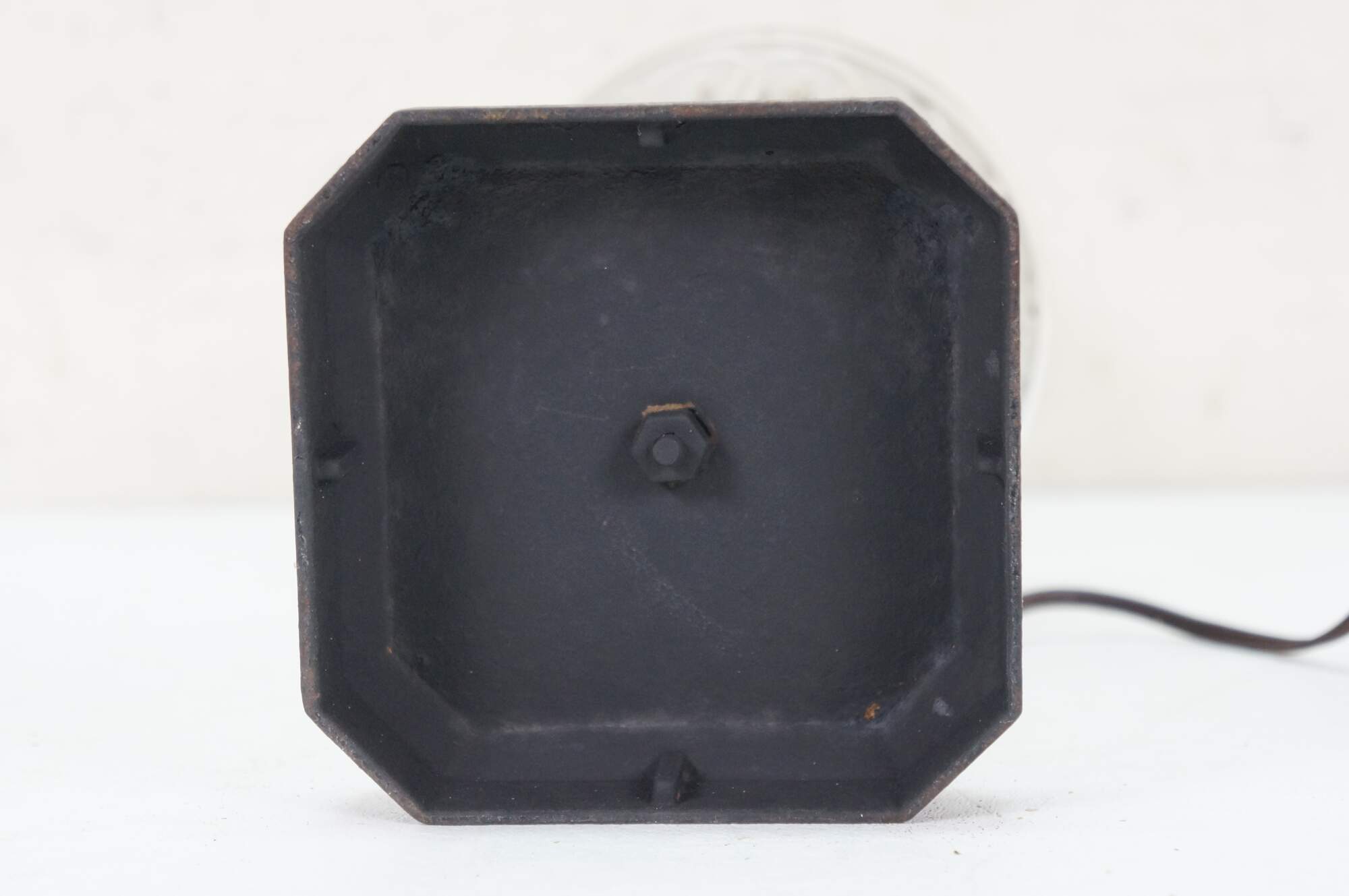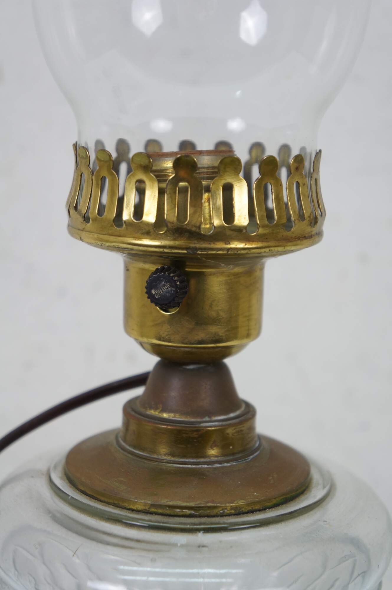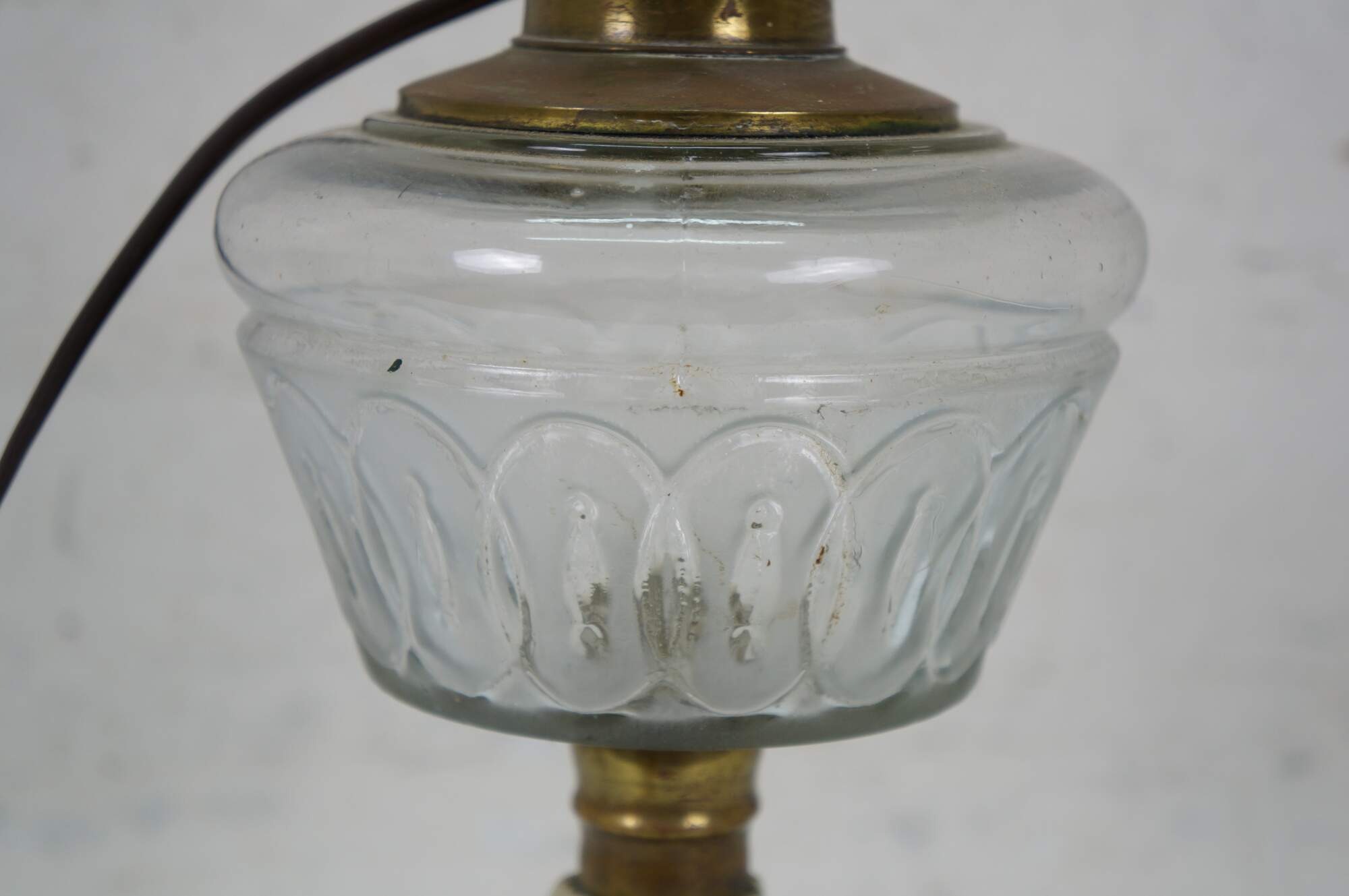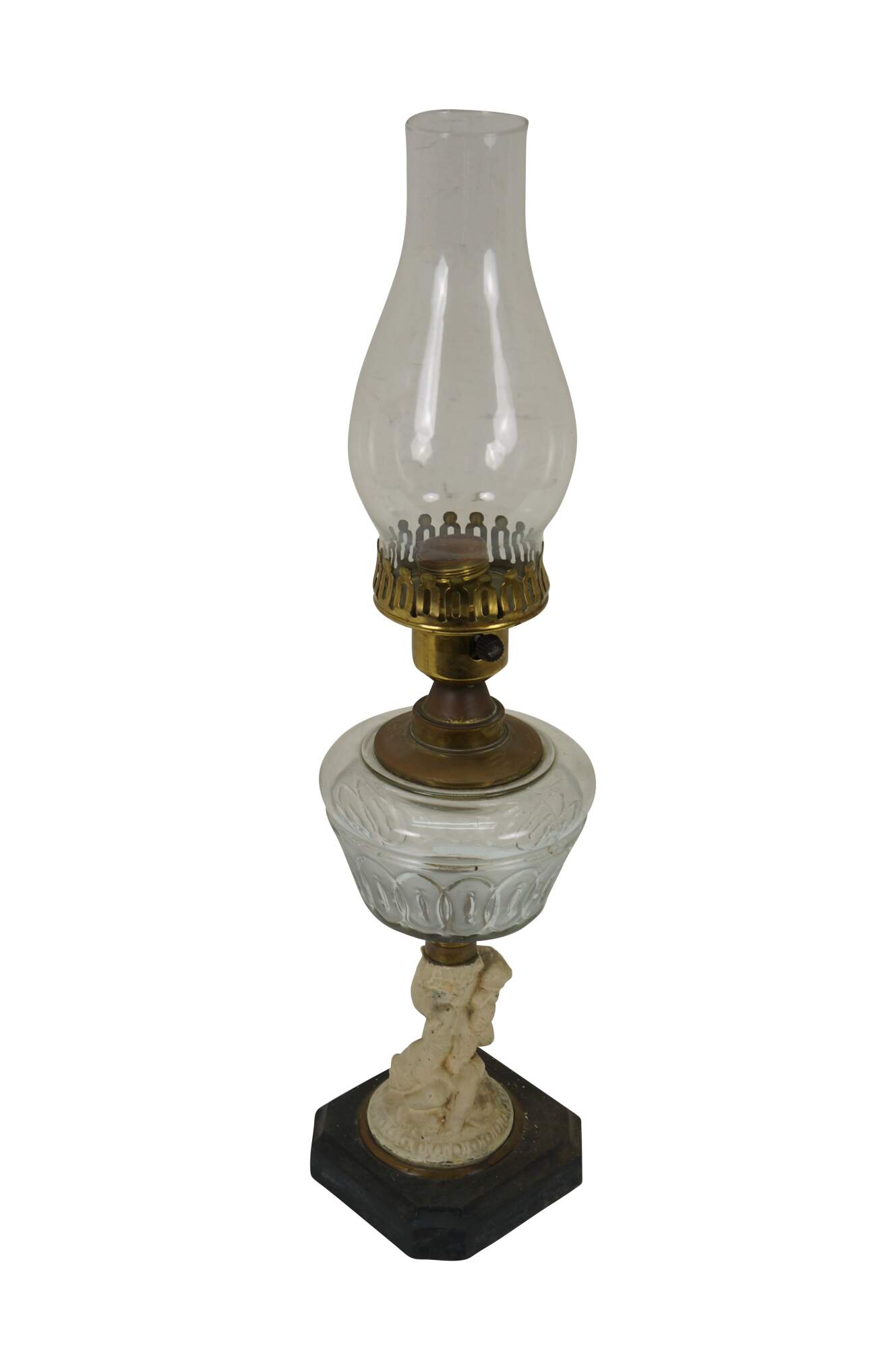 Antique converted oil lamp featuring white neoclassical figure of a child / cherub eating grapes with his dog, round brass reservoir, brass top, glass hurricane, and black painted metal base.