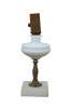 Mid to early 20th century budoir / table lamp - fluted squat bottle shaped milk glass top over a brass balustrade shaped column and a square marble base; faux candle cover on socket. Cord crumbling; needs rewiring.
