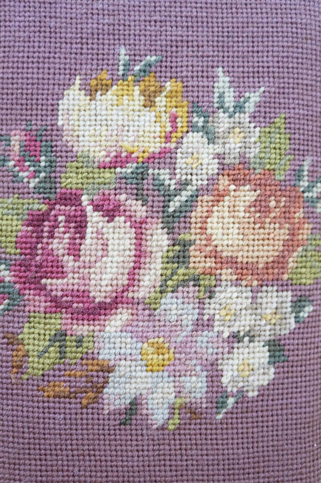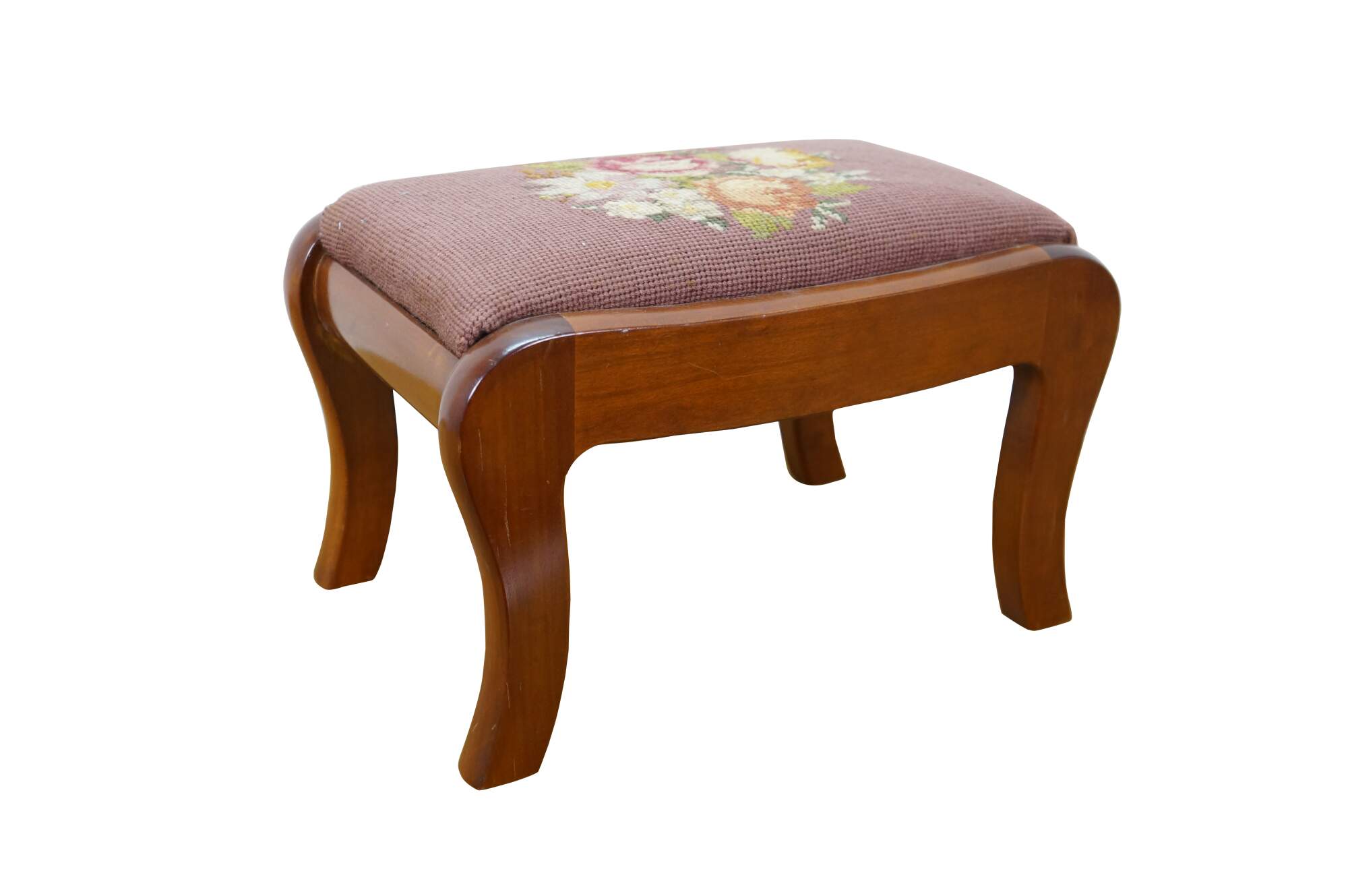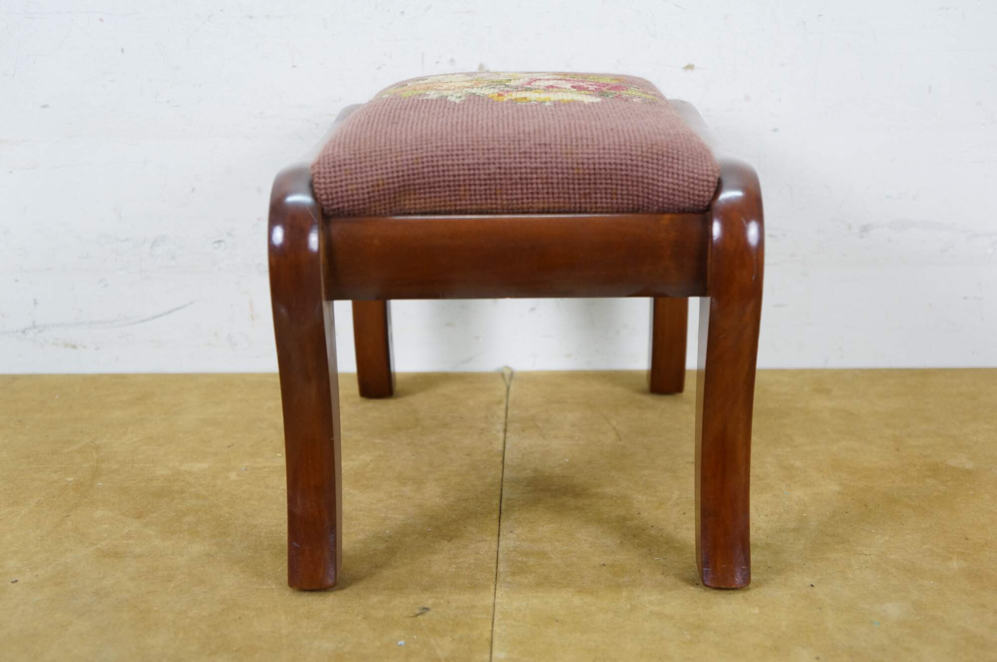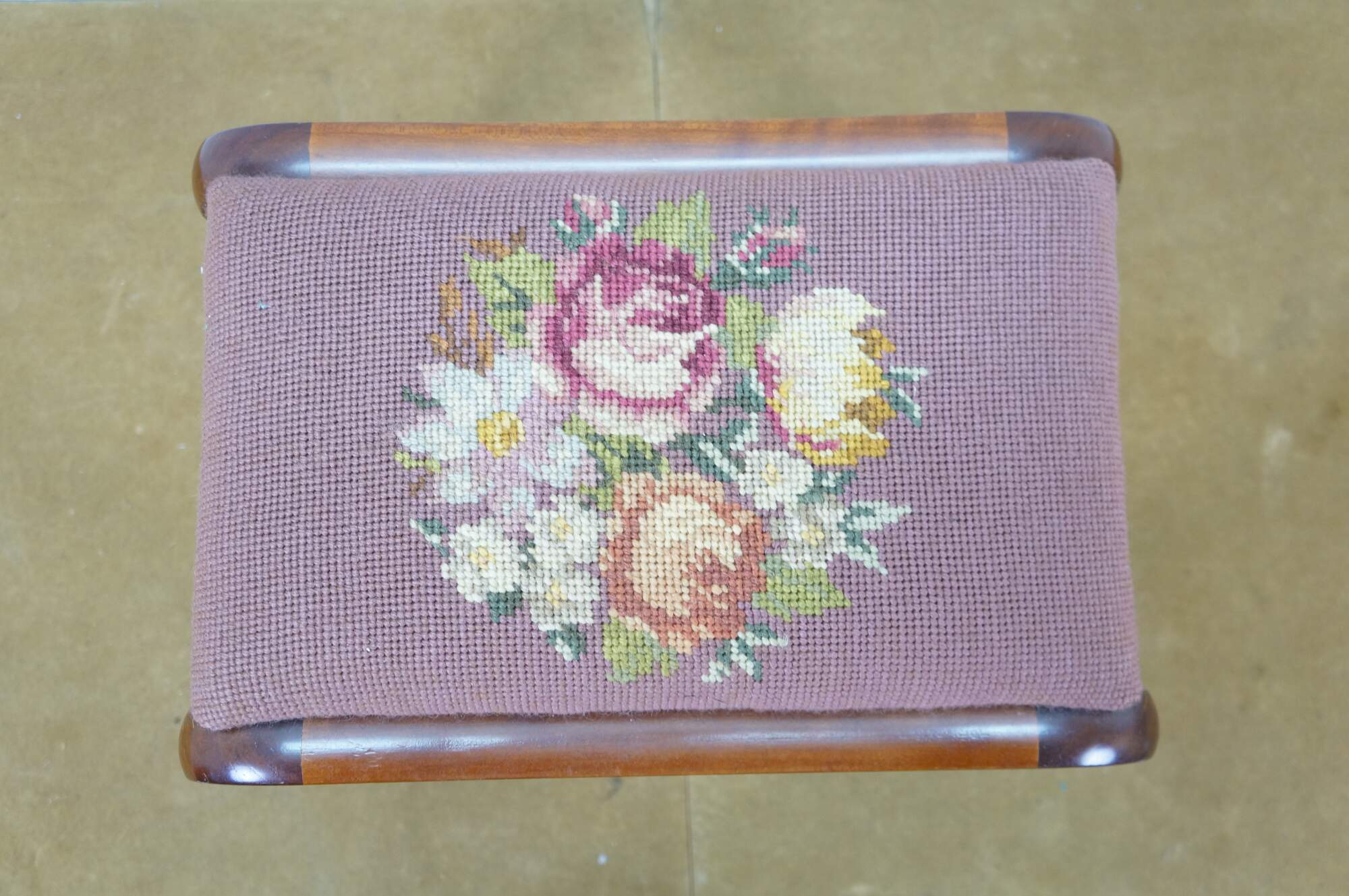 Mid 20th century wooden sabre leg footstool with floral needlepoint top. Rectangular shape with four legs, top embroidered in mauve with a central cluster of flowers. Marked on base: Made by Paul A. Runyon 1959.