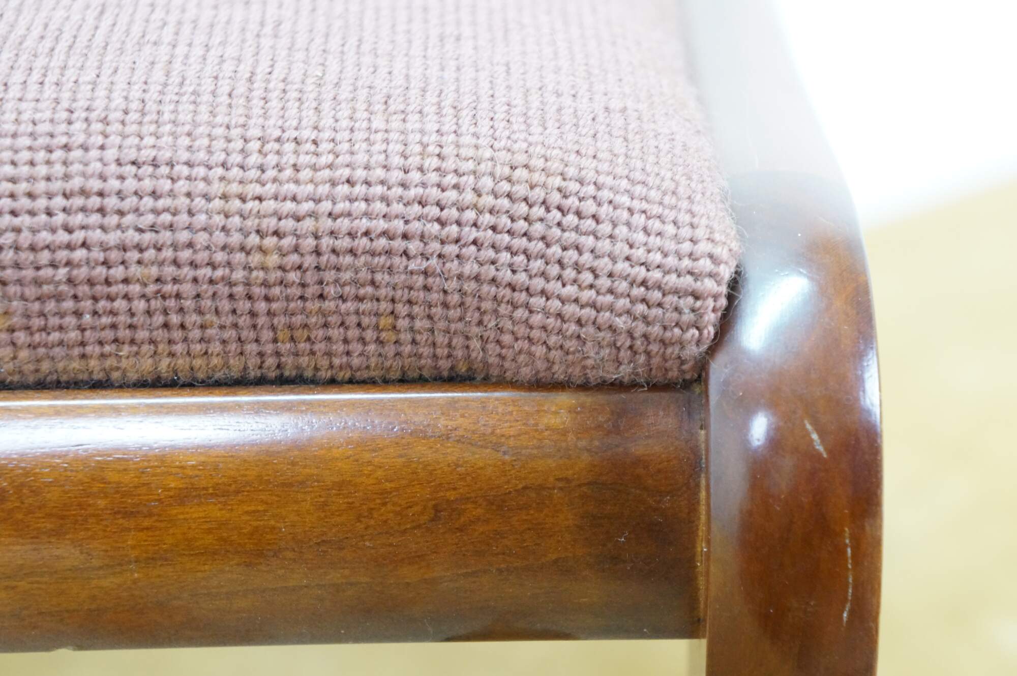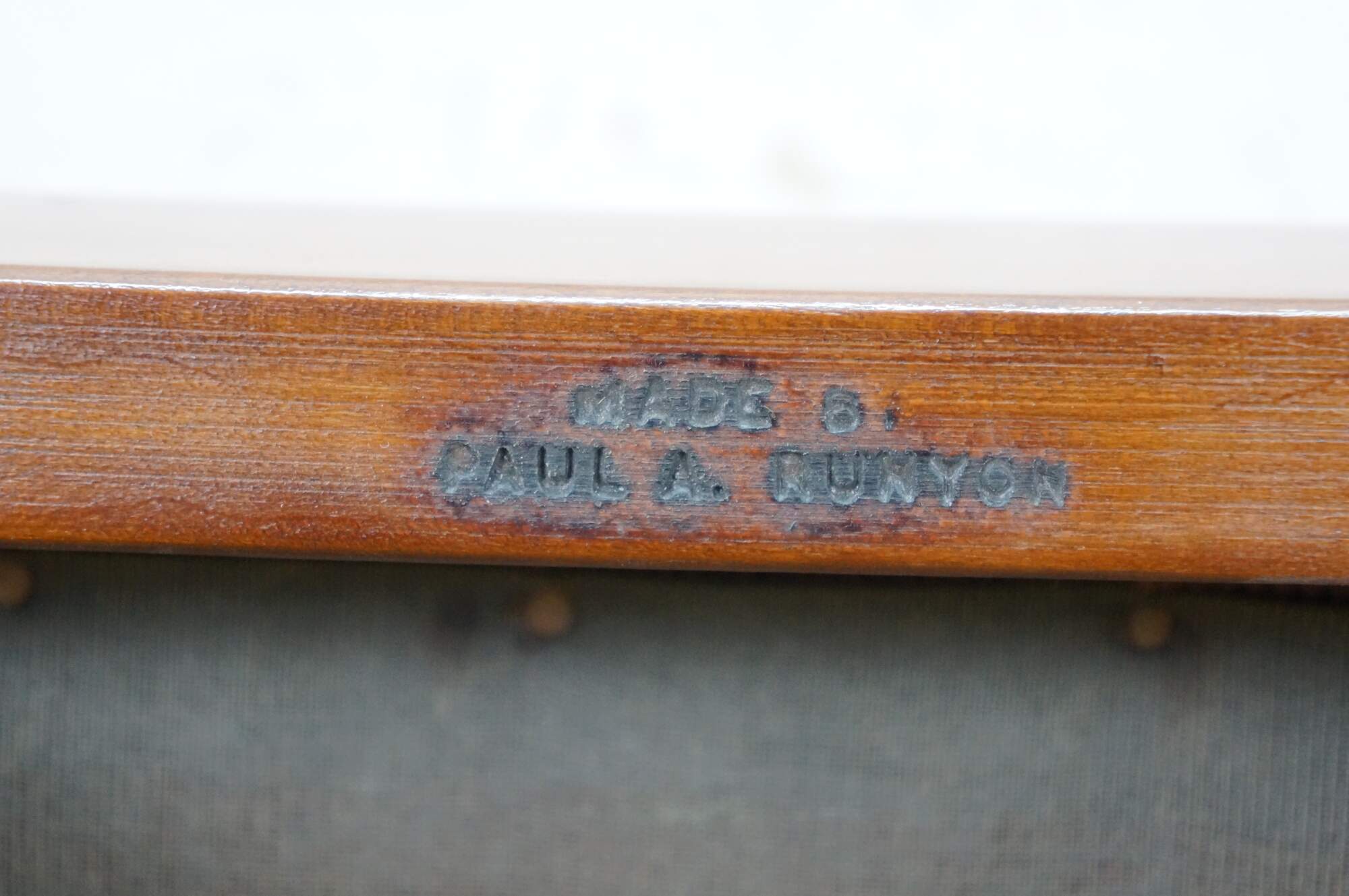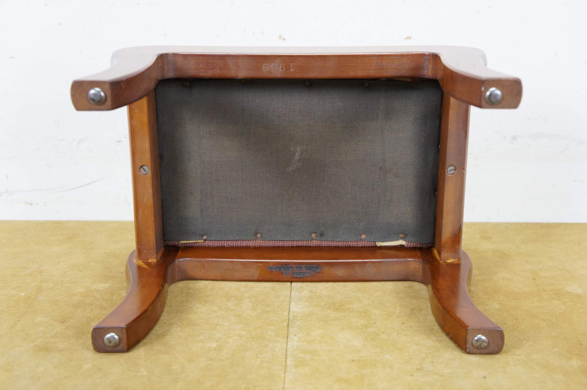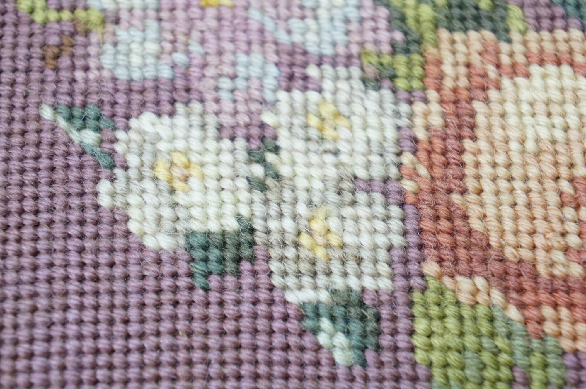 Mid 20th century wooden sabre leg footstool with floral needlepoint top. Rectangular shape with four legs, top embroidered in mauve with a central cluster of flowers. Marked on base: Made by Paul A. Runyon 1959.