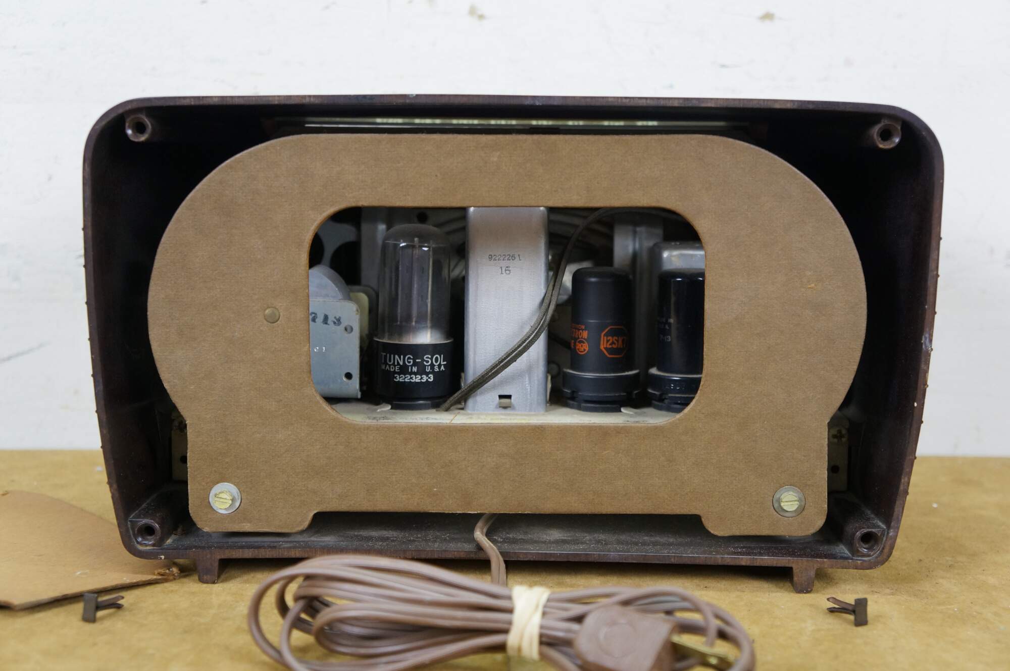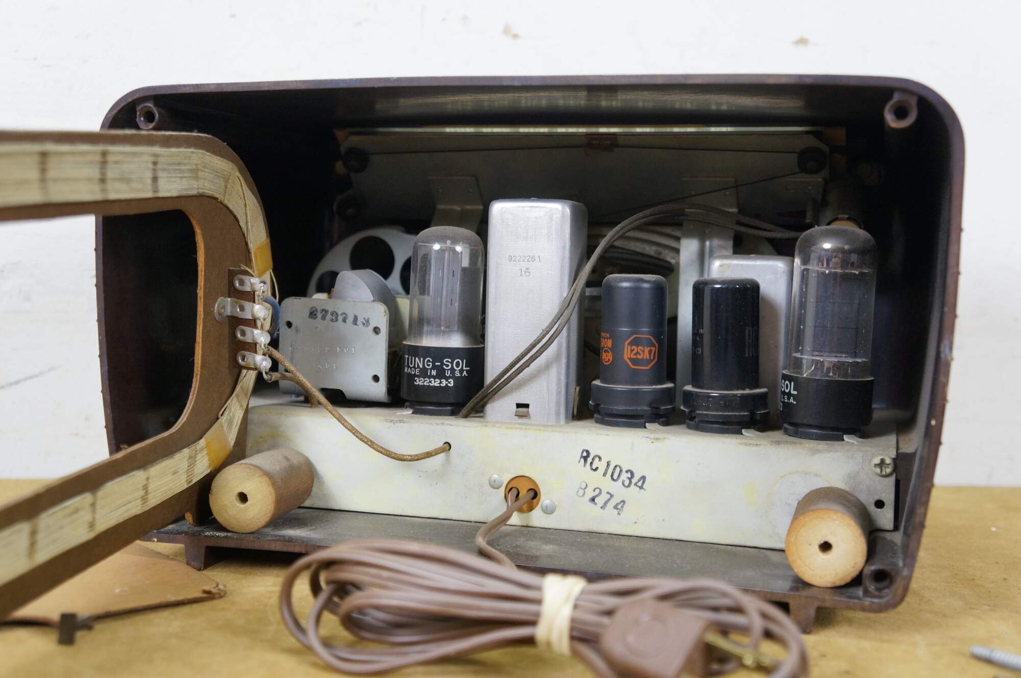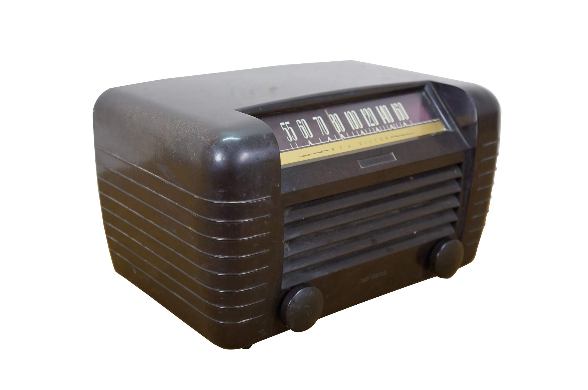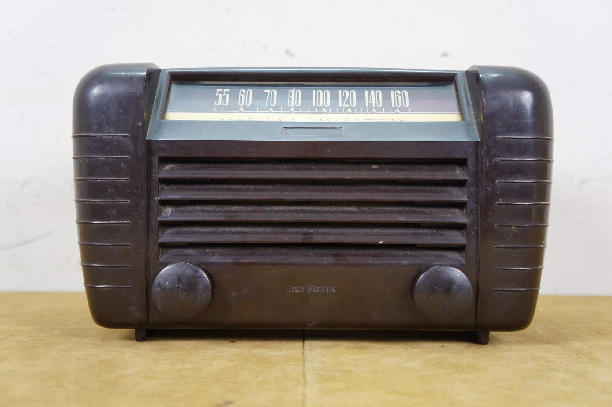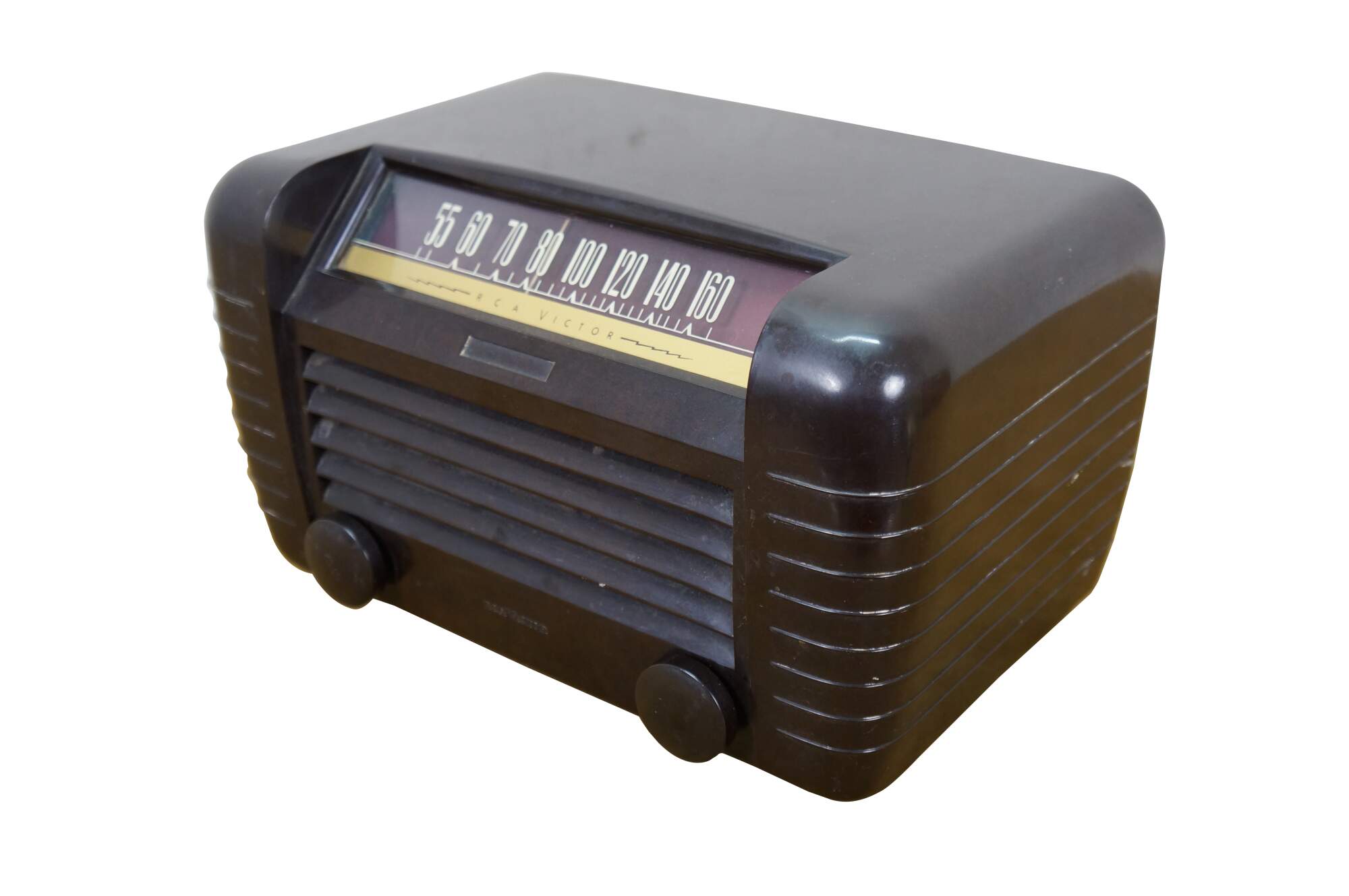 Circa 1940's RCA Victor brown bakelite radio. Model 65X1 - Superheterodyne - Range: 540-1600 Kilocycles - Serial No. B091816 - AC/DC 105-125 volts, 50/60 or DC Cycles, 30 watts - Radio Corporation of America, Camden, NJ, USA. Made in USA.