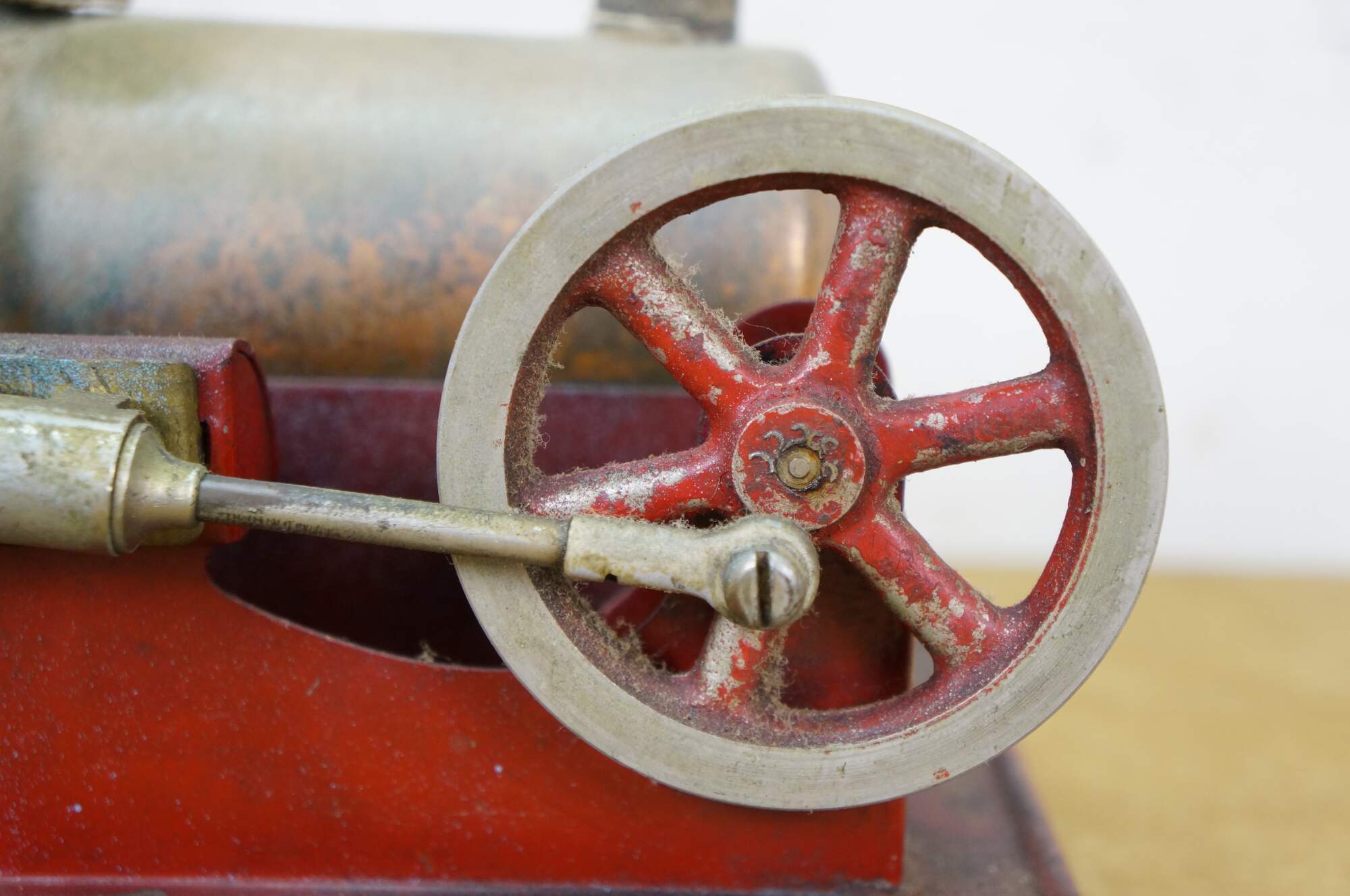 Vintage Empire Model 90 miniature steam engine / boiler. Red painted metal base and copper tank. No power cord - untested. Empire / The Metalware Corp / Two Rivers, Wis. / Made in USA / Do Not Immerse in Water / 115 Volts / 90 / 350 Watts.