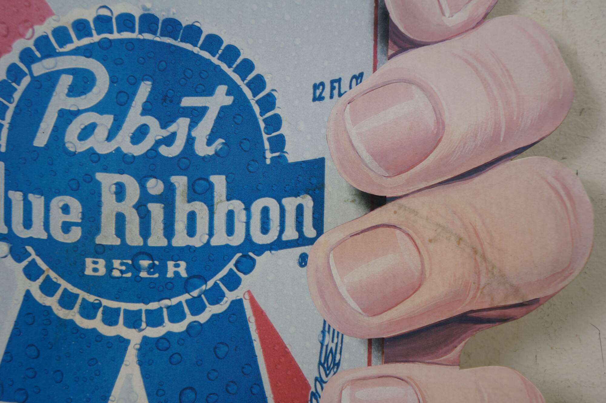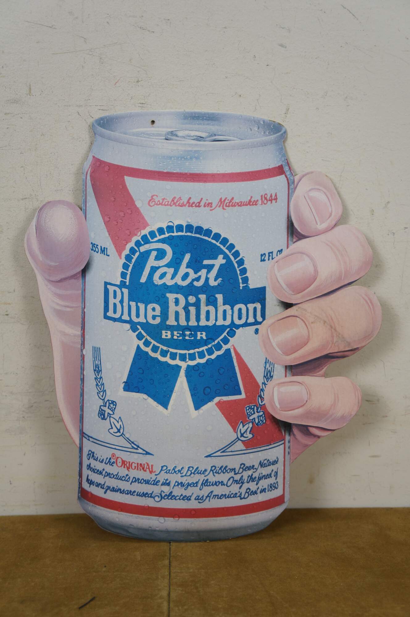 Vintage late 20th century cardboard hanging bar sign advertising Pabst Blue Ribbon Beer. Features a hand clasping a can of PBR. Hole for string in top edge.