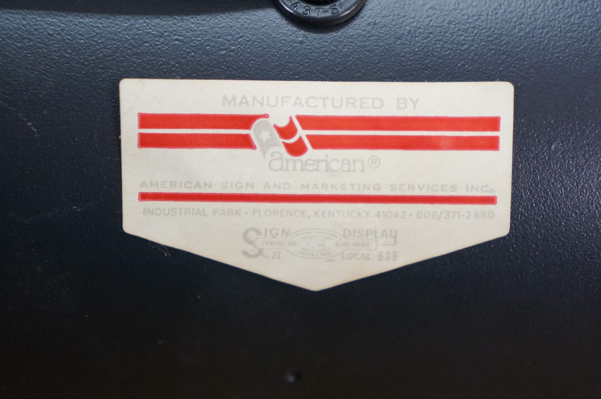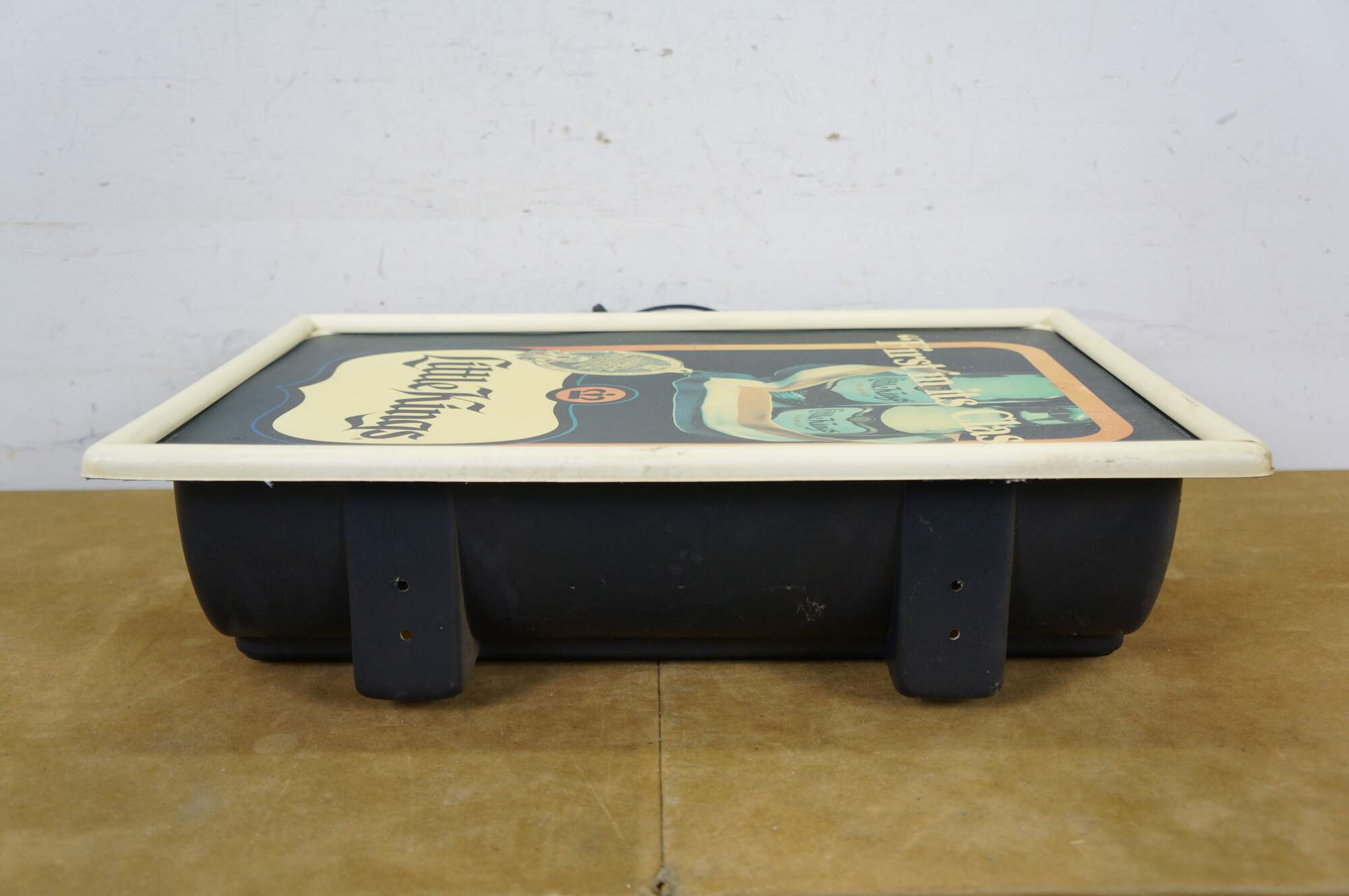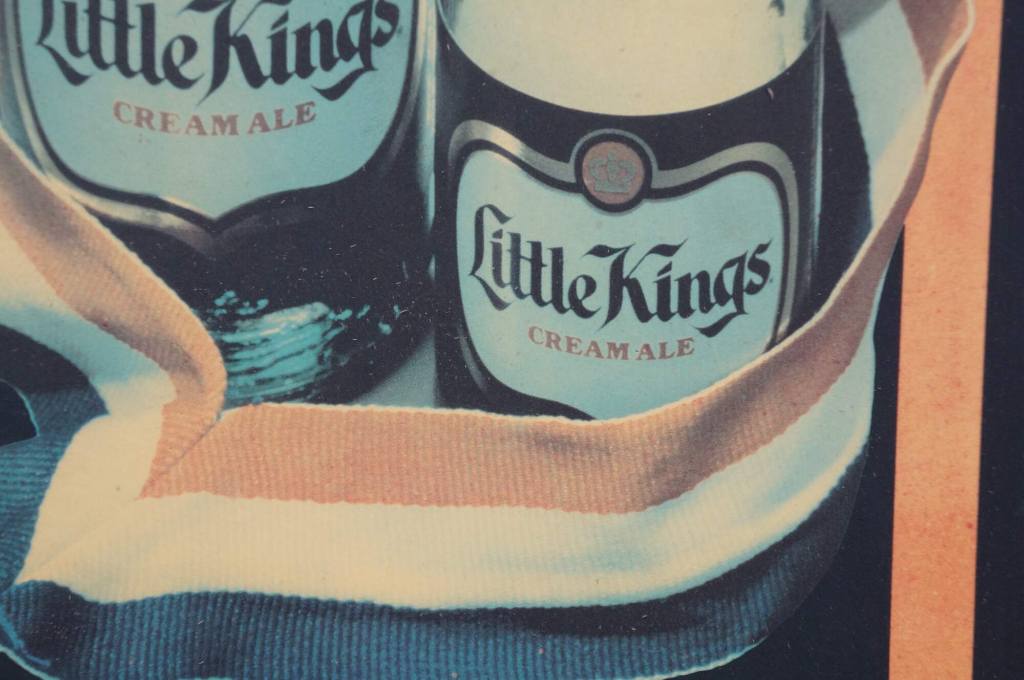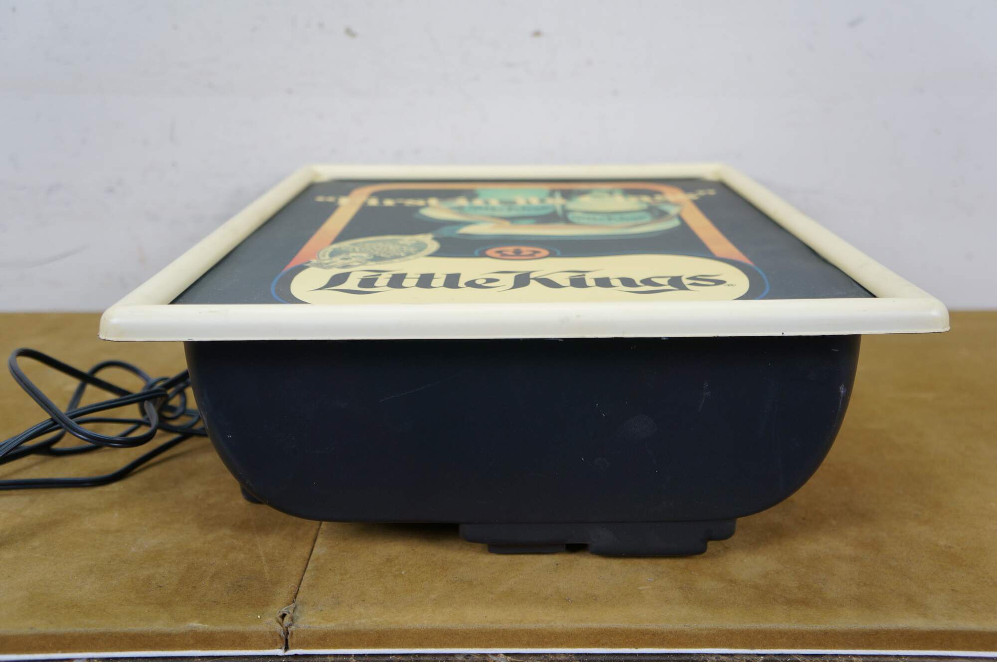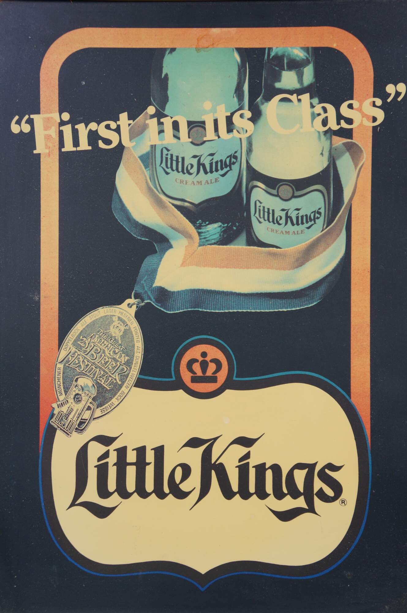 Vintage late 20th century molded plastic illuminated / light up bar sign advertising Little Kngs Cream Ale. Black background with white frame, printed with a pair of Little Kings Cream Ale bottles wrapped in a prize ribbon , superimposed with the phrase "First In Its Class," over the Little Kings label. The Great American Beer Festival. Schoenling Brewing Company, Cincinnati, Ohio. Manufactured by American Sign and Marketing Services Inc, Florence, KY.