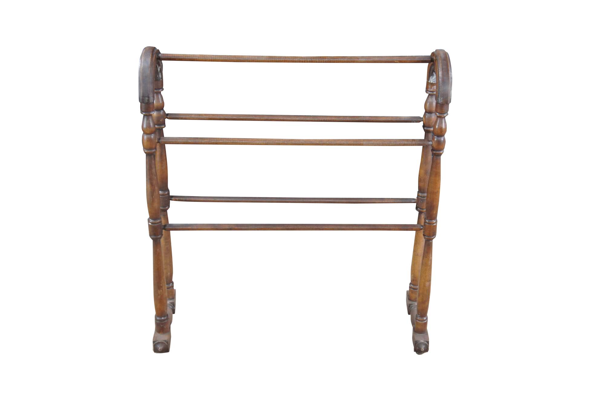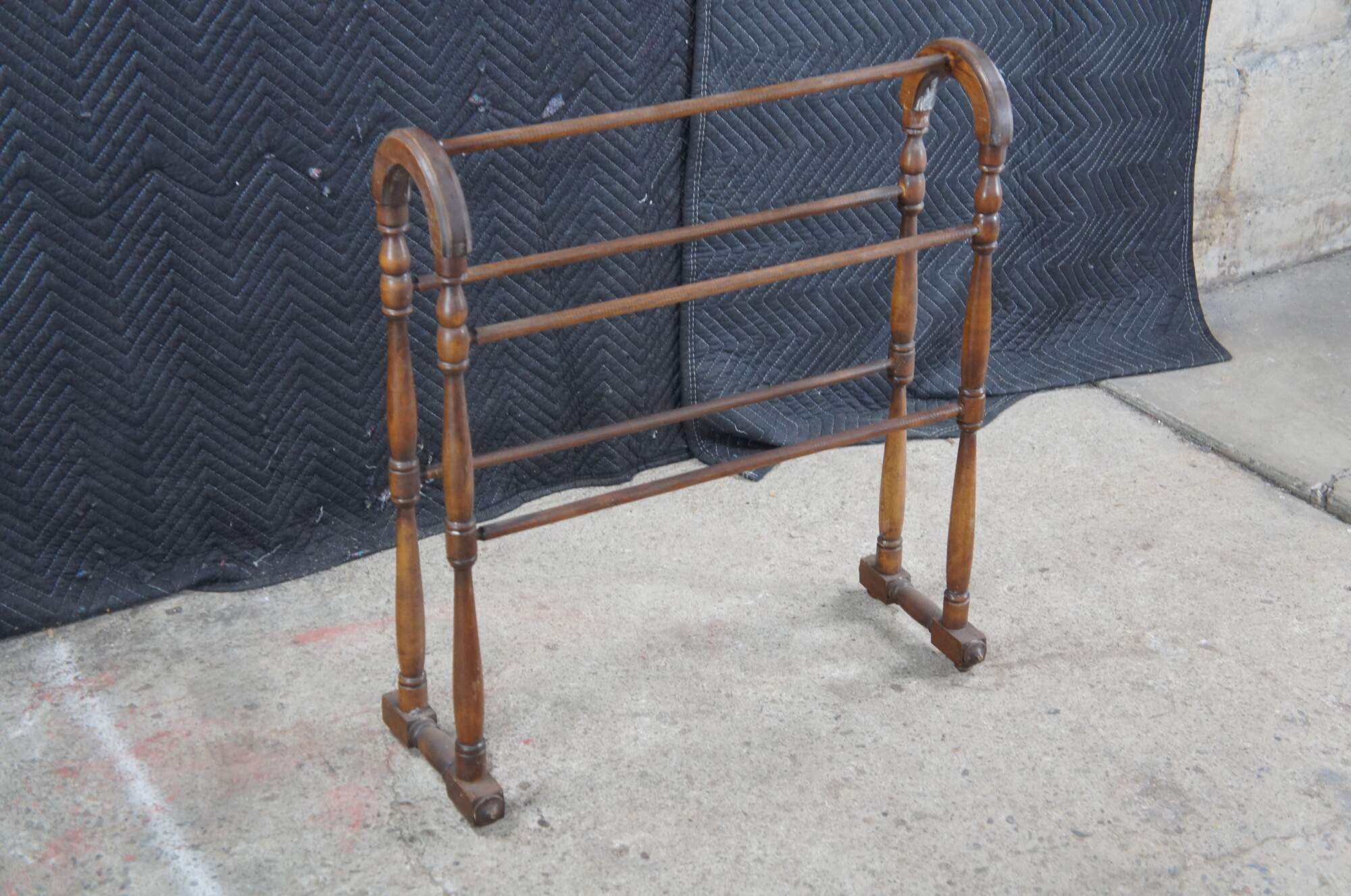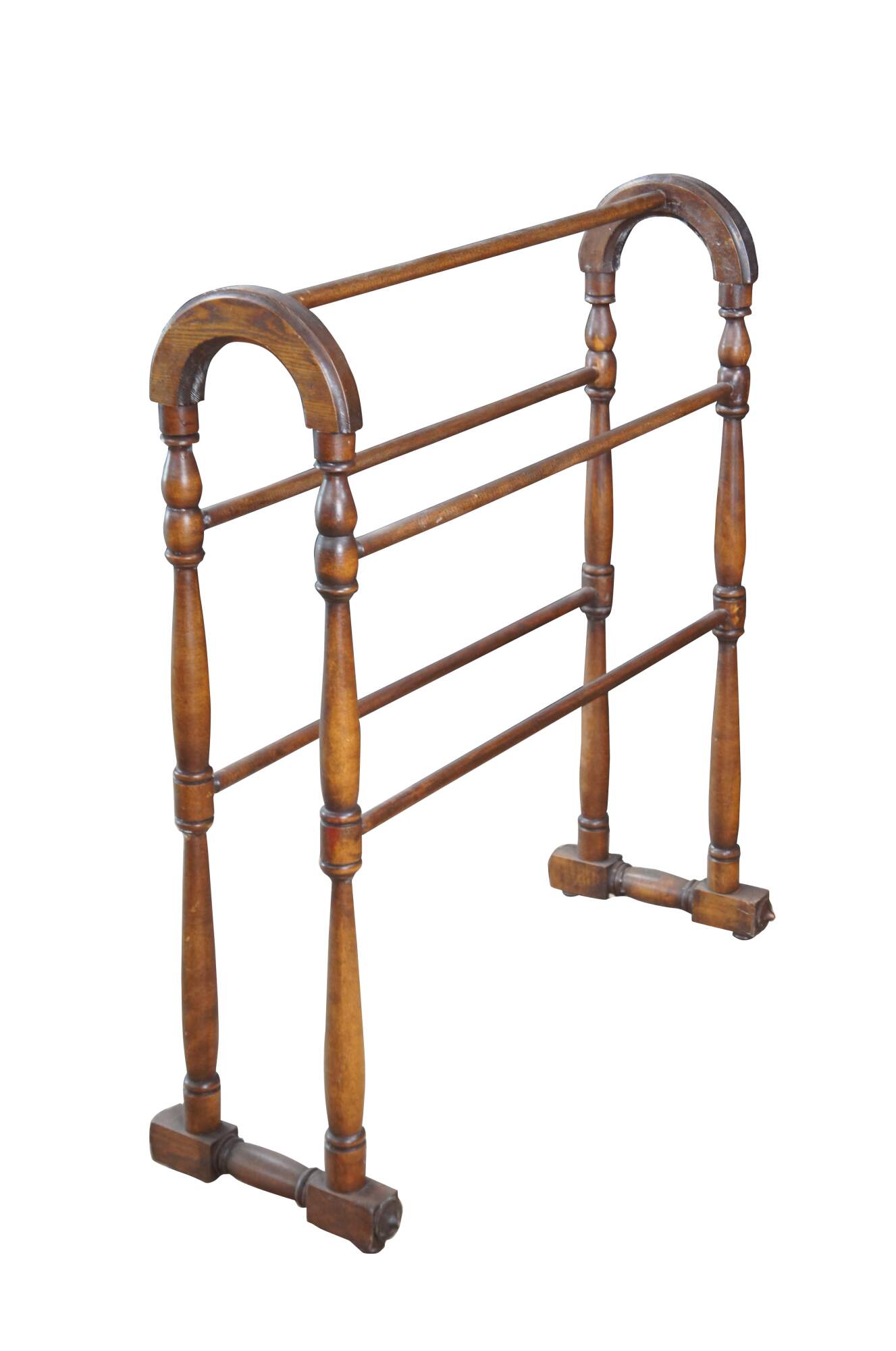 20th Century Early American Style Towel, Quilt or Blanket Rack. Made from oak with an arched top and turned detail.