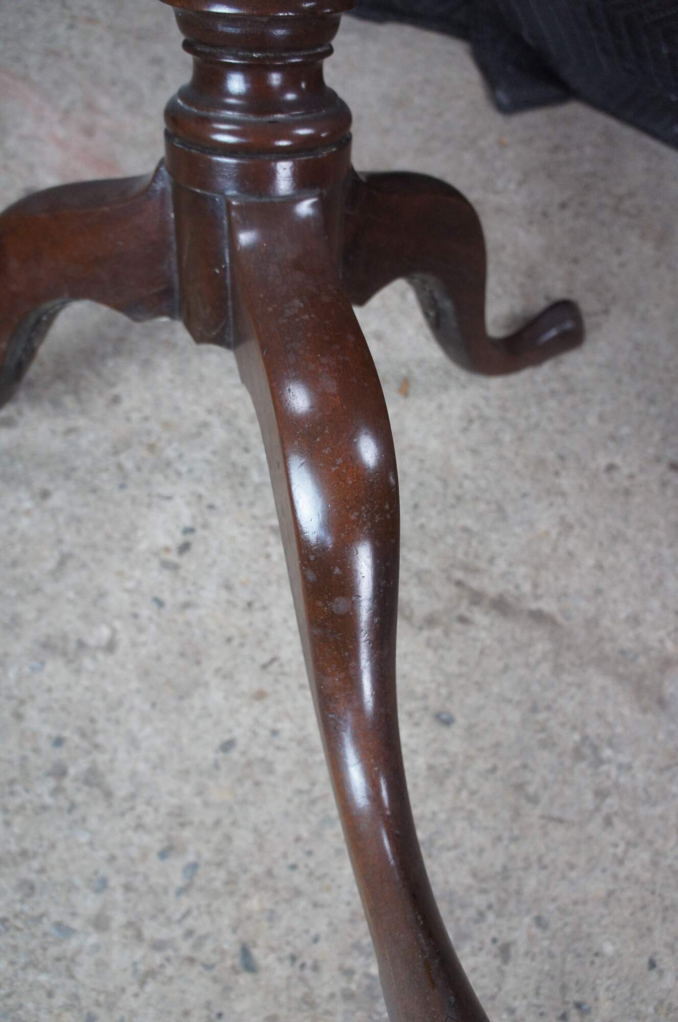 Good Antique Condition; General wear from use and age. Finish wear and marking to the table top. Past split between tripod legs. Structurally Solid