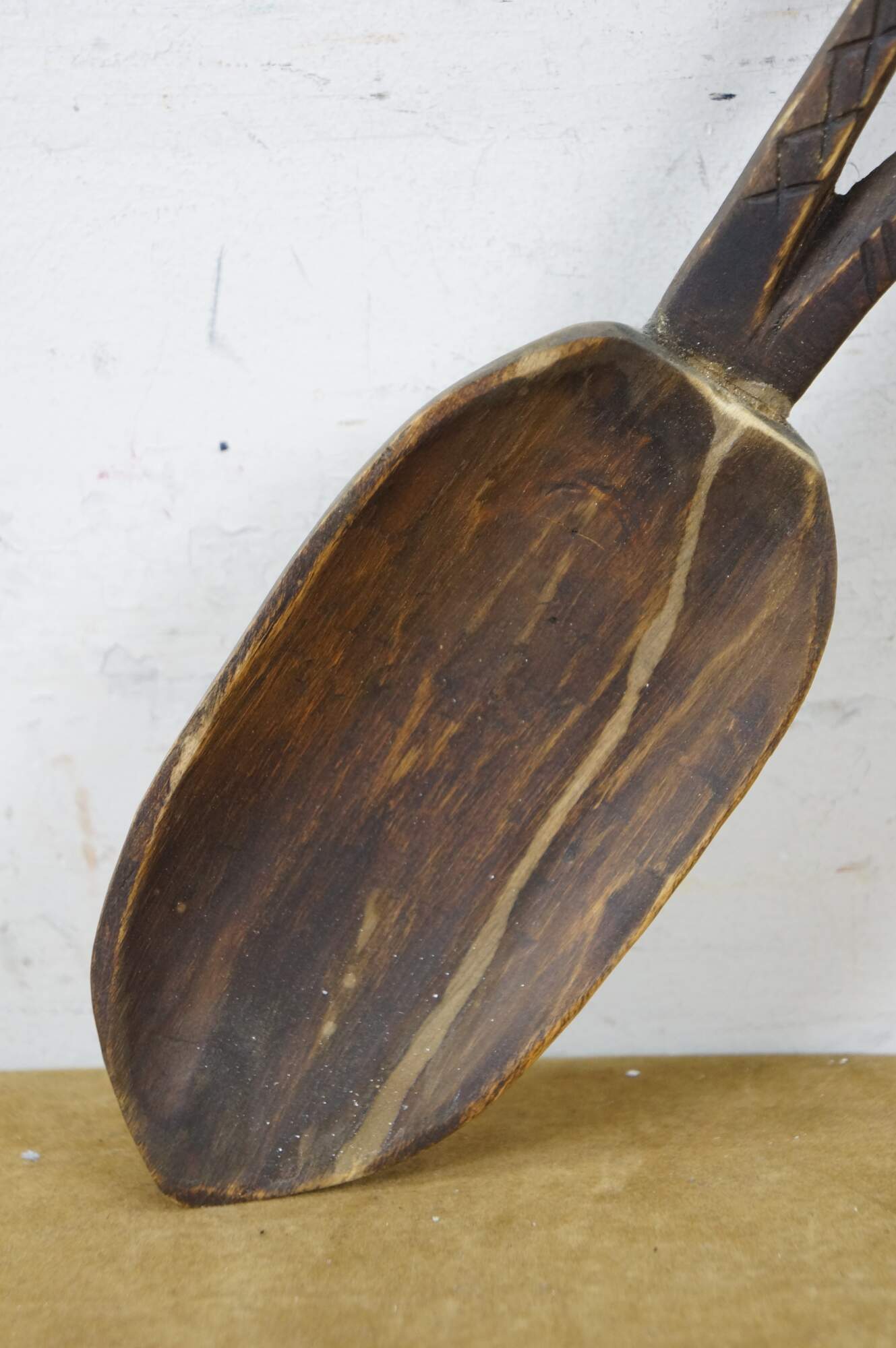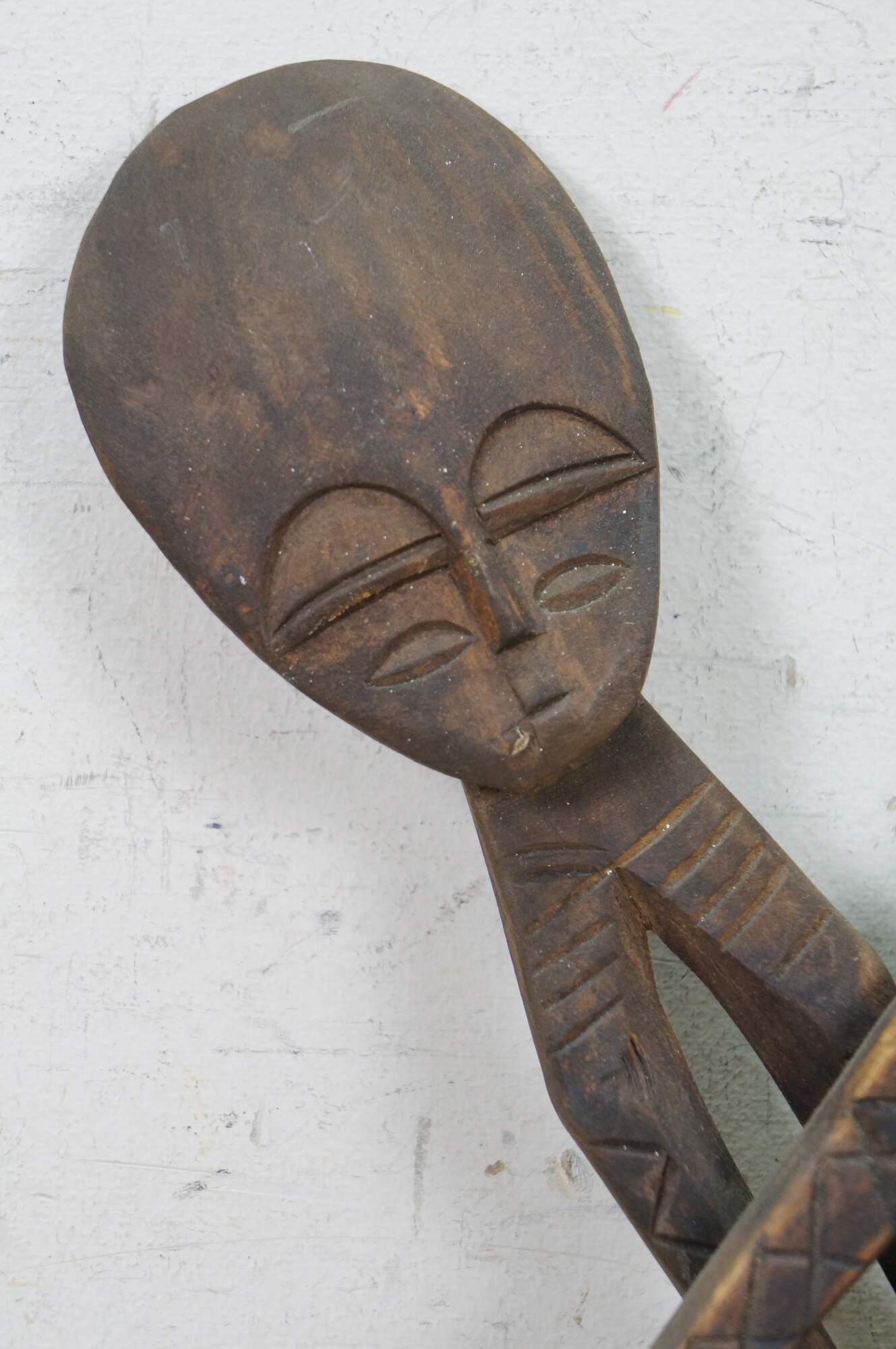 Vintage pair of wooden African serving spoons, hand carved with large bowls, pierced, textured handles and topped with ovular mask-like folk art style faces. Fastened together in an X shape, plua an eye hook for display on a wall.
