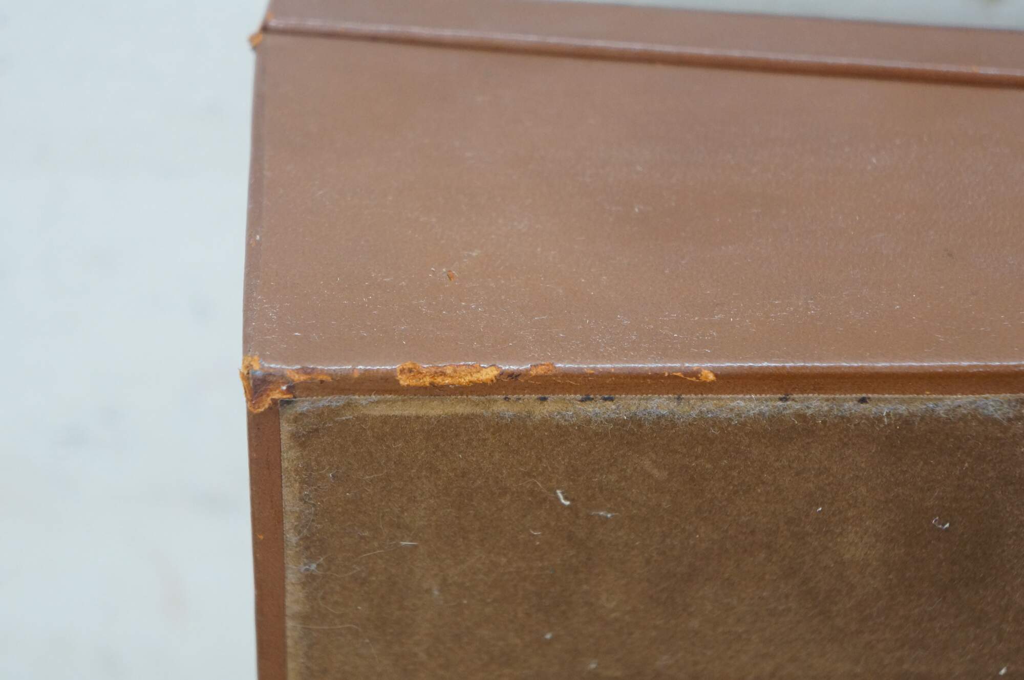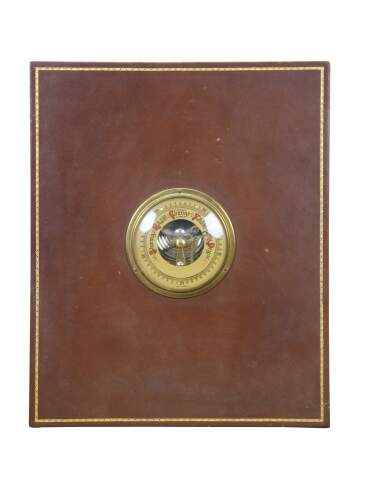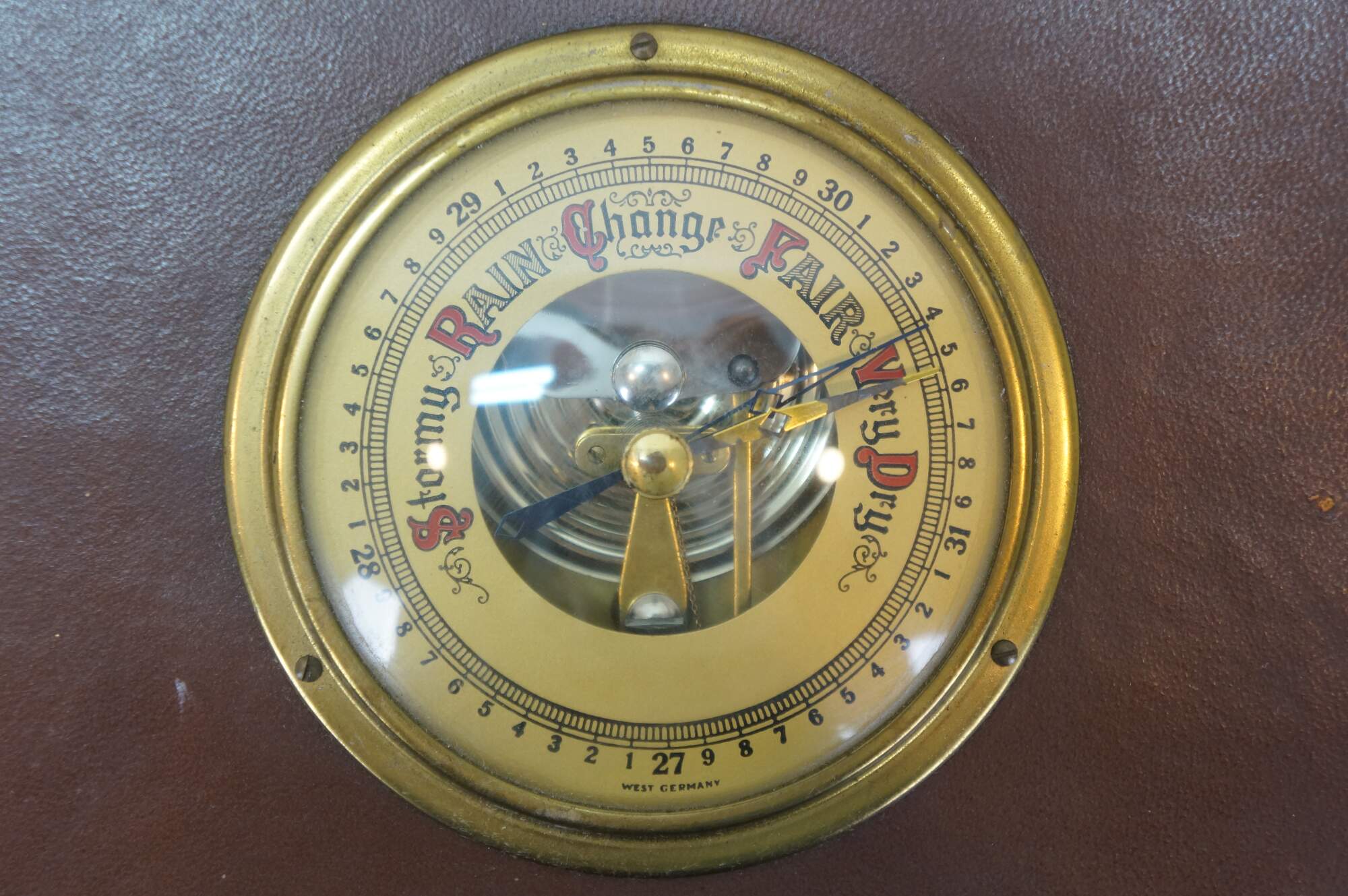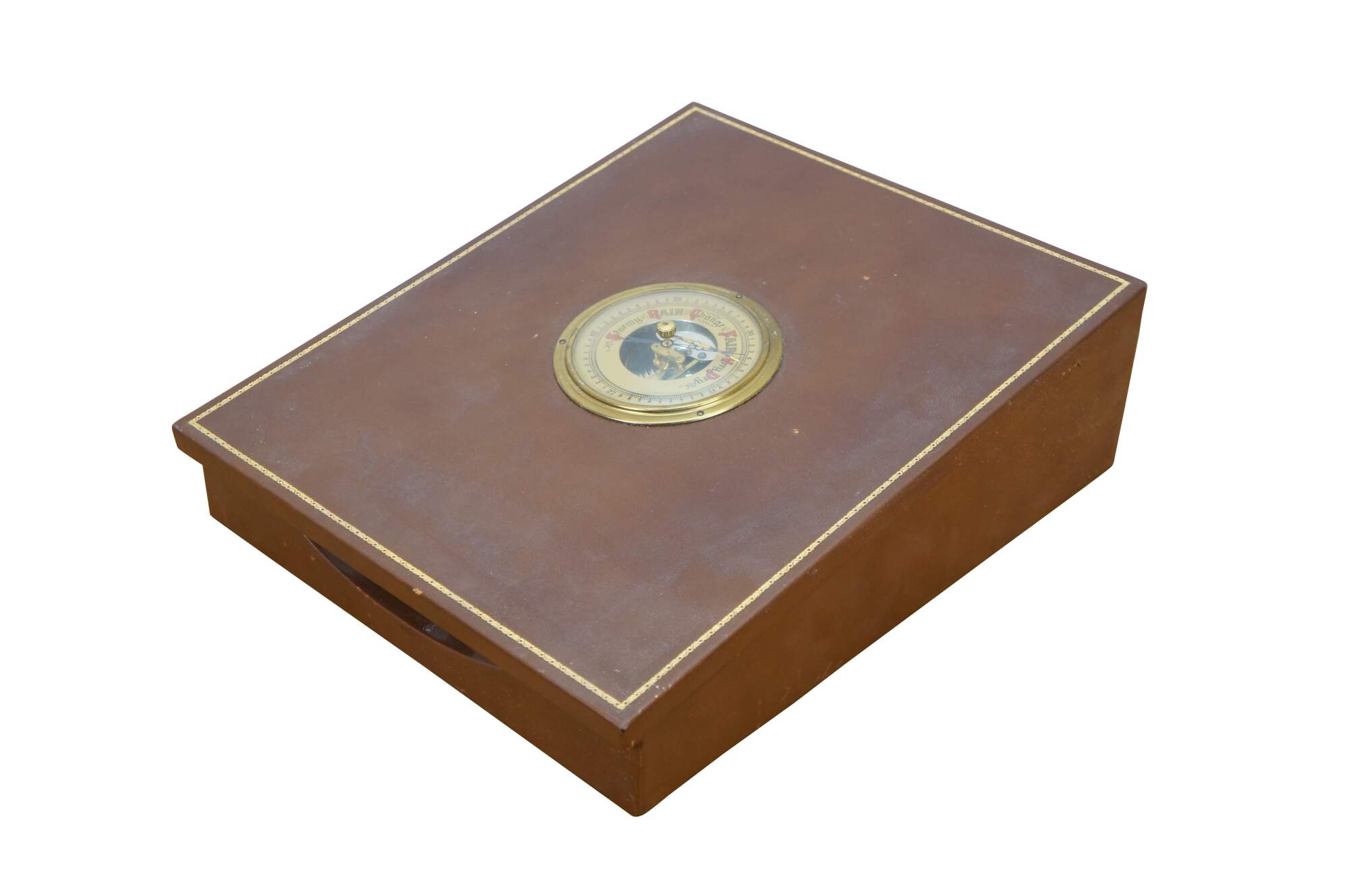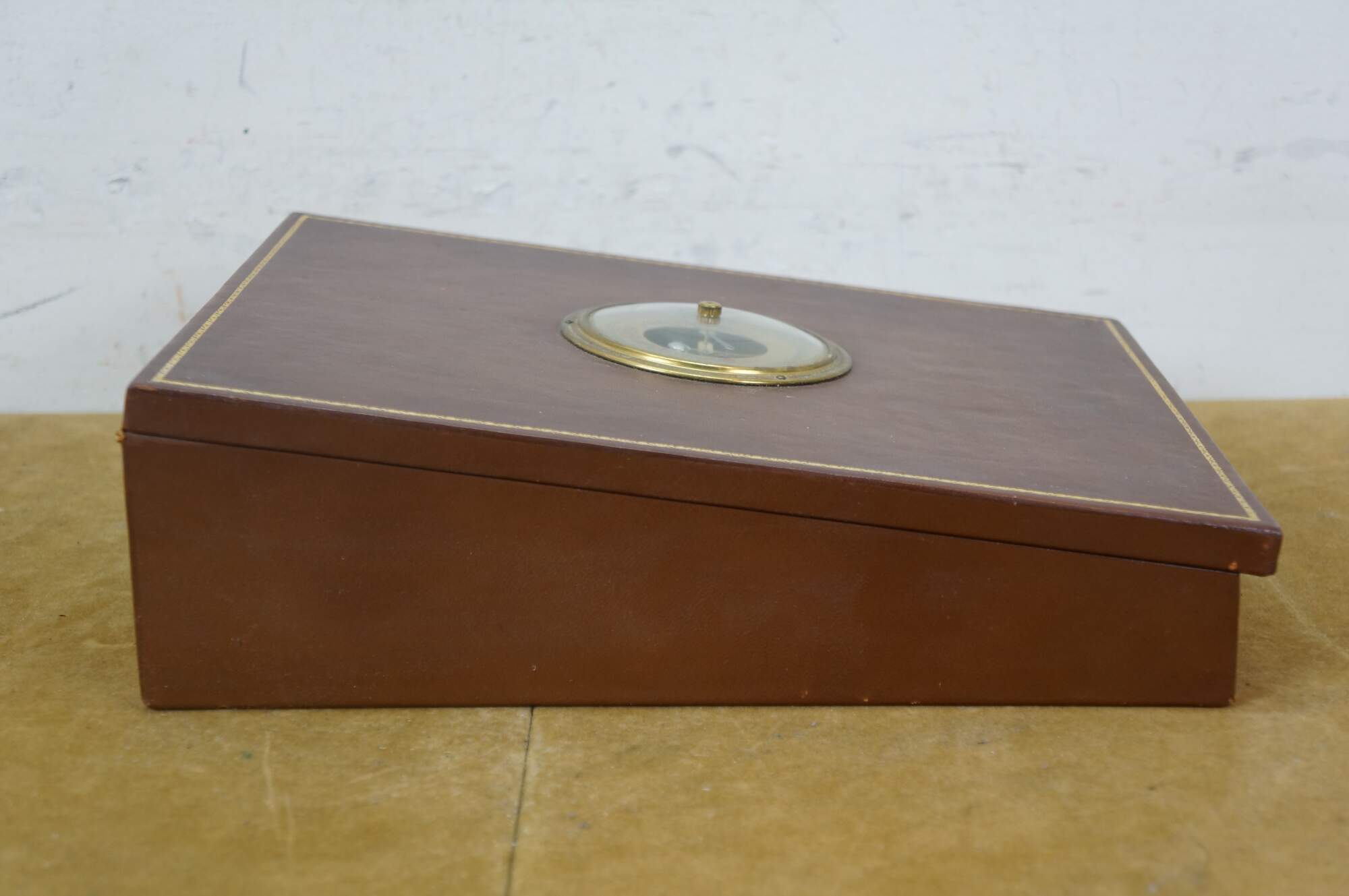 Mid century desktop / library document box by Moco of West Germany. Made of wood featuring a tooled leather case with slant top that showcases a barometer and opens for additional storage.