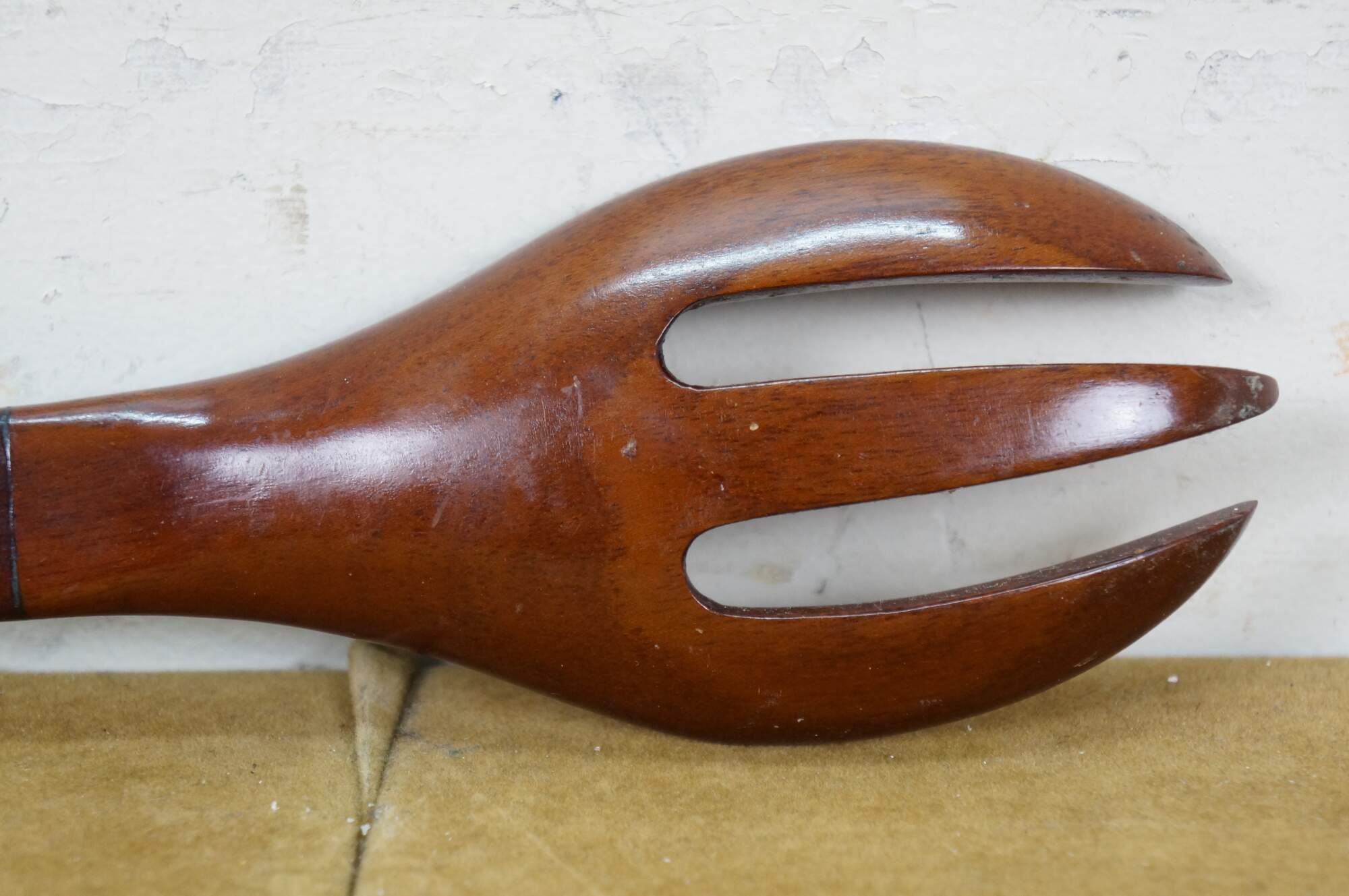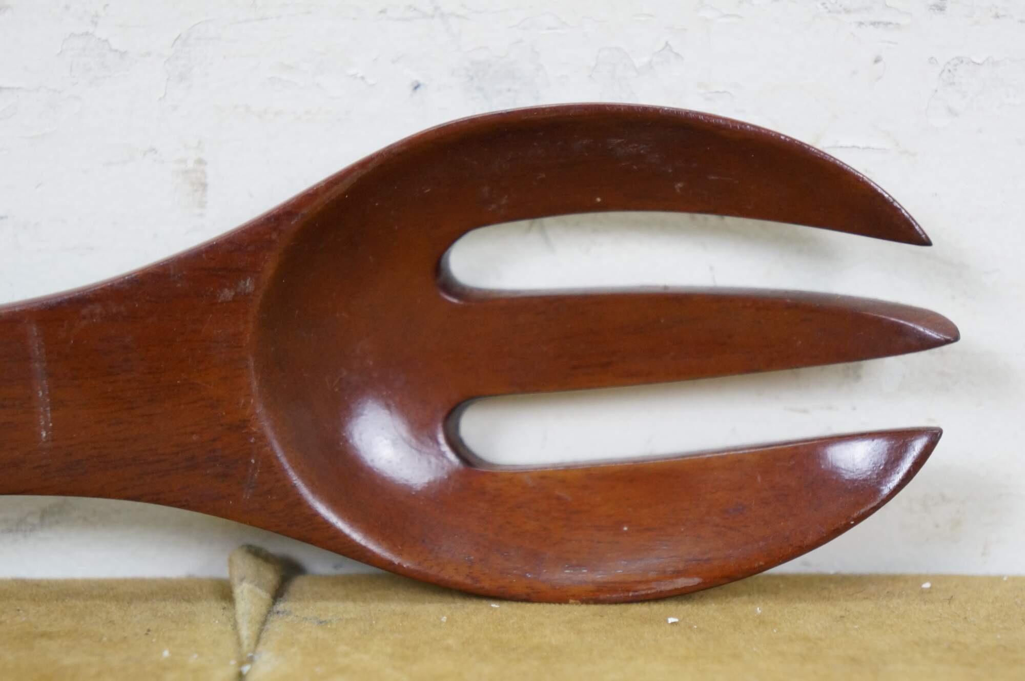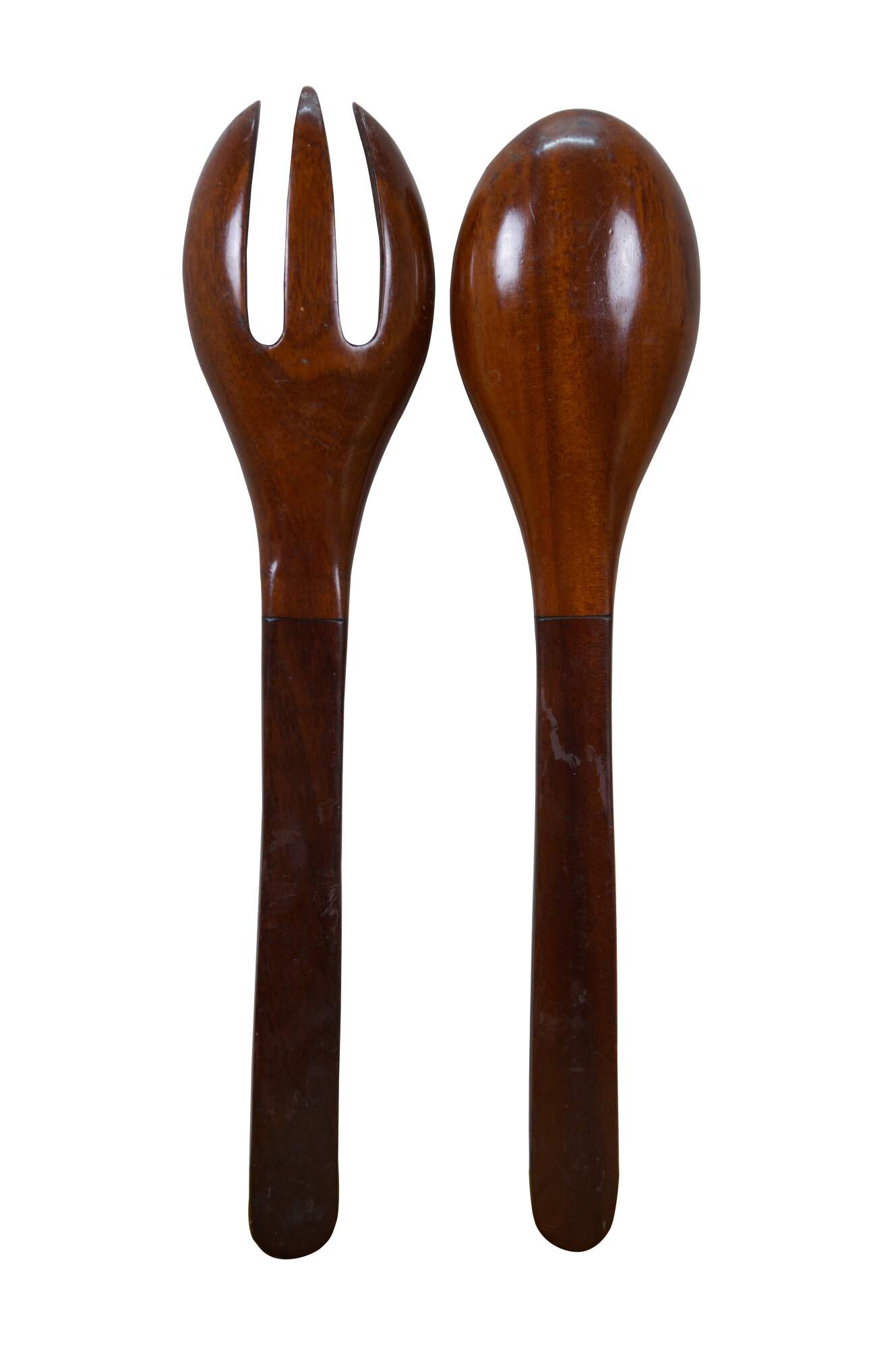 Vintage 20th century pair of glossy hardwood salad tossers - one spoon and one three prong spork.