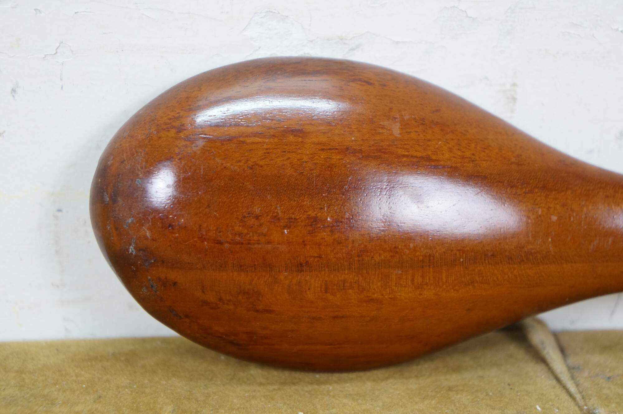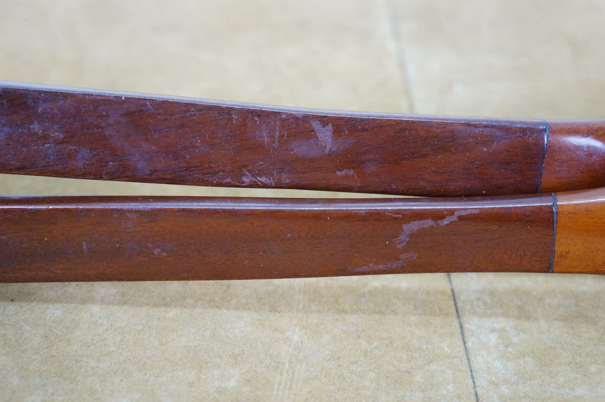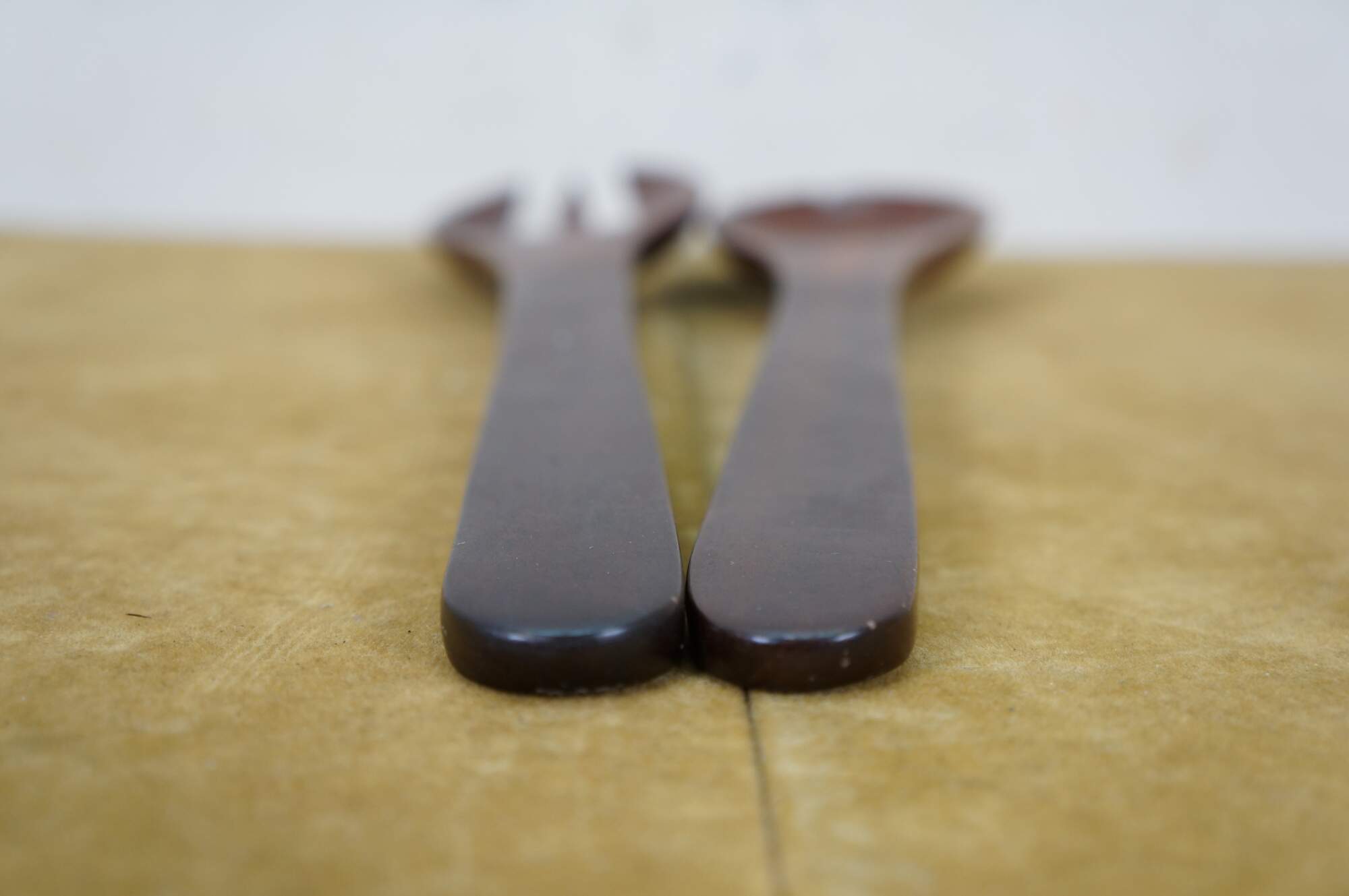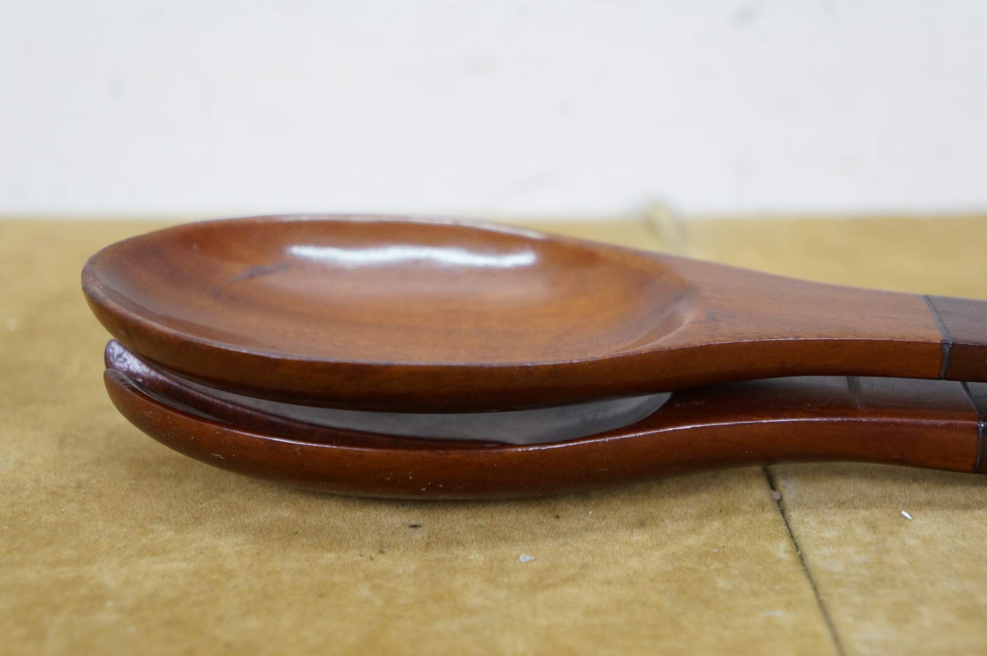 Vintage 20th century pair of glossy hardwood salad tossers - one spoon and one three prong spork.