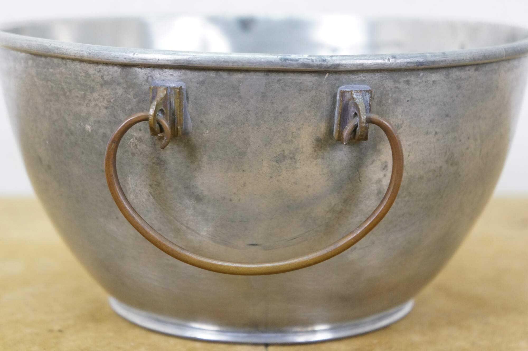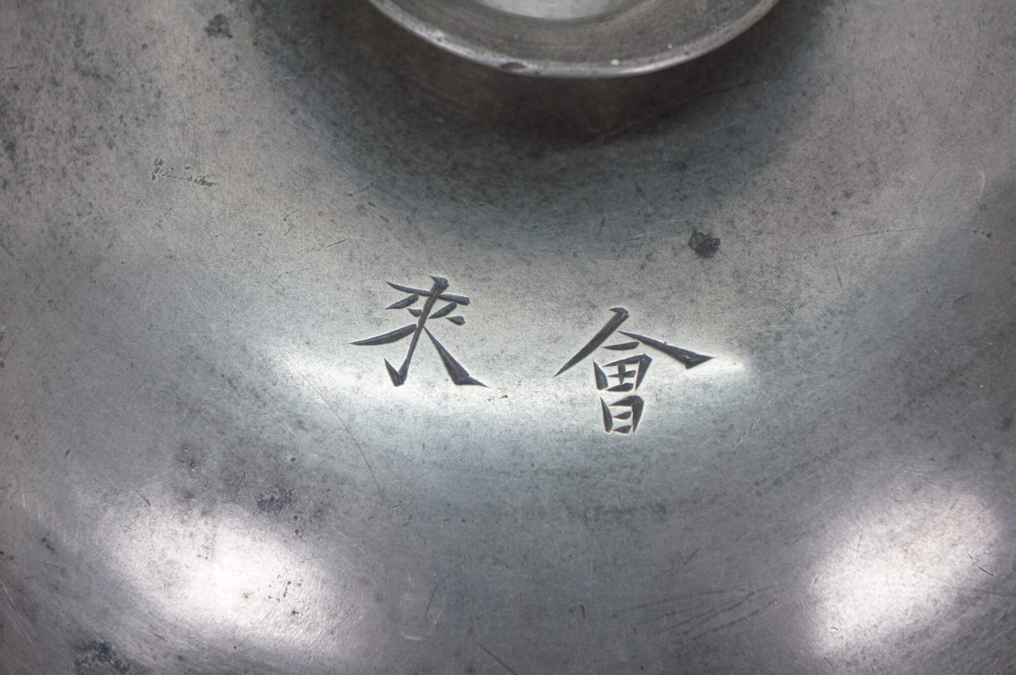 Vintage Chinese hot pot / food warmer consisting of three pieces - Round tapered base for filling with hot coals with two copper bail handles, footed plate / low bowl that sits on the upper rim of the base, and lid.