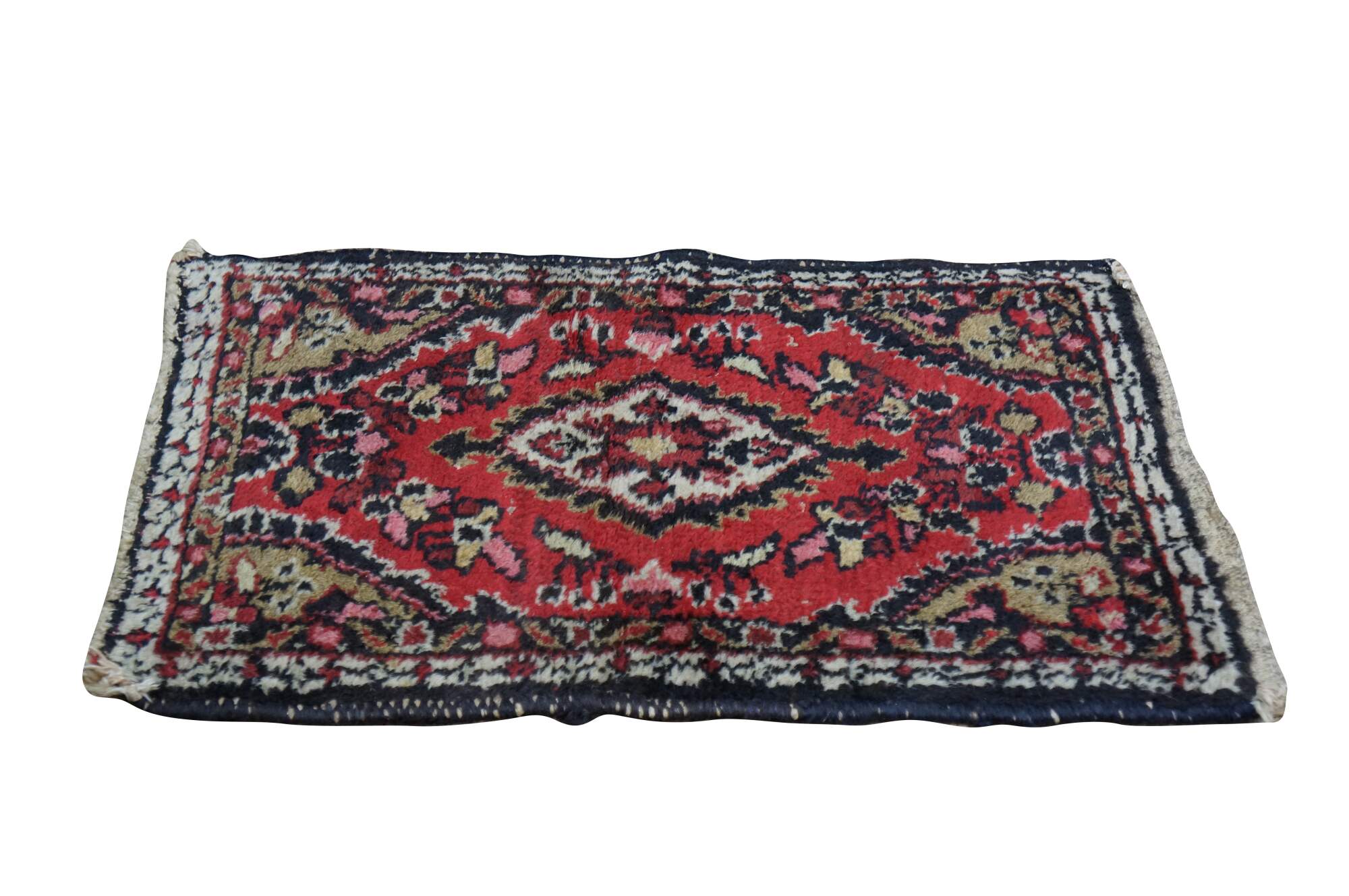 Vintage hand knotted small wool rug / mat featuring a floral and diamond design in red, pink.beige and navy.