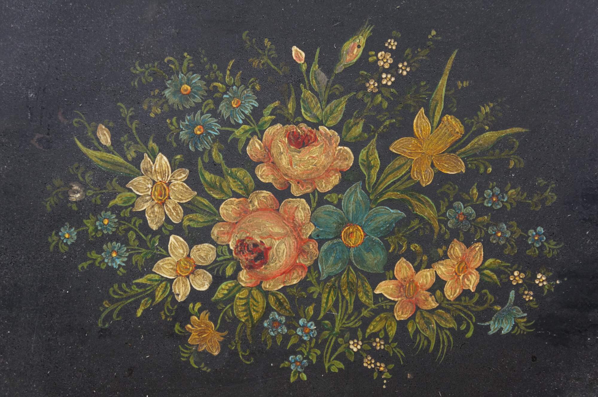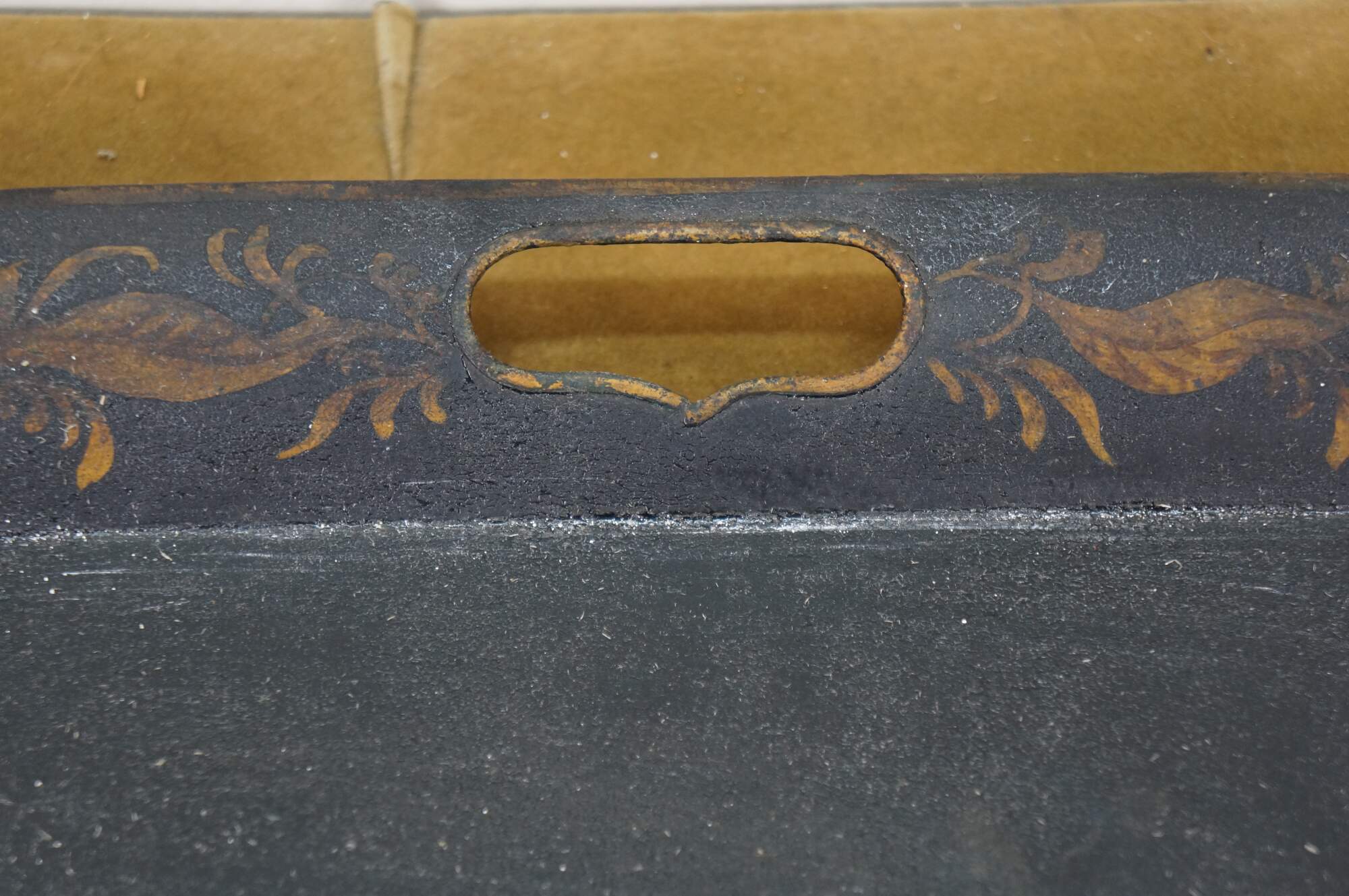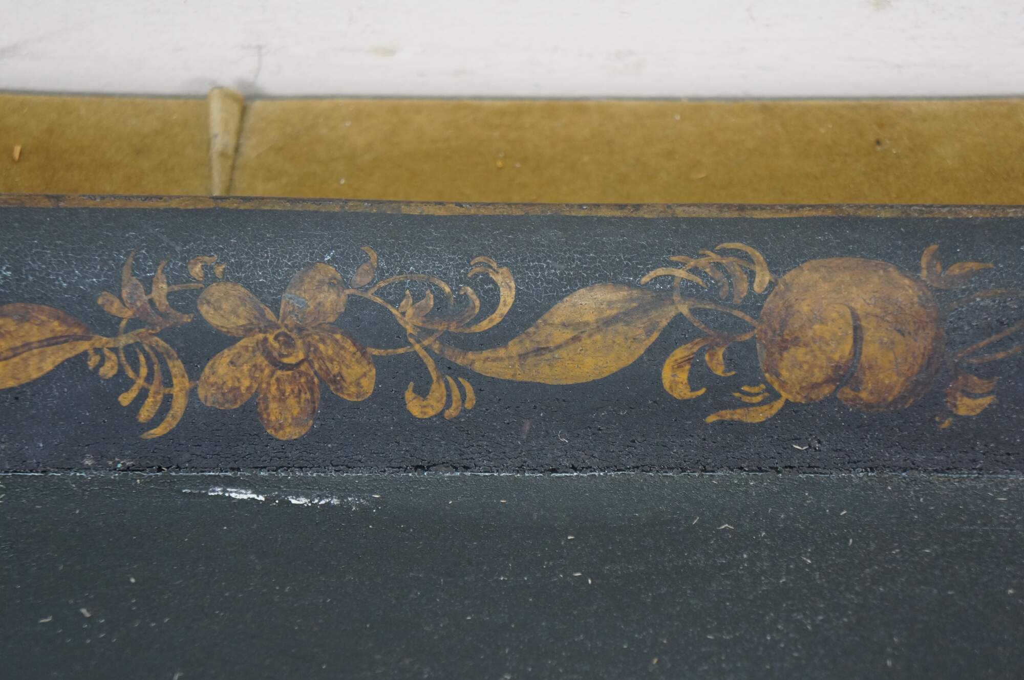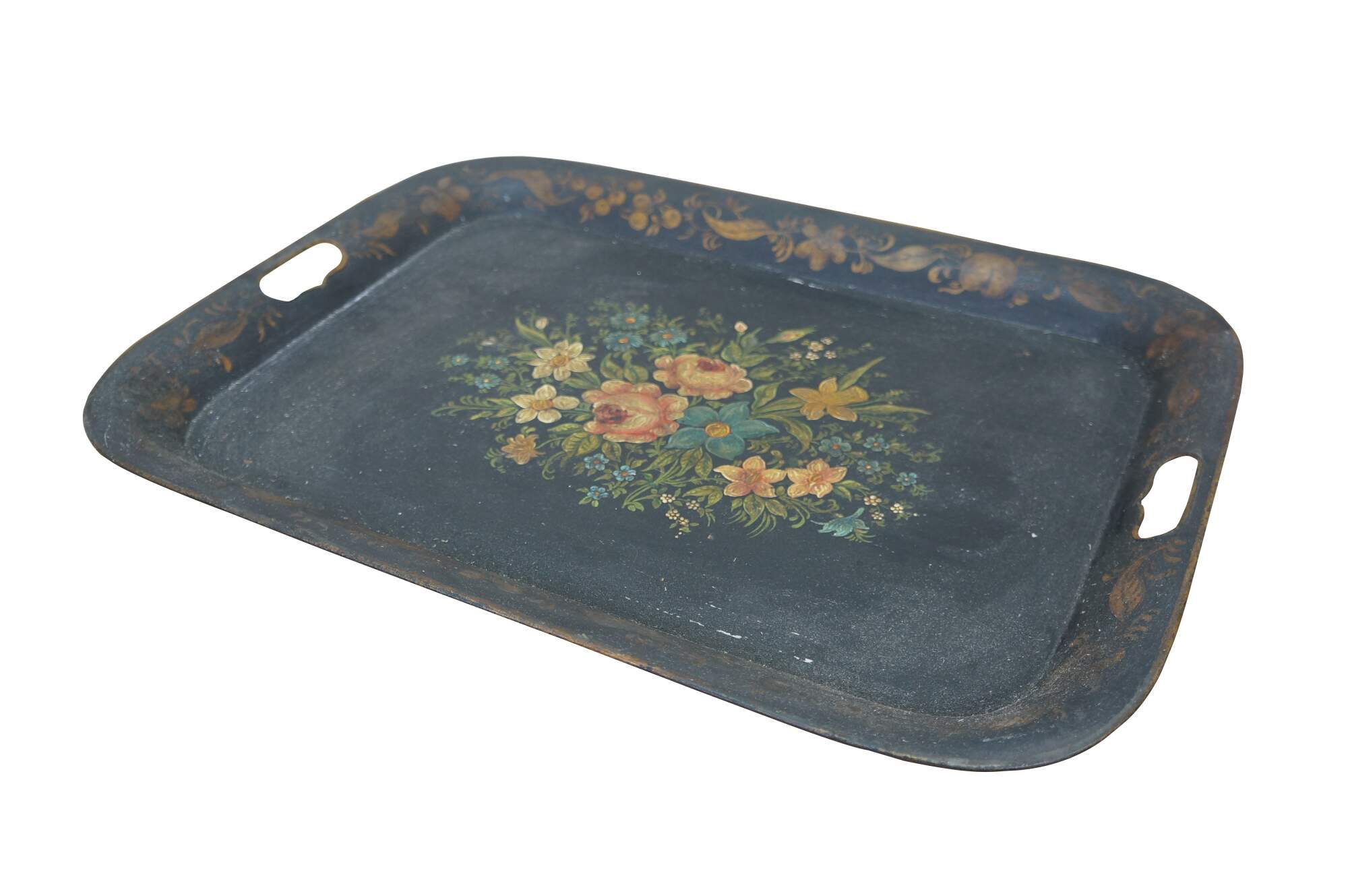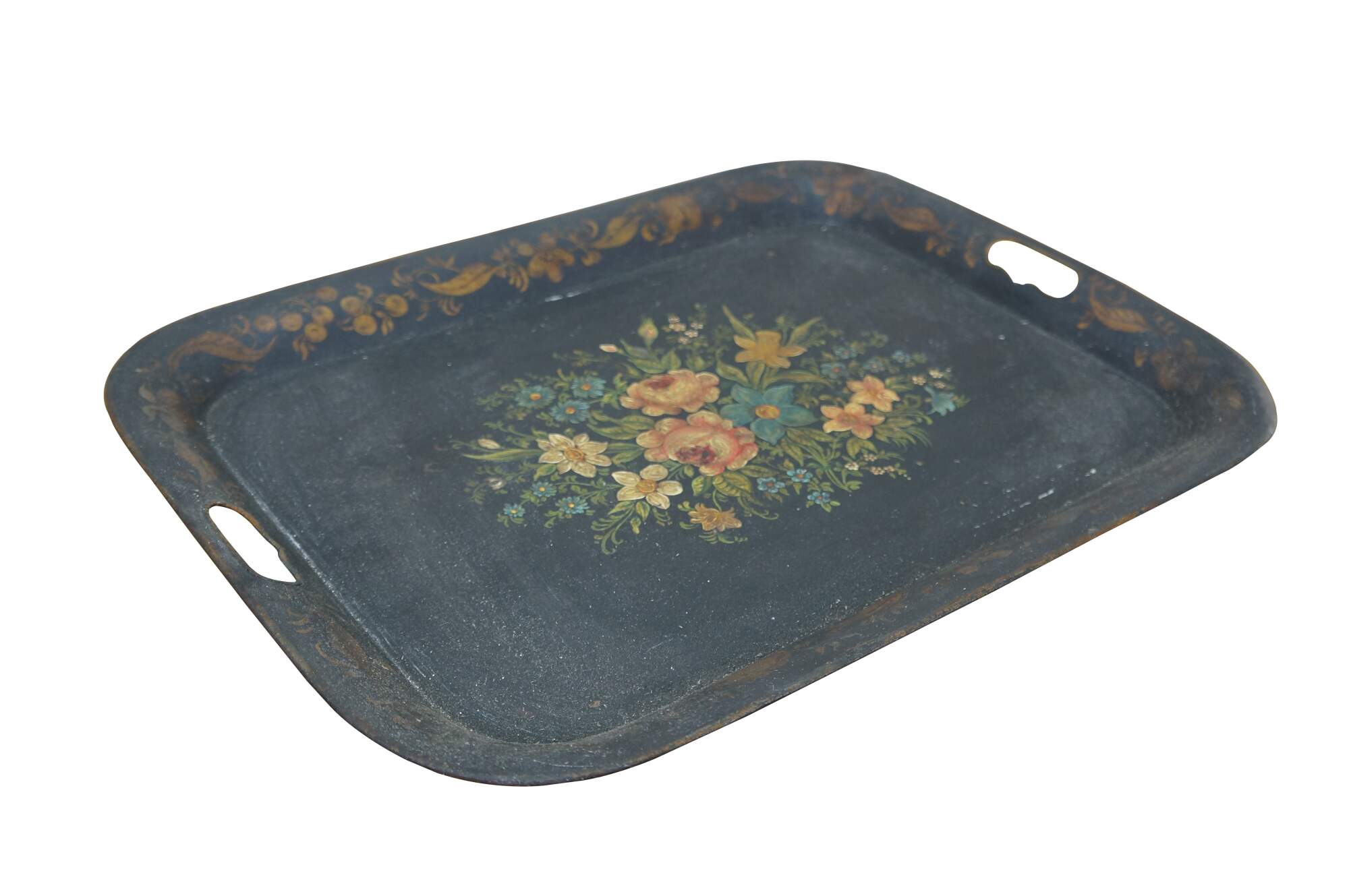Antique black metal toleware bar serving tray. Rounded rectangular form with pierced handles at the edge. Border painted with golden leaves, flowers and fruit. Center decorated with a bouquet of various flowers in pink, blue, yellow, white, and green.
