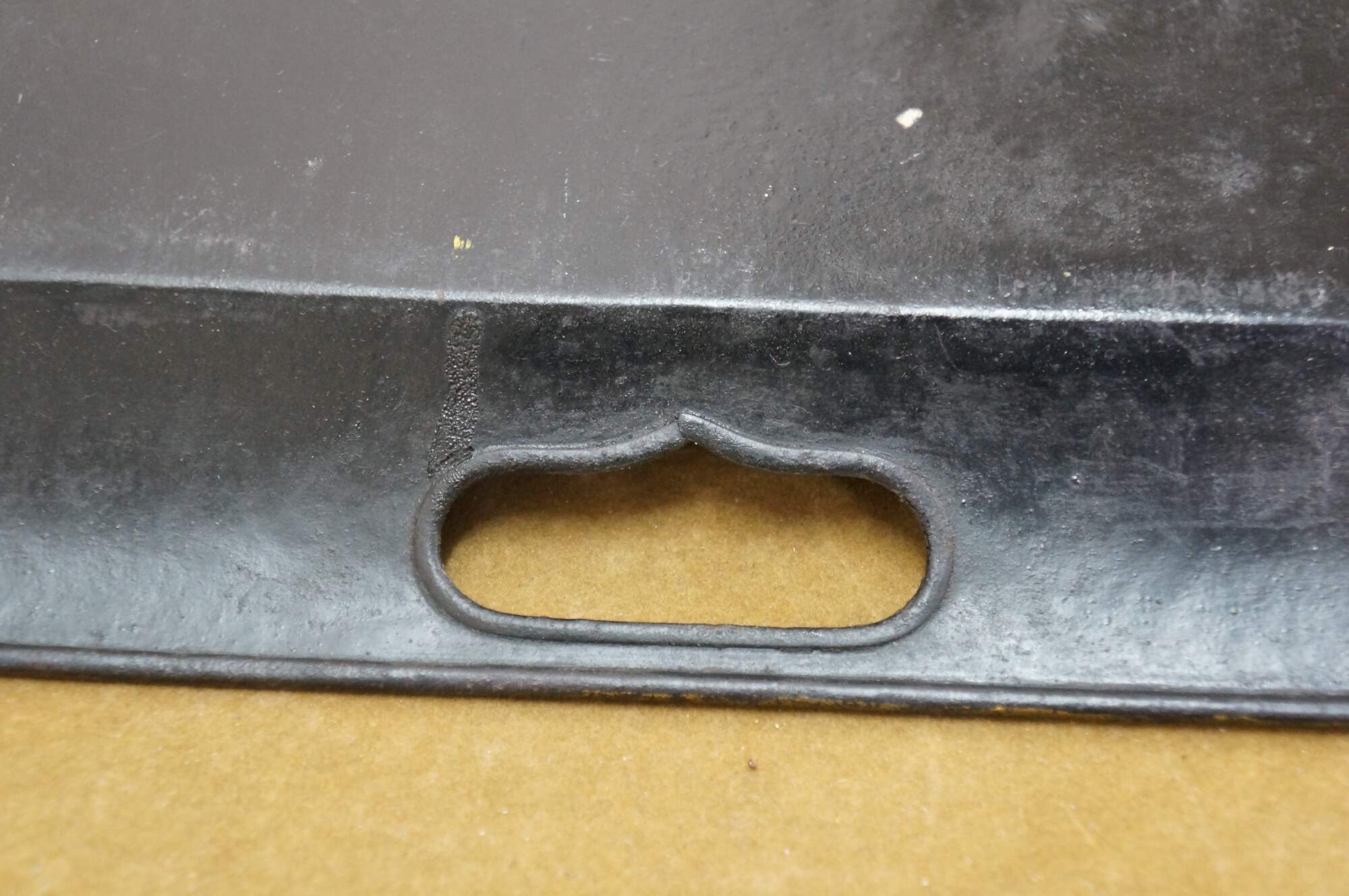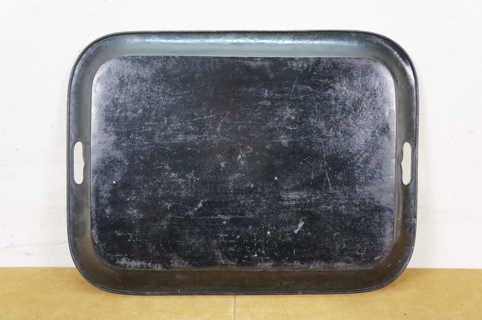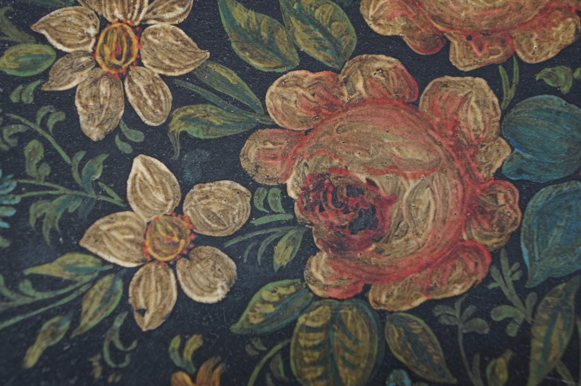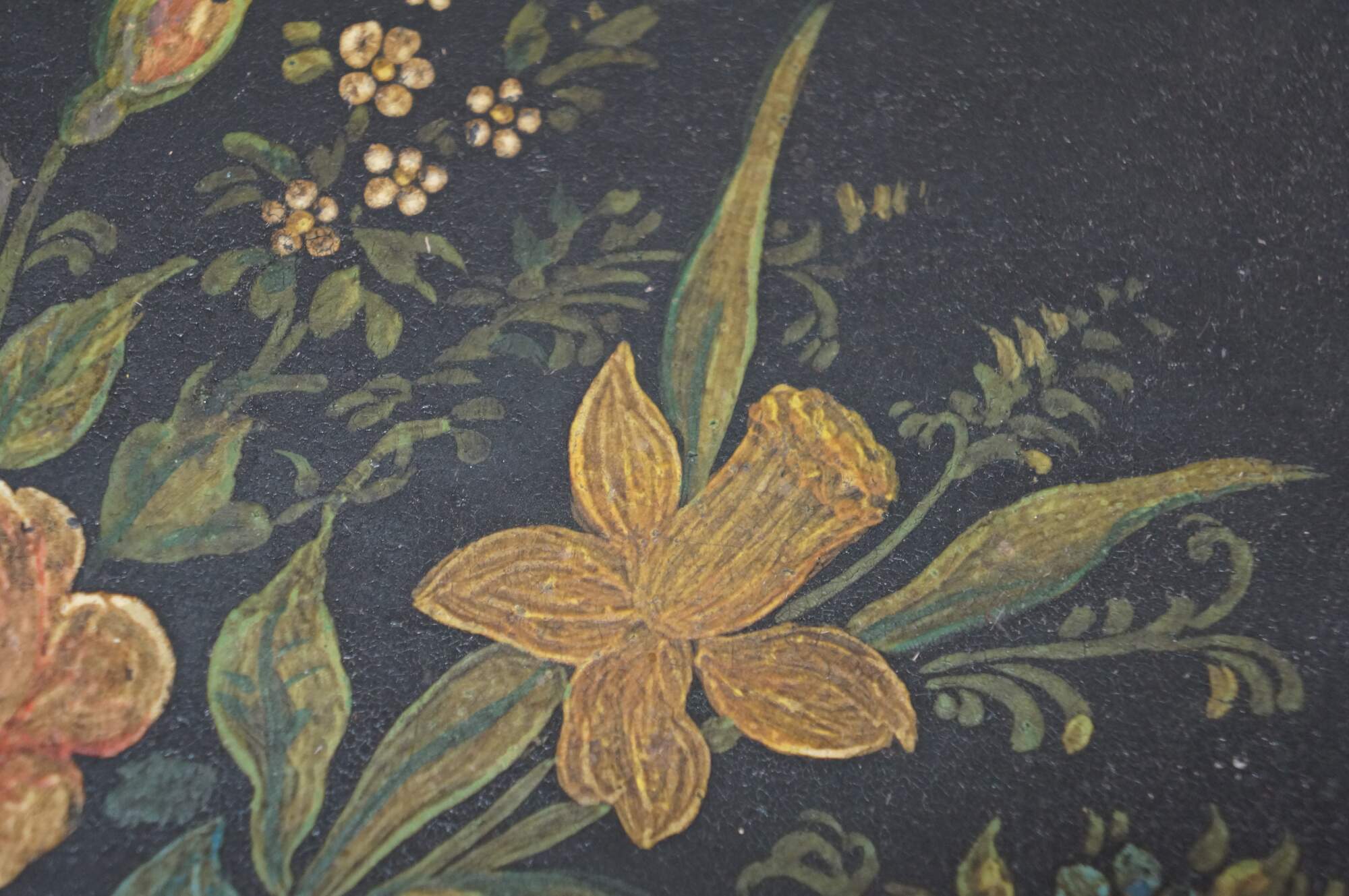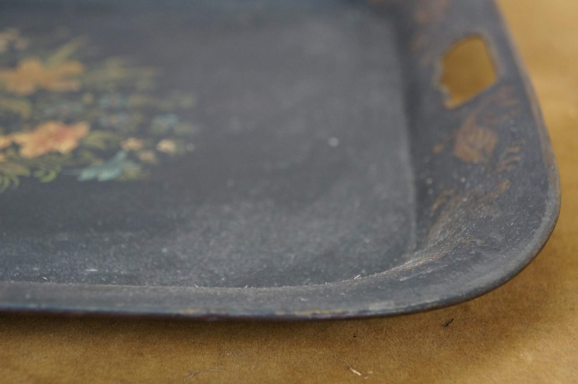 Antique black metal toleware bar serving tray. Rounded rectangular form with pierced handles at the edge. Border painted with golden leaves, flowers and fruit. Center decorated with a bouquet of various flowers in pink, blue, yellow, white, and green.