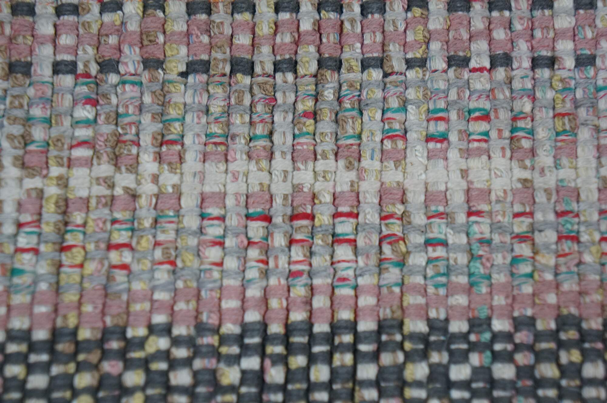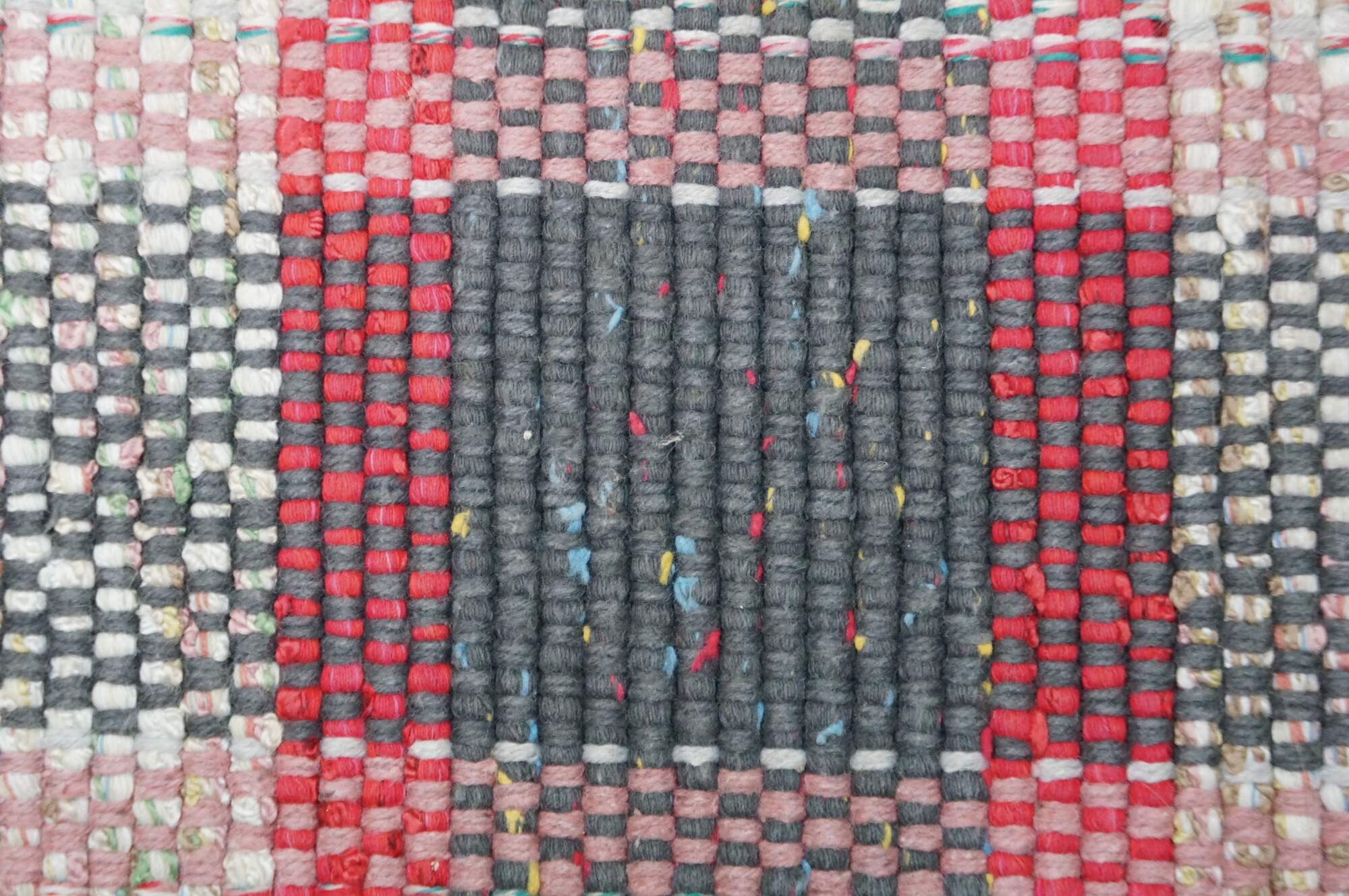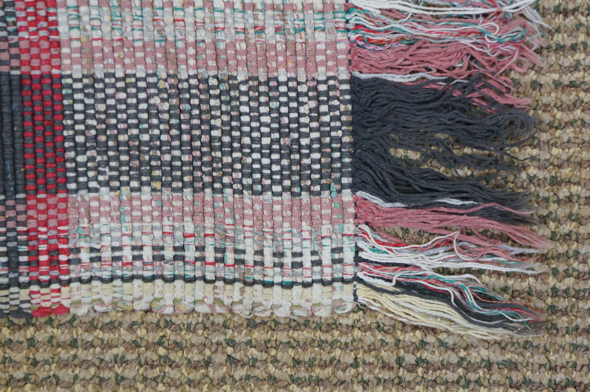 Vintage 20th century hand made folk art style cotton rag rug, featuring a red, gray, and white plaid pattern and fringe.