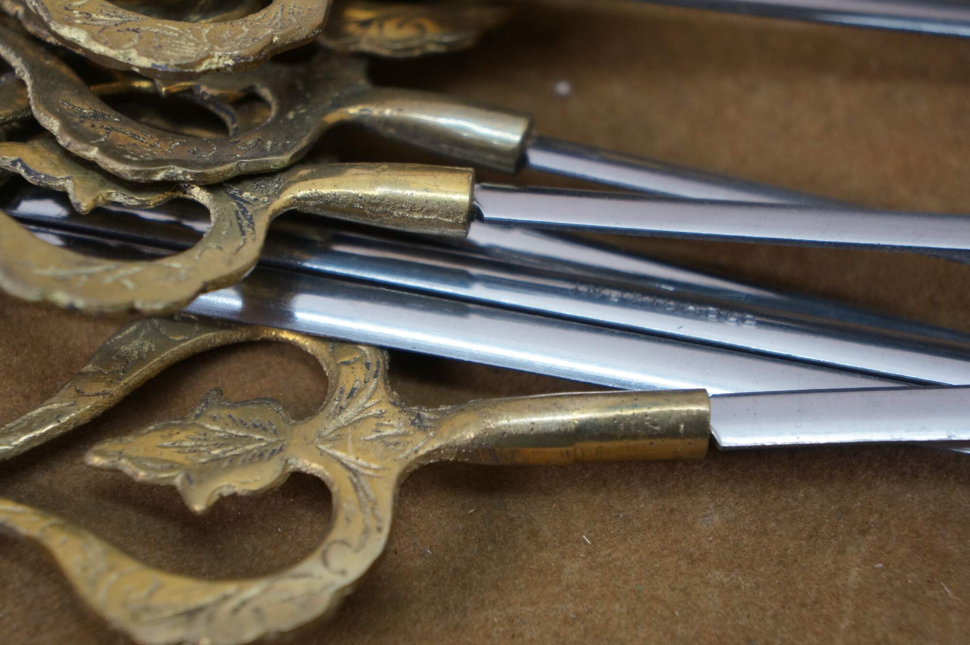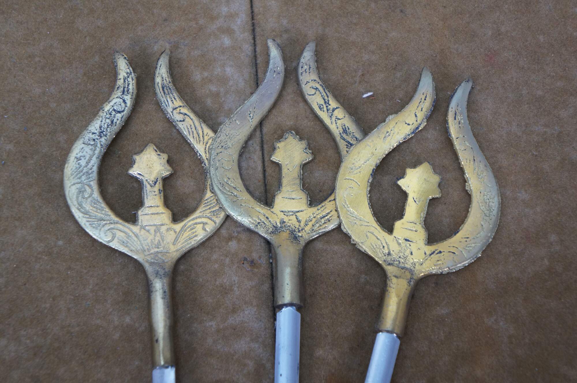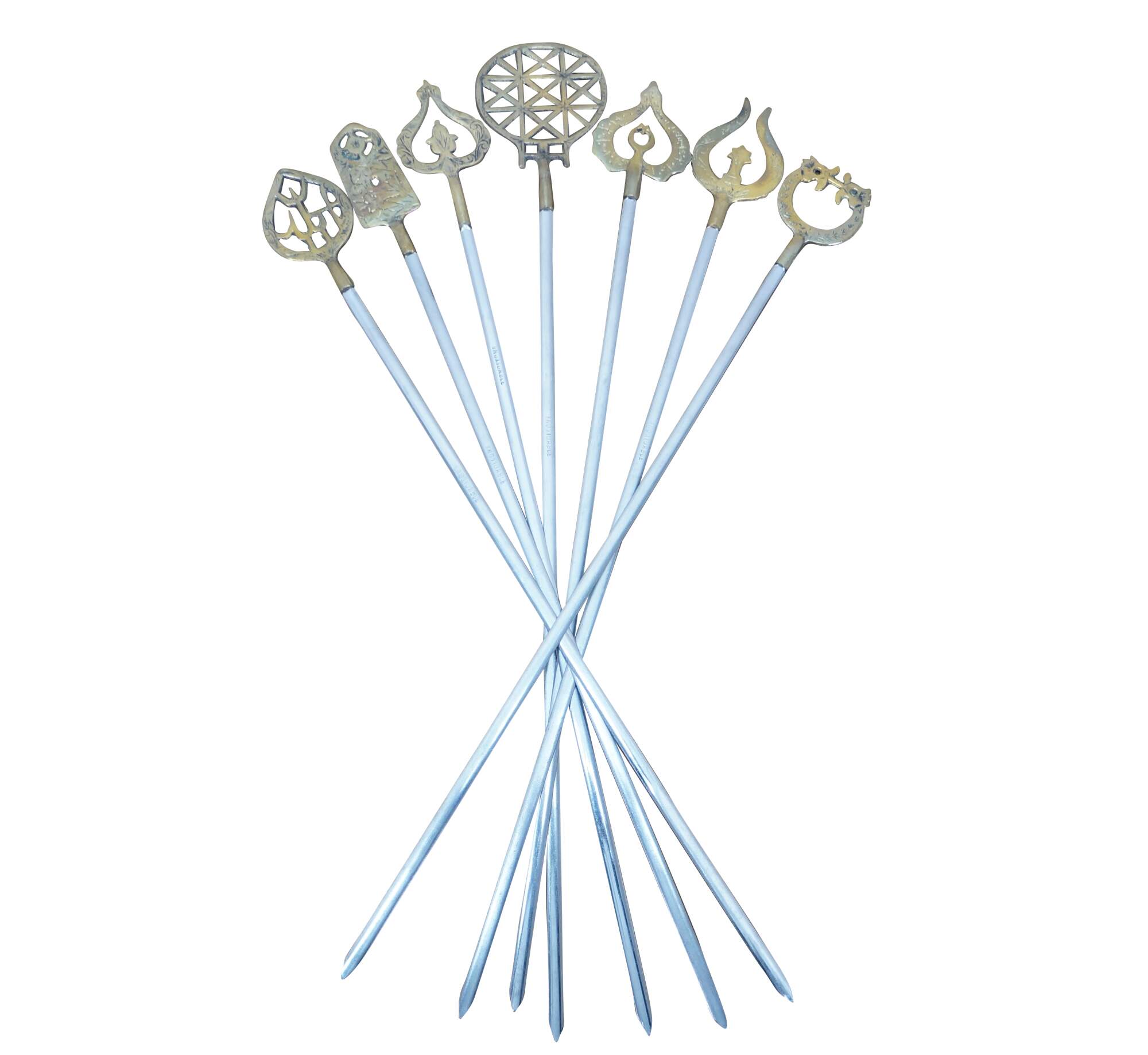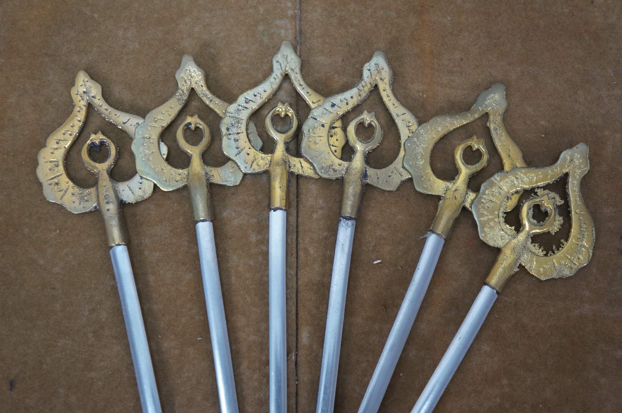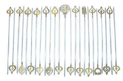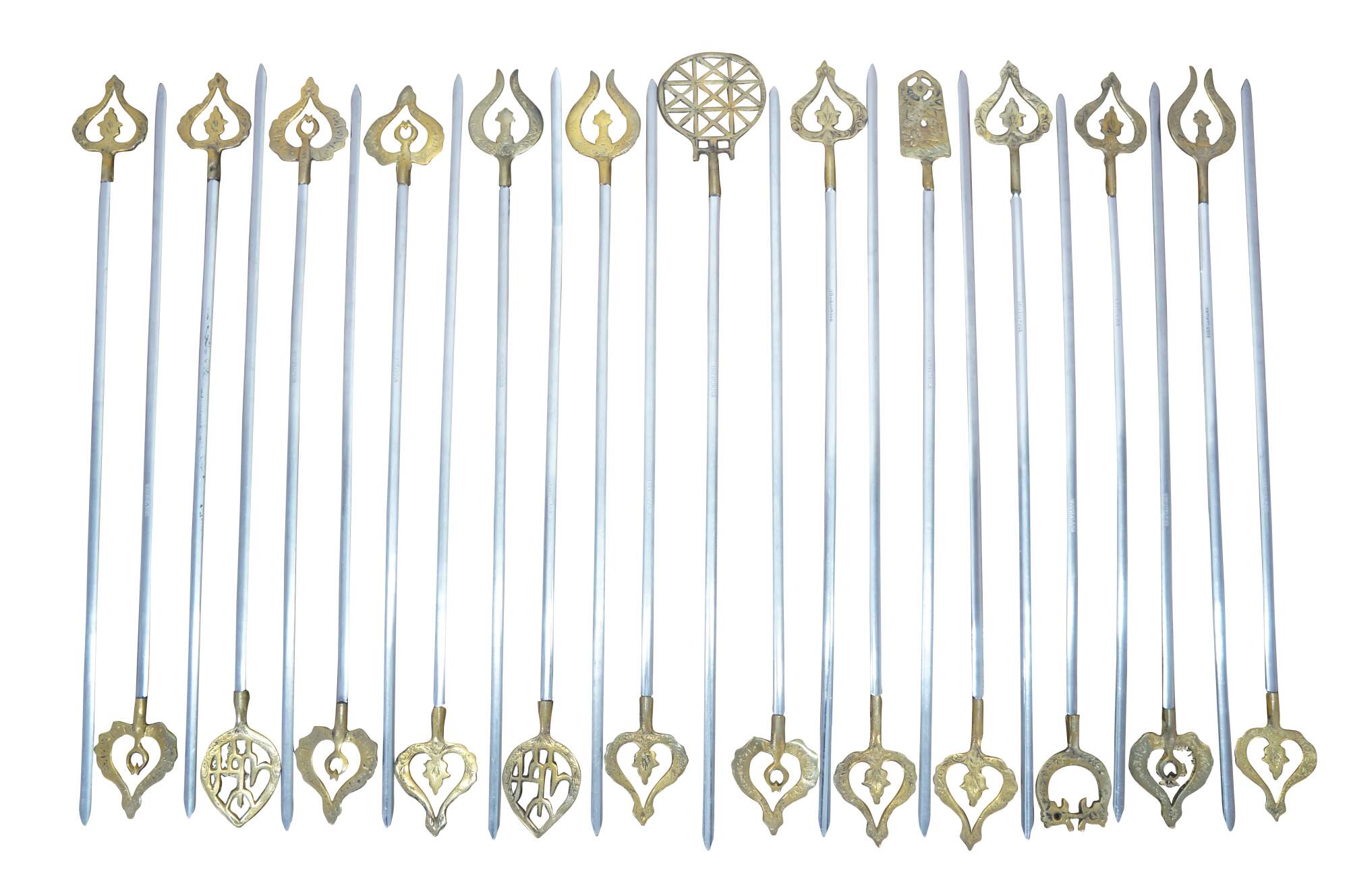 Set of 24 late 20th century Turkish / Greek brass and stainless steel shish kabab skewers topped with a mixture of designs.
