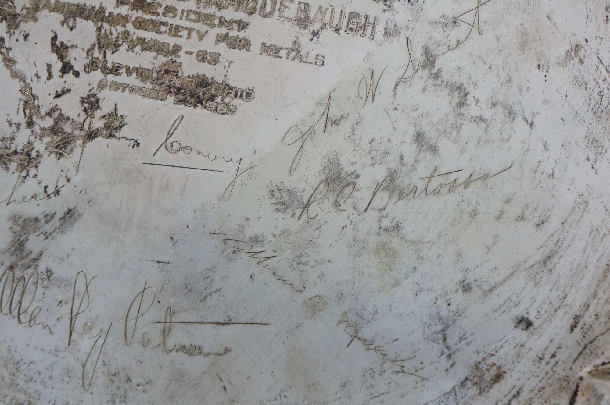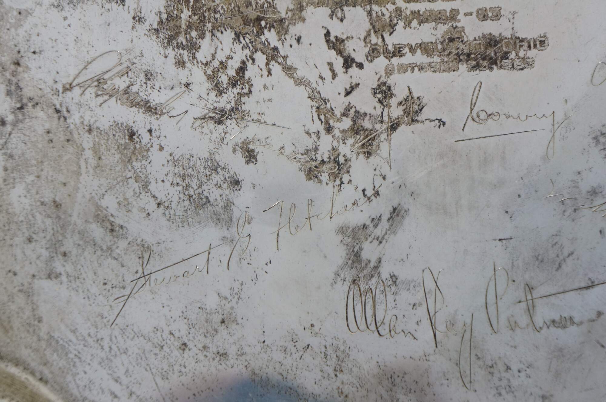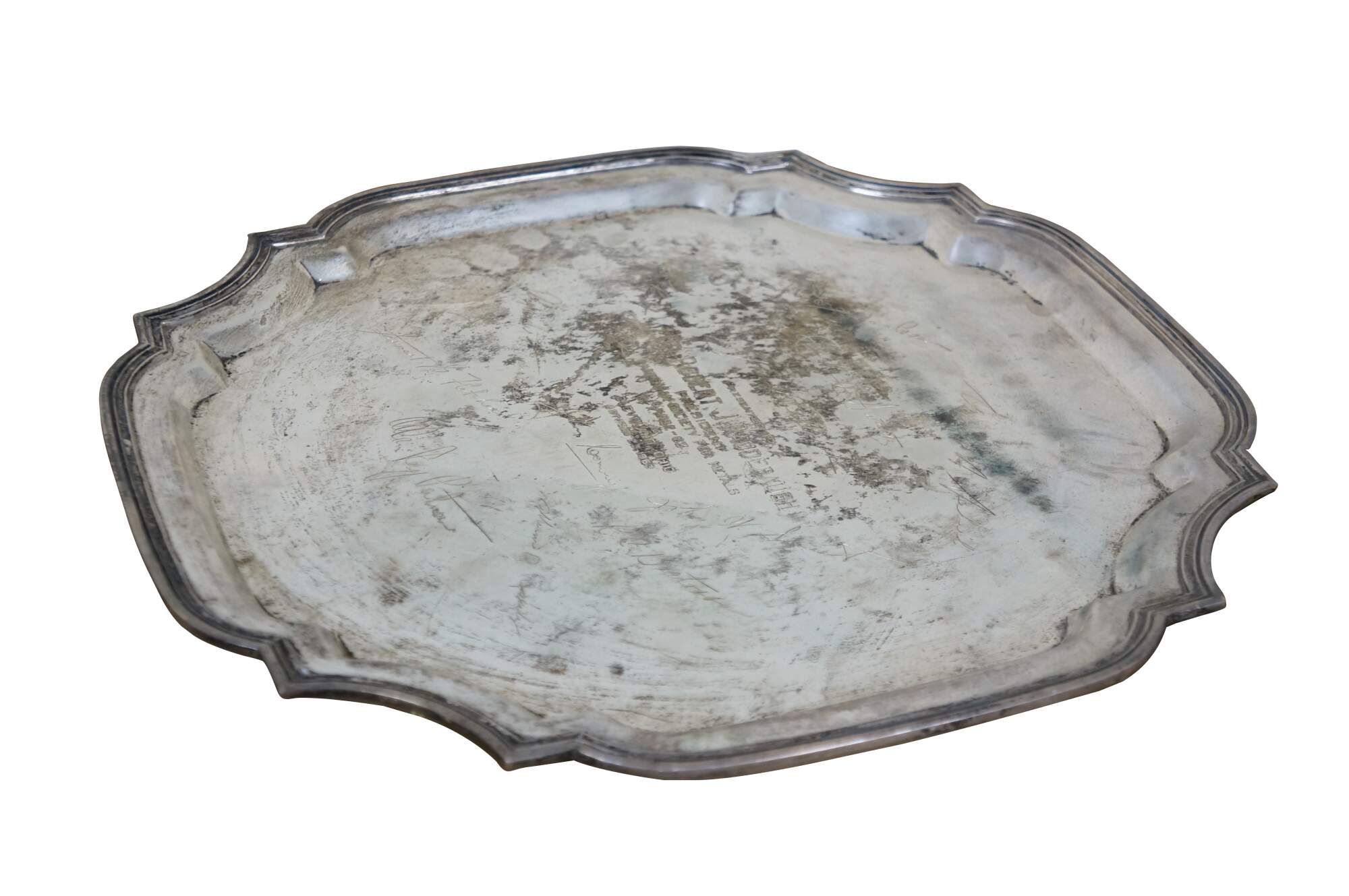 Vintage Fisher Silvermiths sterling silver tray number 2843 - square form with clipped corners and a grooved edge; engraved as a memento "Presented to Dr Robert J. Raudebaugh - President -American Society for Metals - 1962-63 - Cleveland, Ohio - October 23, 1963." Surrounding this central engraving are the signatures of other members of the society.