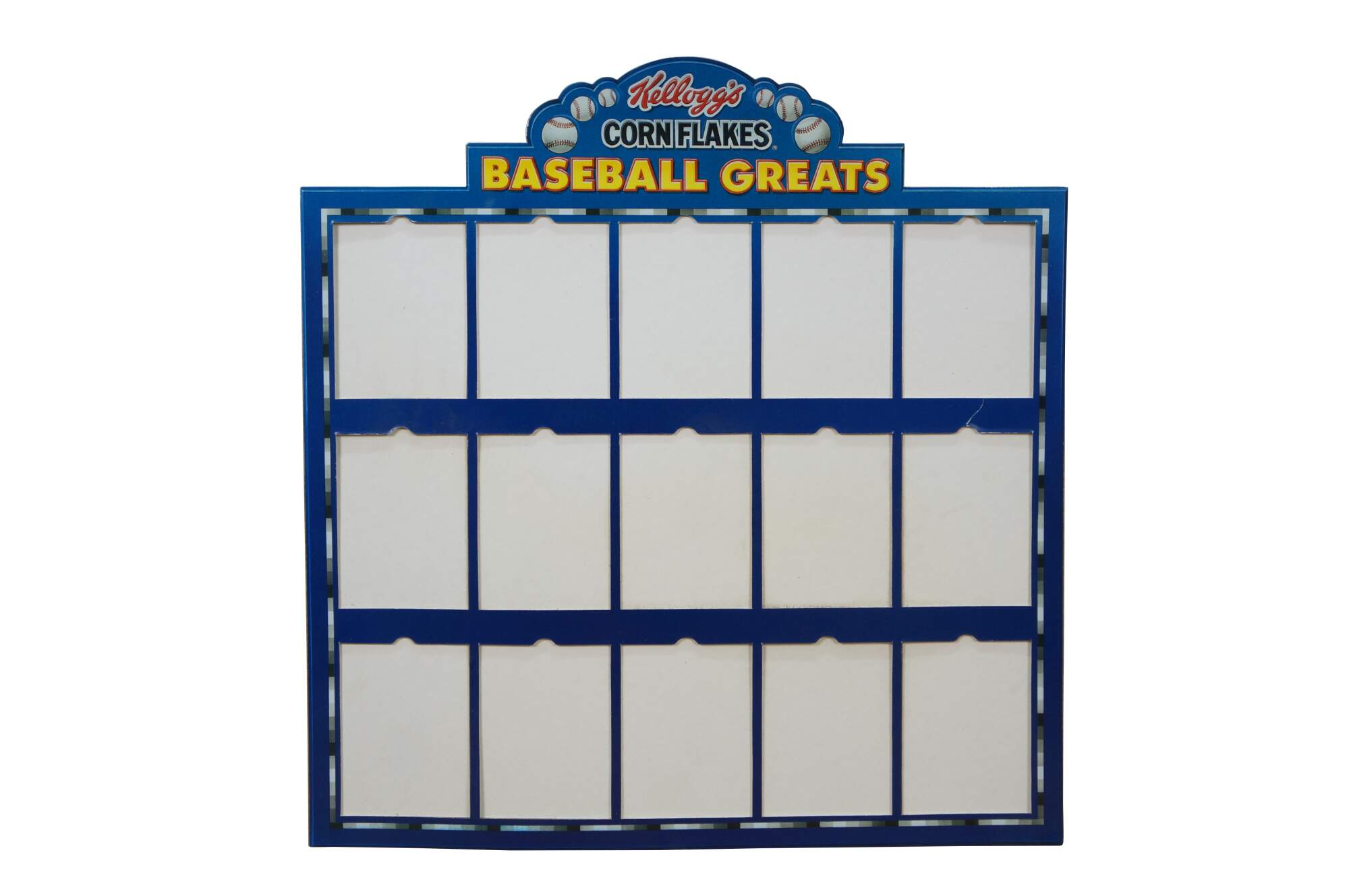 Vintage 1991 Kellogg's Corn Flakes Baseball Greats set of 15 Sportflics 3D holographic baseball cards in plastic sleeves and un-used cardboard display.