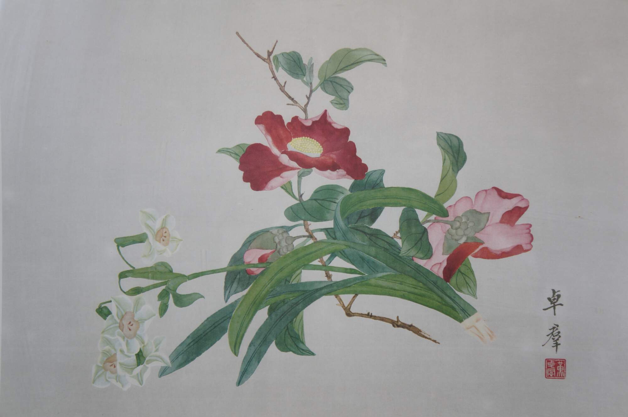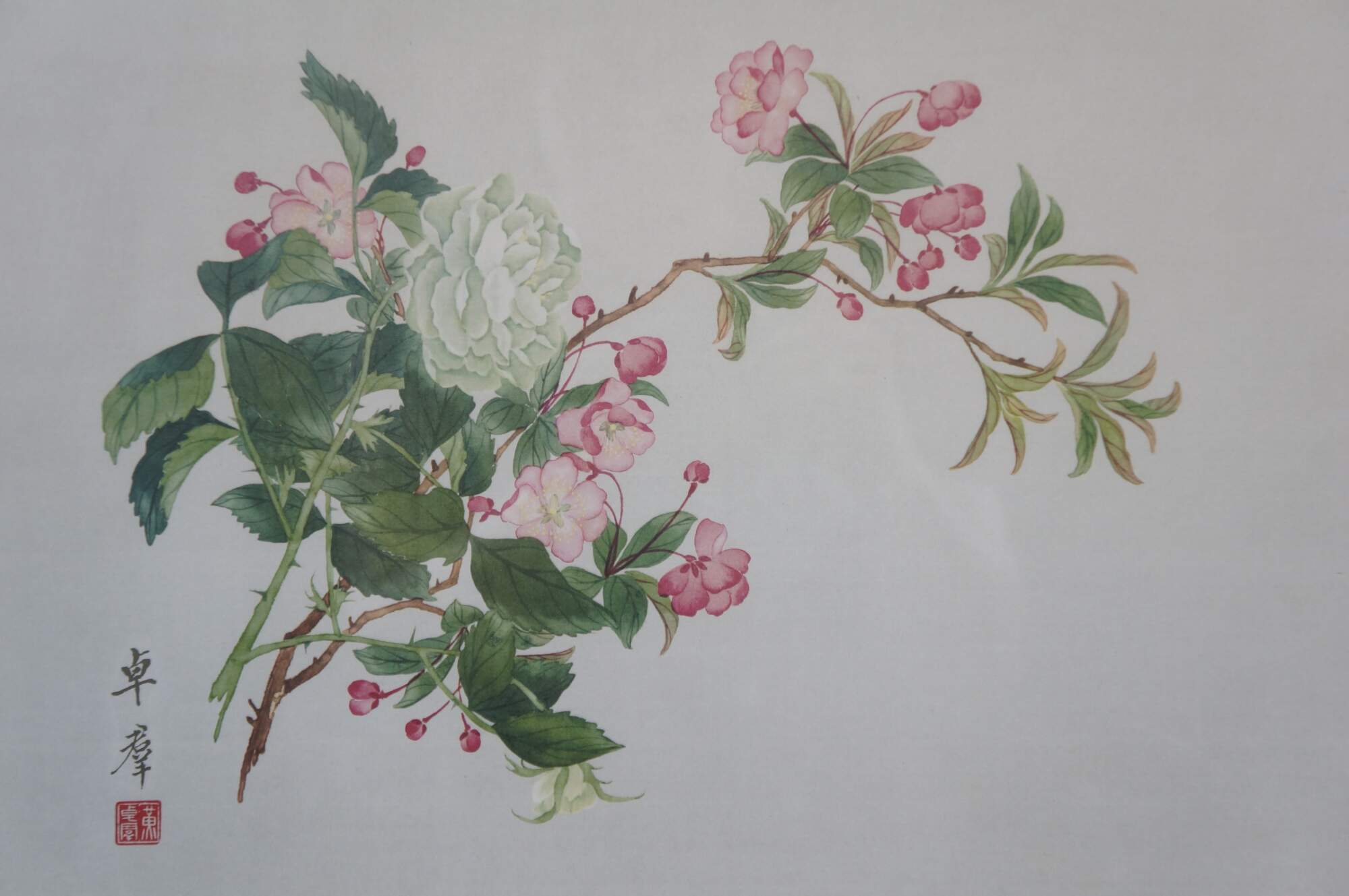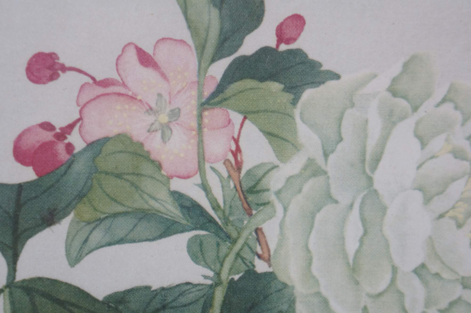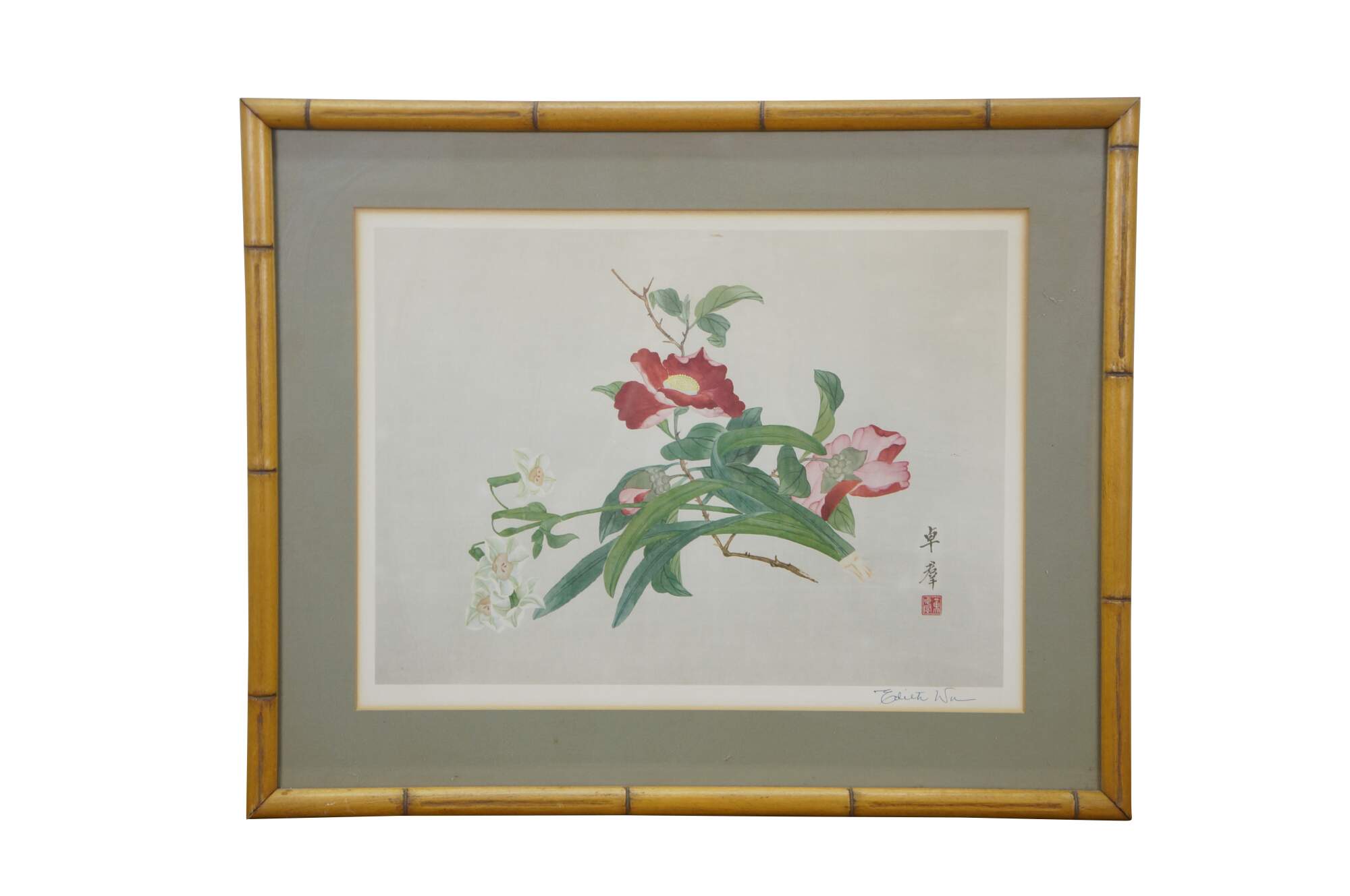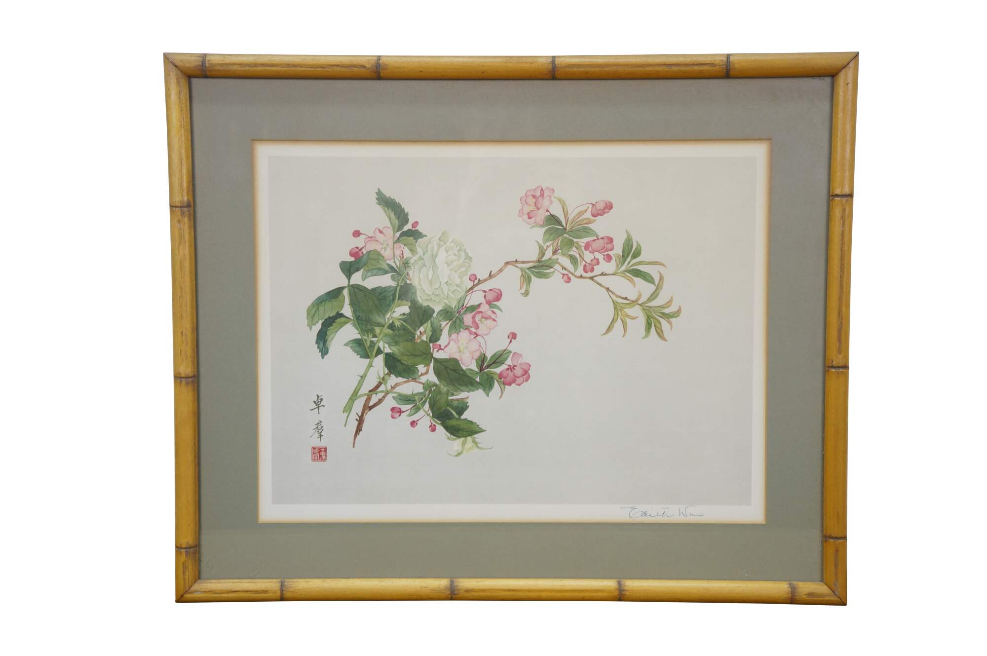 Pair of Chinese floral prints by Edith Juang Wu. Signed along lower right edge. Faux bamboo frame; light sage mat.
