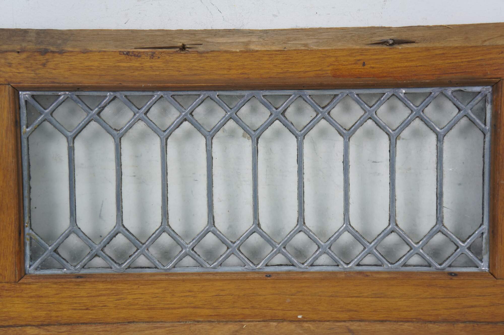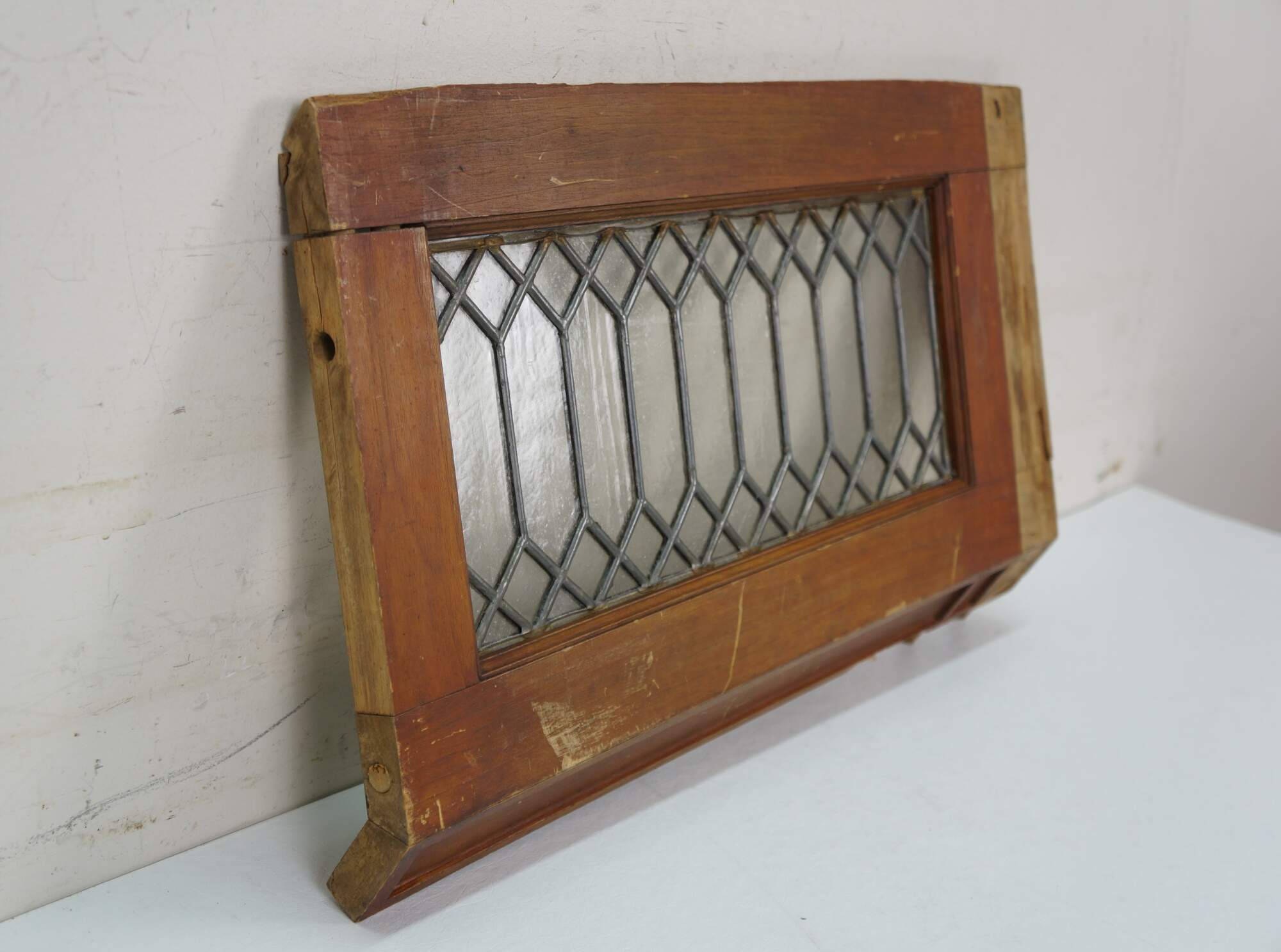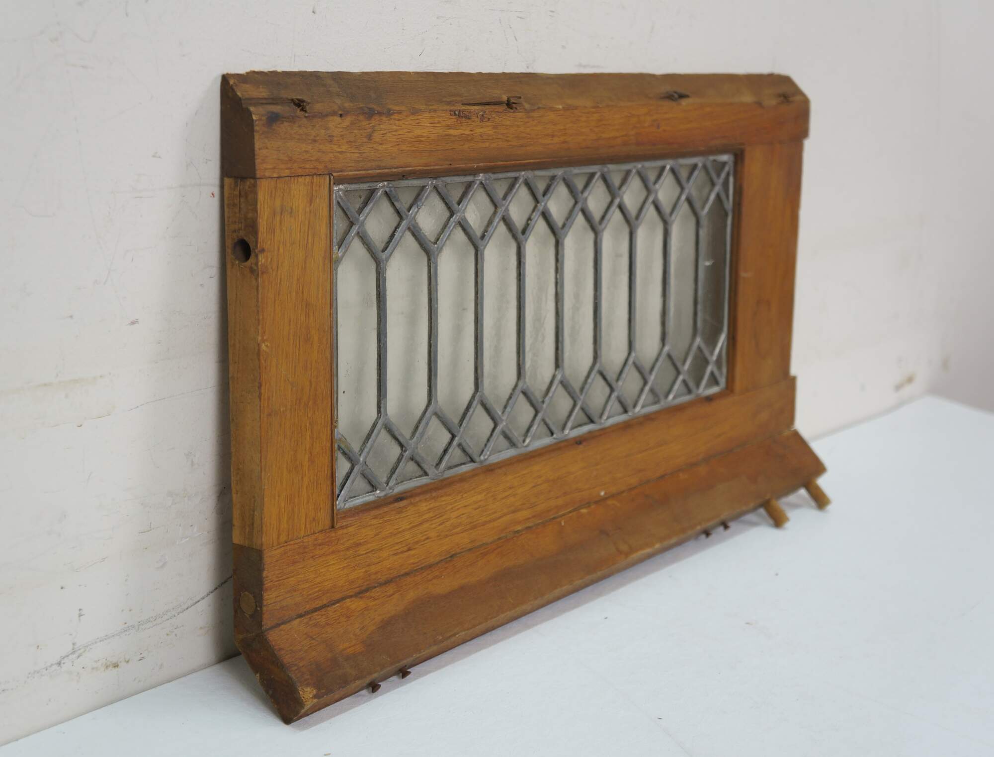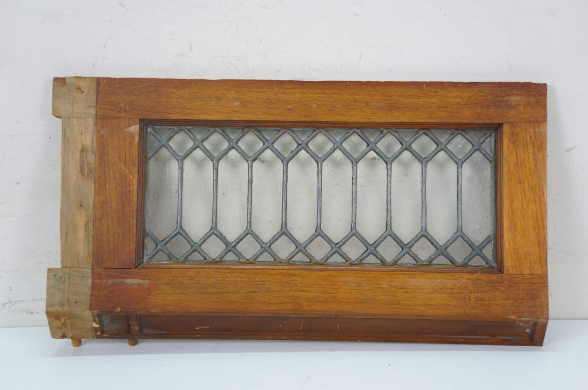 Pair of antique architectural salvaged rectangular transom / cabinet windows - oak frames with angled base; clear leaded geometric picket fence style glass.