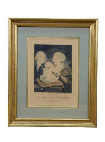 Antique circa 1800 auquatint and stipple engraving of Their Excellencies Prince Serge (Count Sergei Sergeyevich Gagarin) and Princess Barbara (Countess Varvara Nikolaevna Gagarina) with Prince Nicholas their Son, after a painting by Sir Joshua Reynolds, engraved by Caroline Watson, Engraver to her Majesty. Published Feb. 15, 1800 by Anthony Molteno, Printseller to her Royal Highness the Duchess of York, No 29 Pall Mall. Inherited from an estate and reframed in 1975. Beveled gilt wood frame; pale blue and gold layered mat.