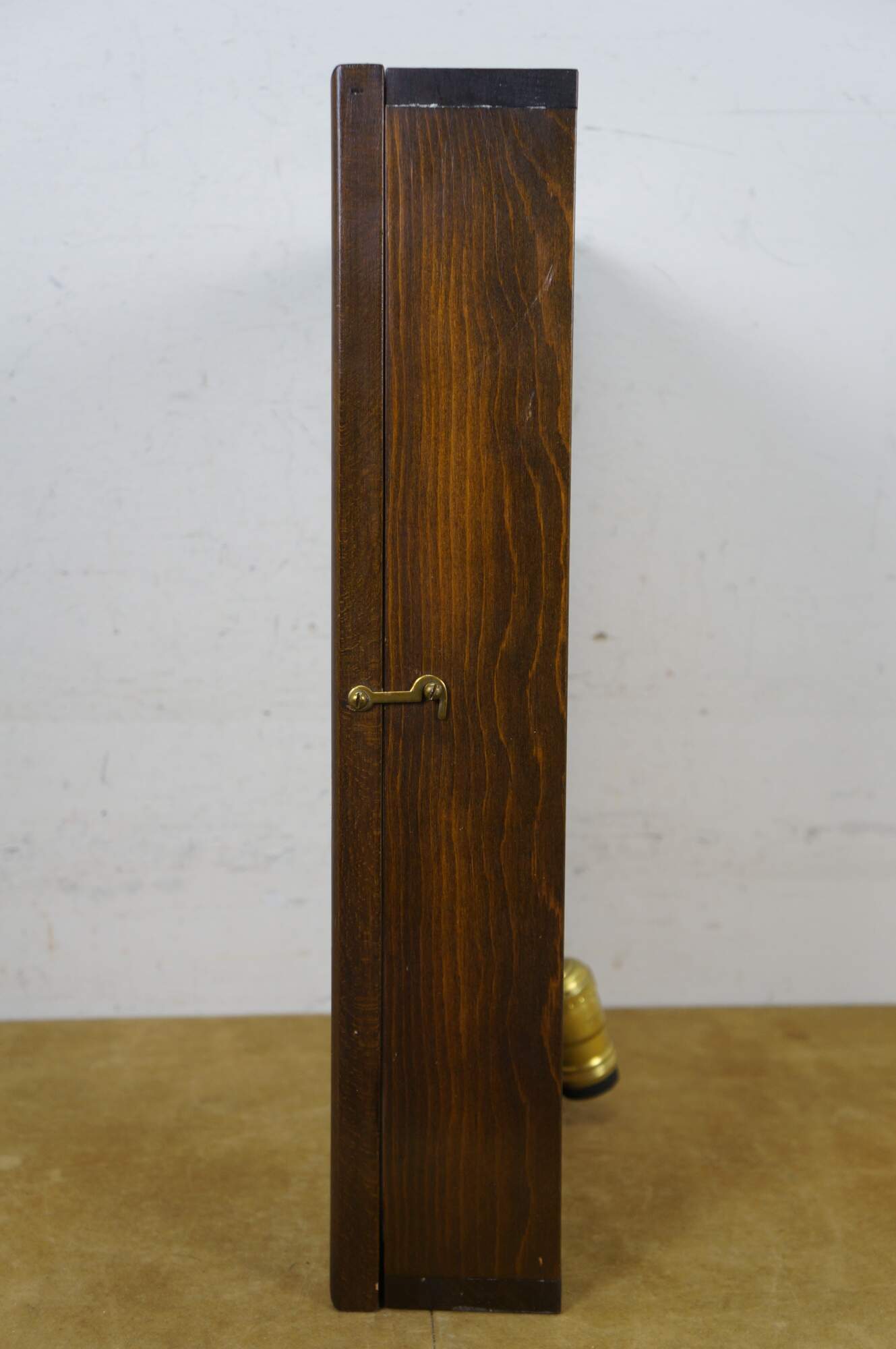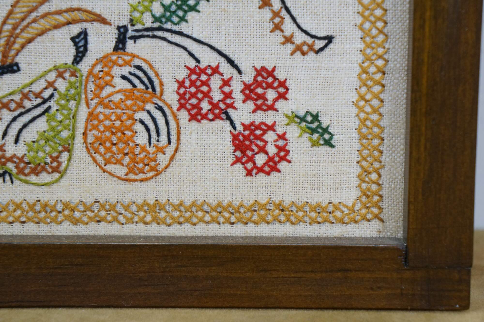 Mid 20th century Telechron electric wall clock in wooden shadowbox case with cross stitch / needlepoint face featuring scroling vines and a variety of fruit; brown Roman numerals. Black metal hands. Telechron Movement 6101-602 - 115v 60c 2w - Made in USA. 2-CA-3842. Made Expressly for the American Home by Paragon Needlecraft.
