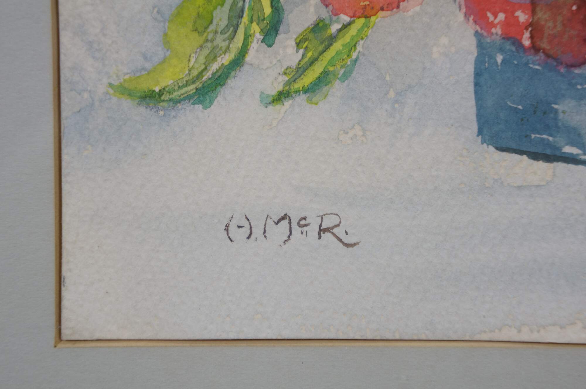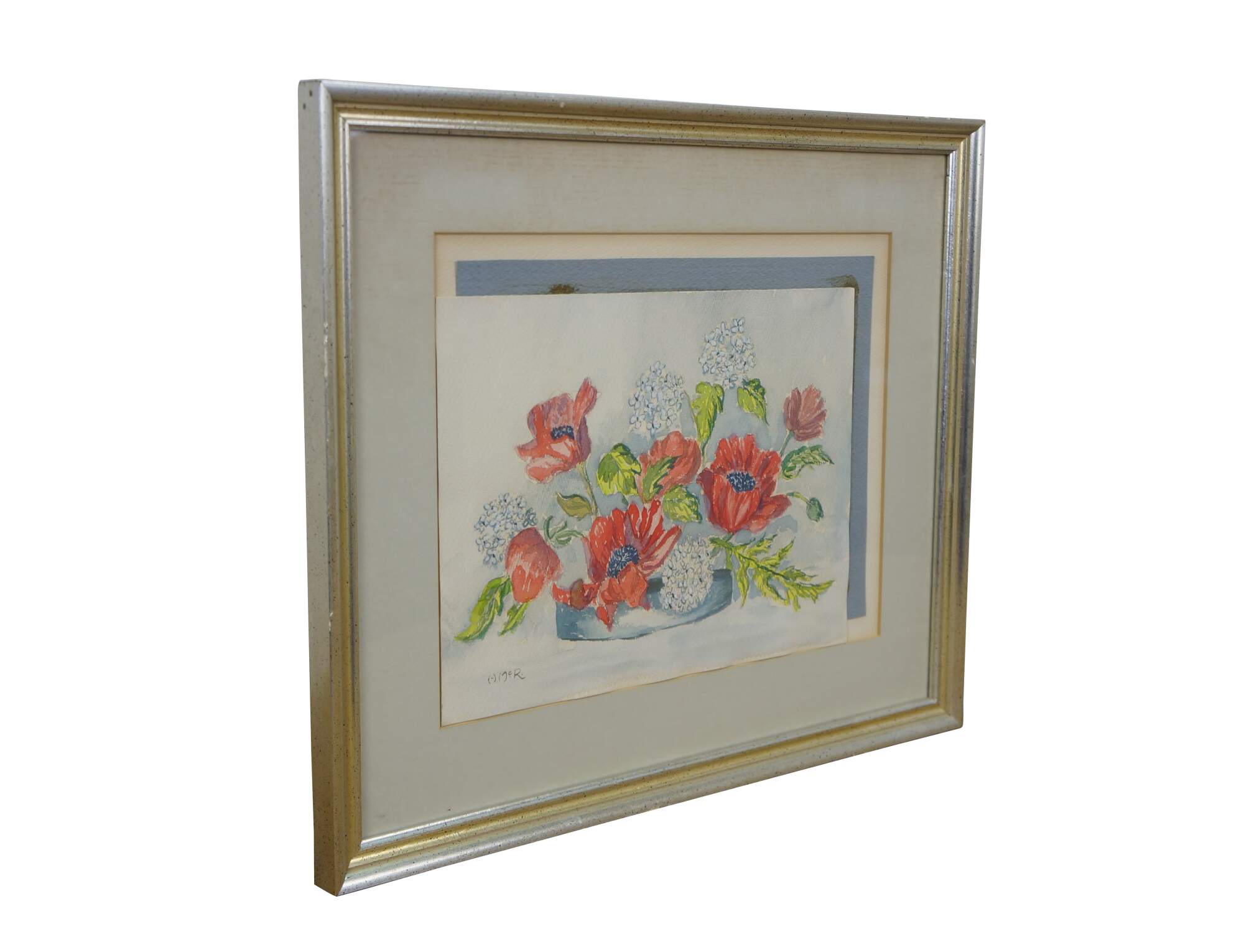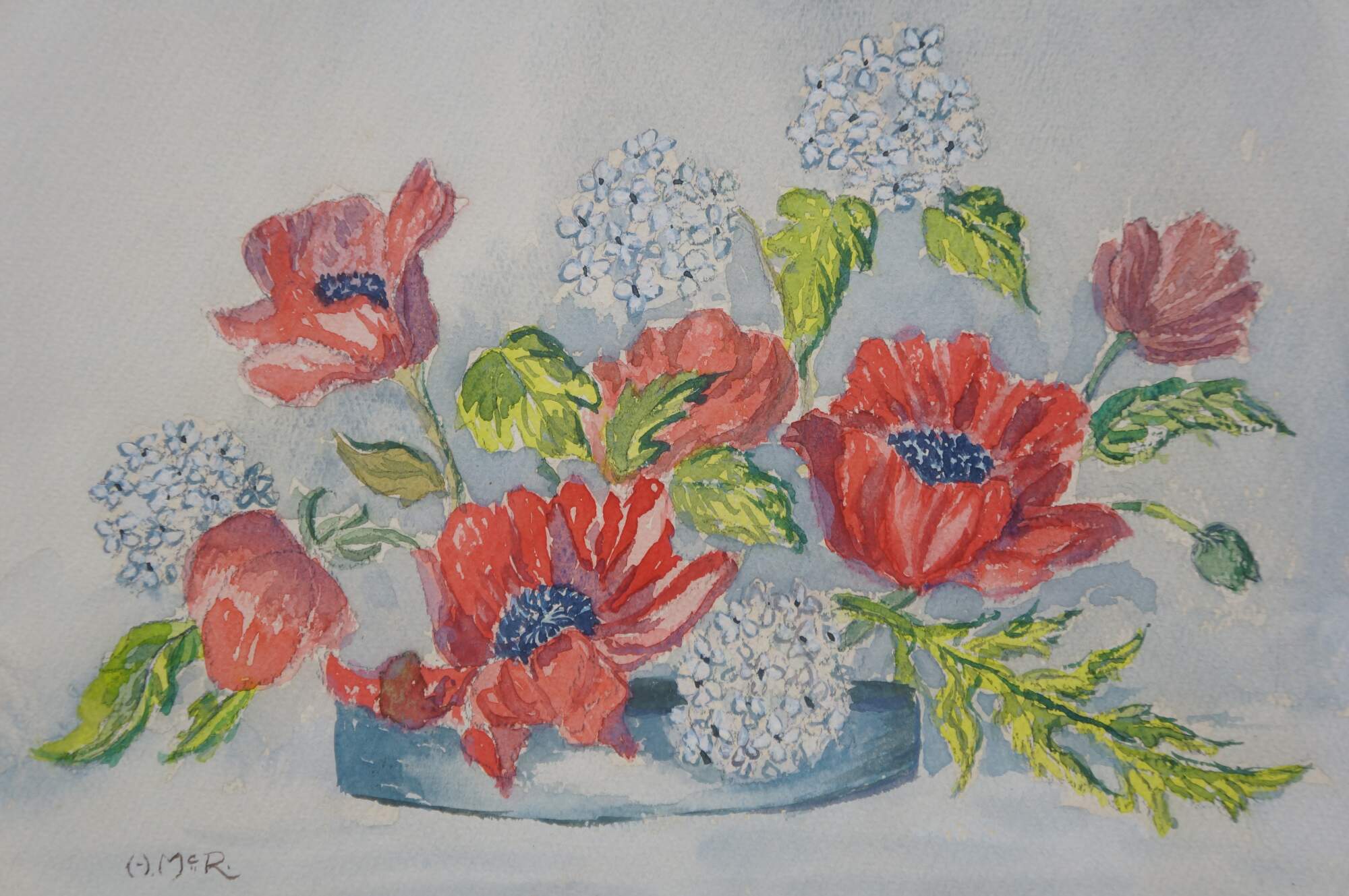 Vintage 20th century watercolor on paper still life painting of red and white flowers in a low dish. Signed H. McR in lower left.