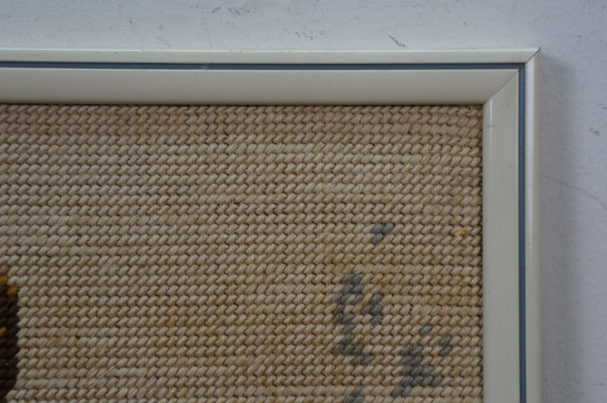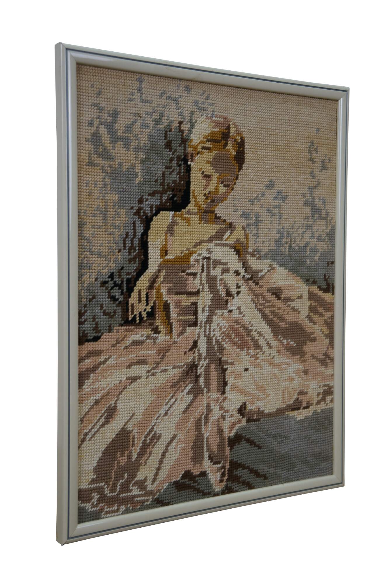 Vintage 20th century framed completed needlepoint tapestry titled Danseuse (Dancer), a printed canvas cross stitch pattern produced by SEG de Paris. This hand stitched work of textile art depicts a seated ballerina in large pink skirt on a blue and beige background. Beveled white painted frame.