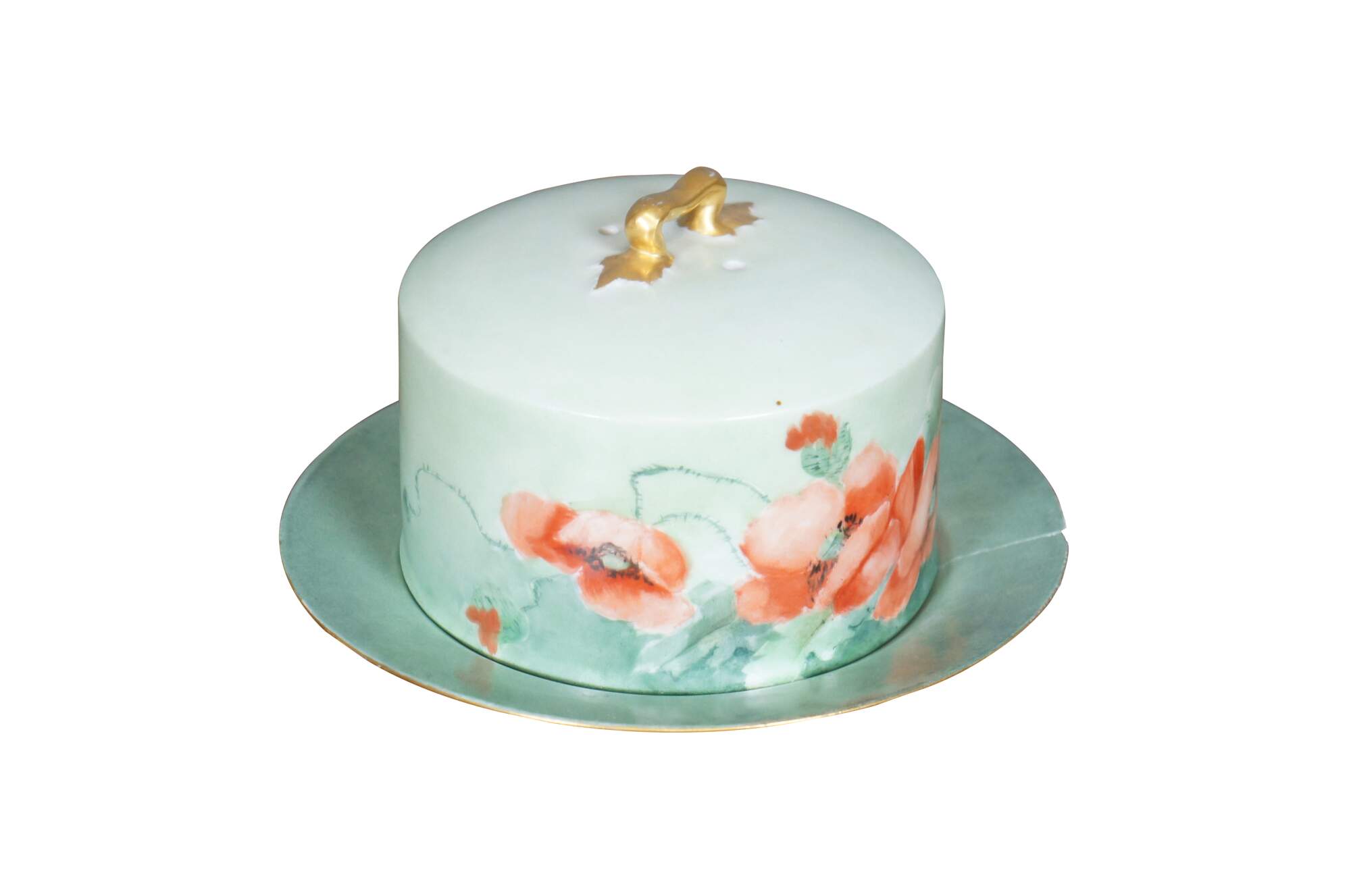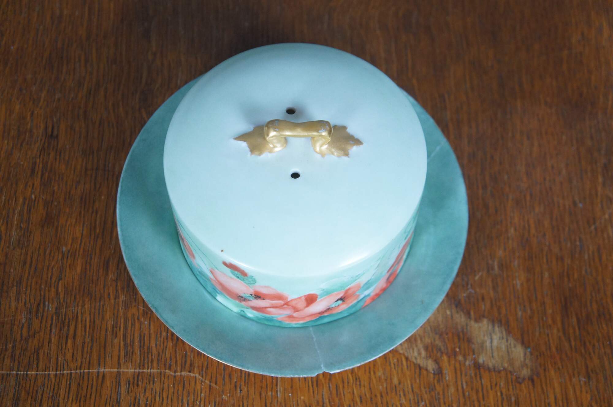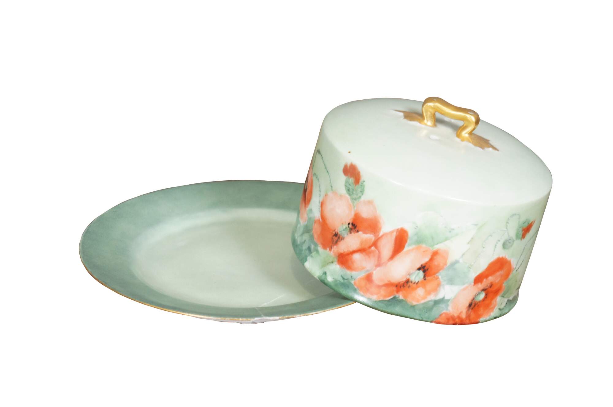 Austrian Victorian Era porcelain butter / cheese dish including underplate and dome hand painted in pale green with clusters of red poppies and small gilt handle.