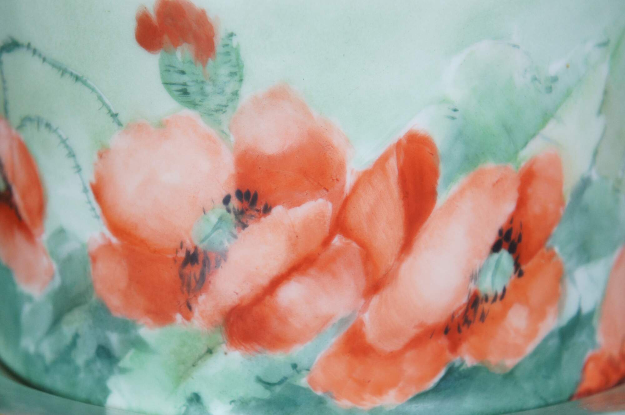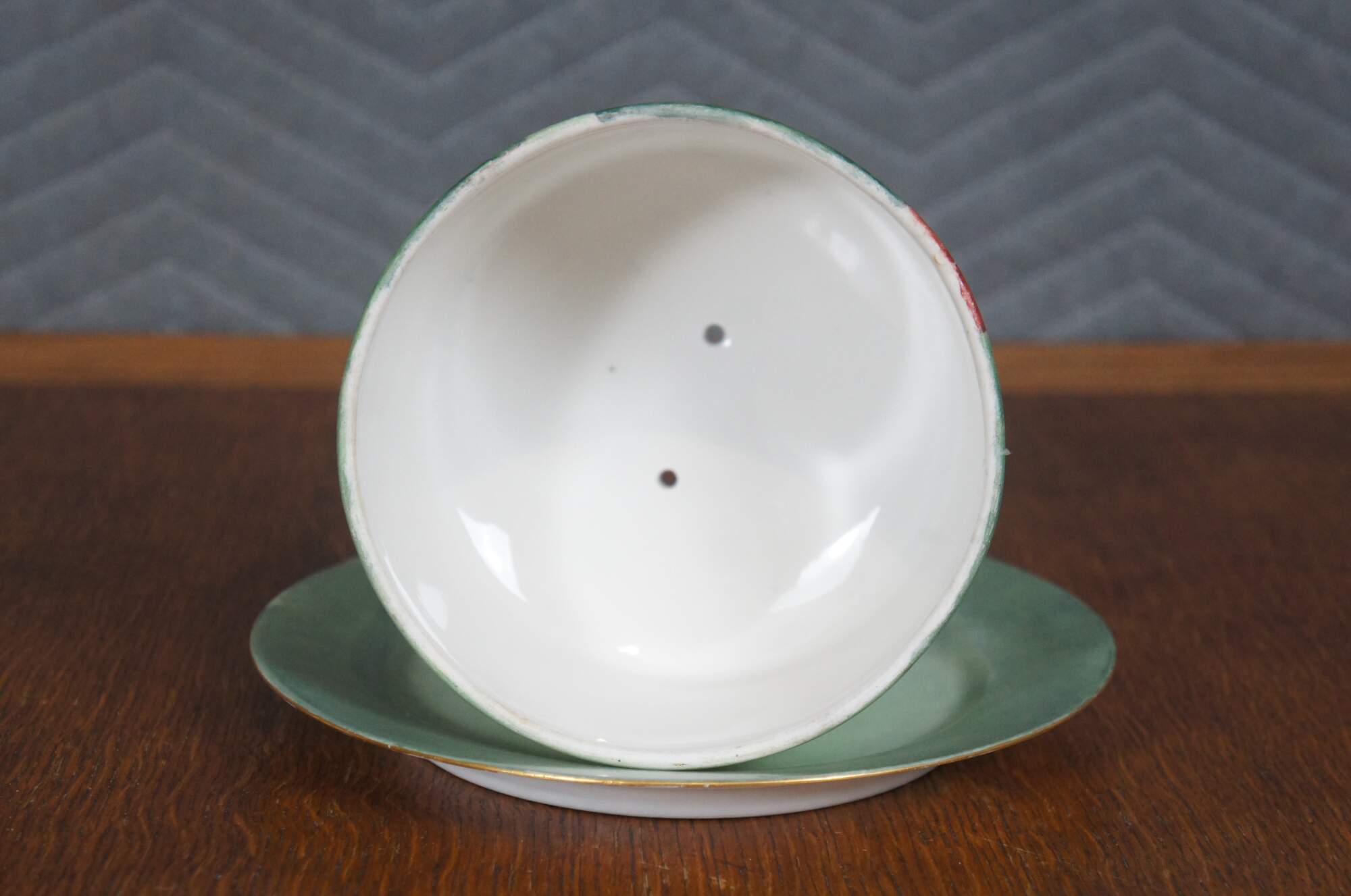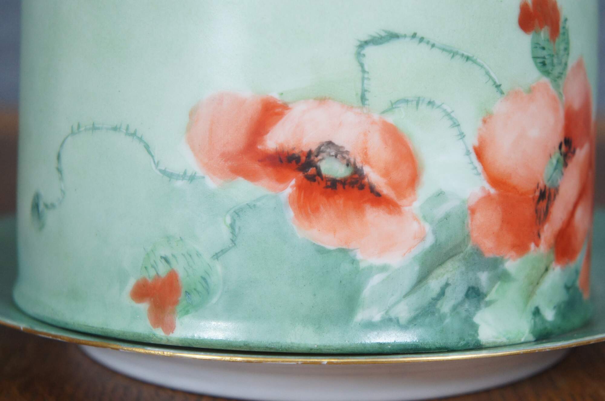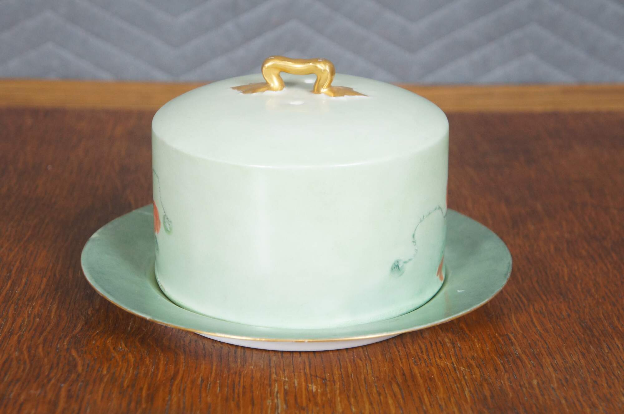 Austrian Victorian Era porcelain butter / cheese dish including underplate and dome hand painted in pale green with clusters of red poppies and small gilt handle.