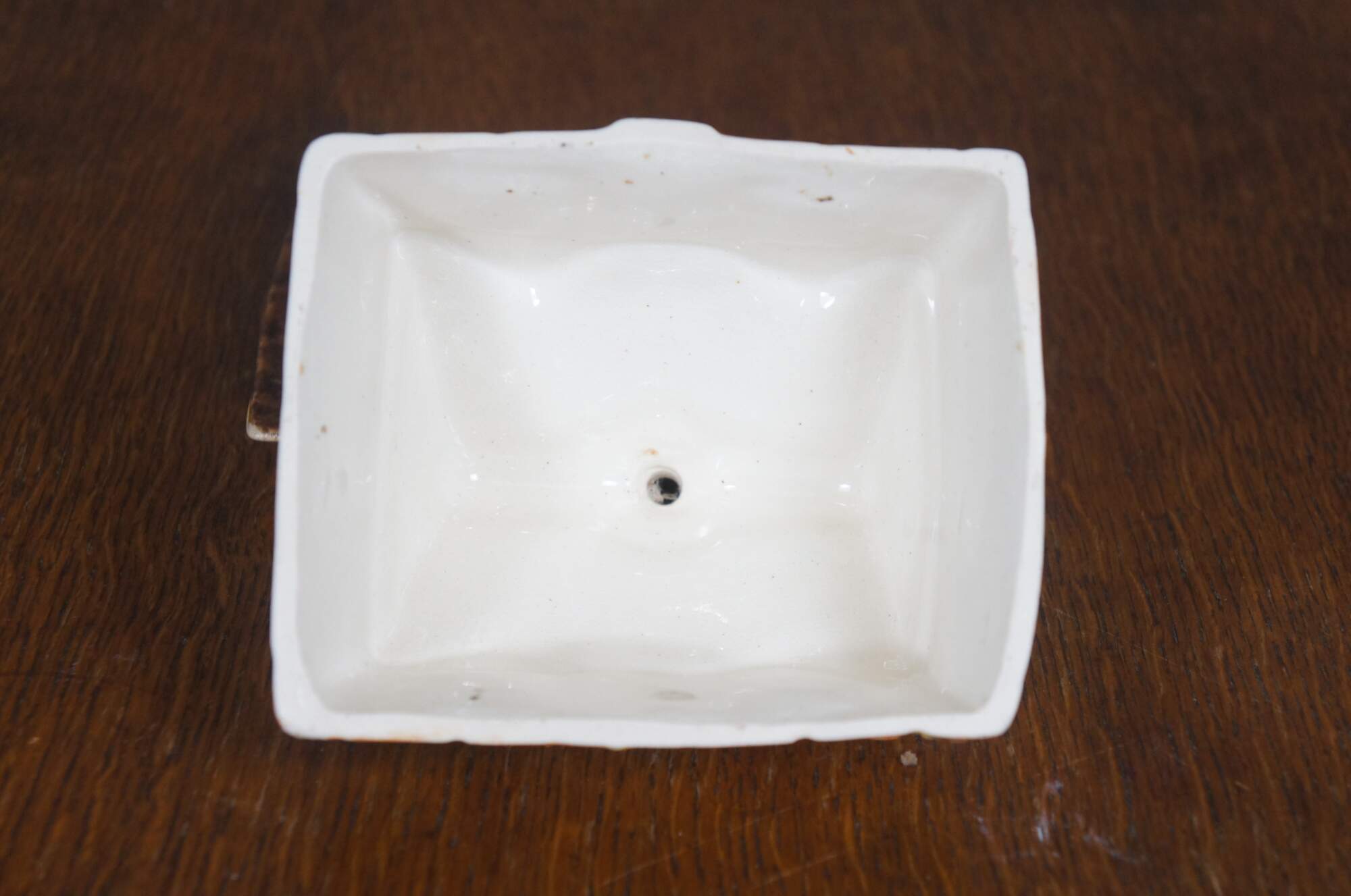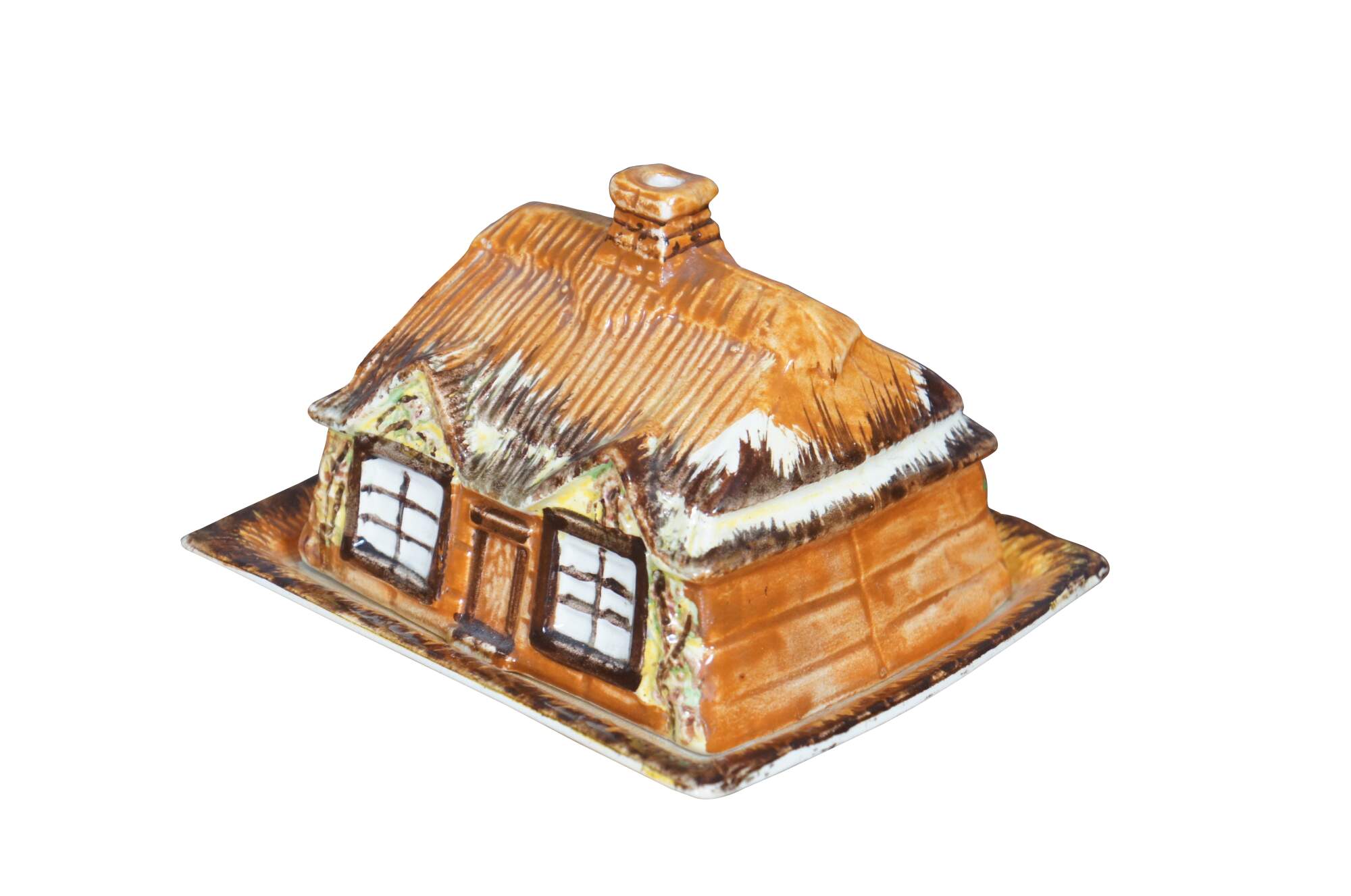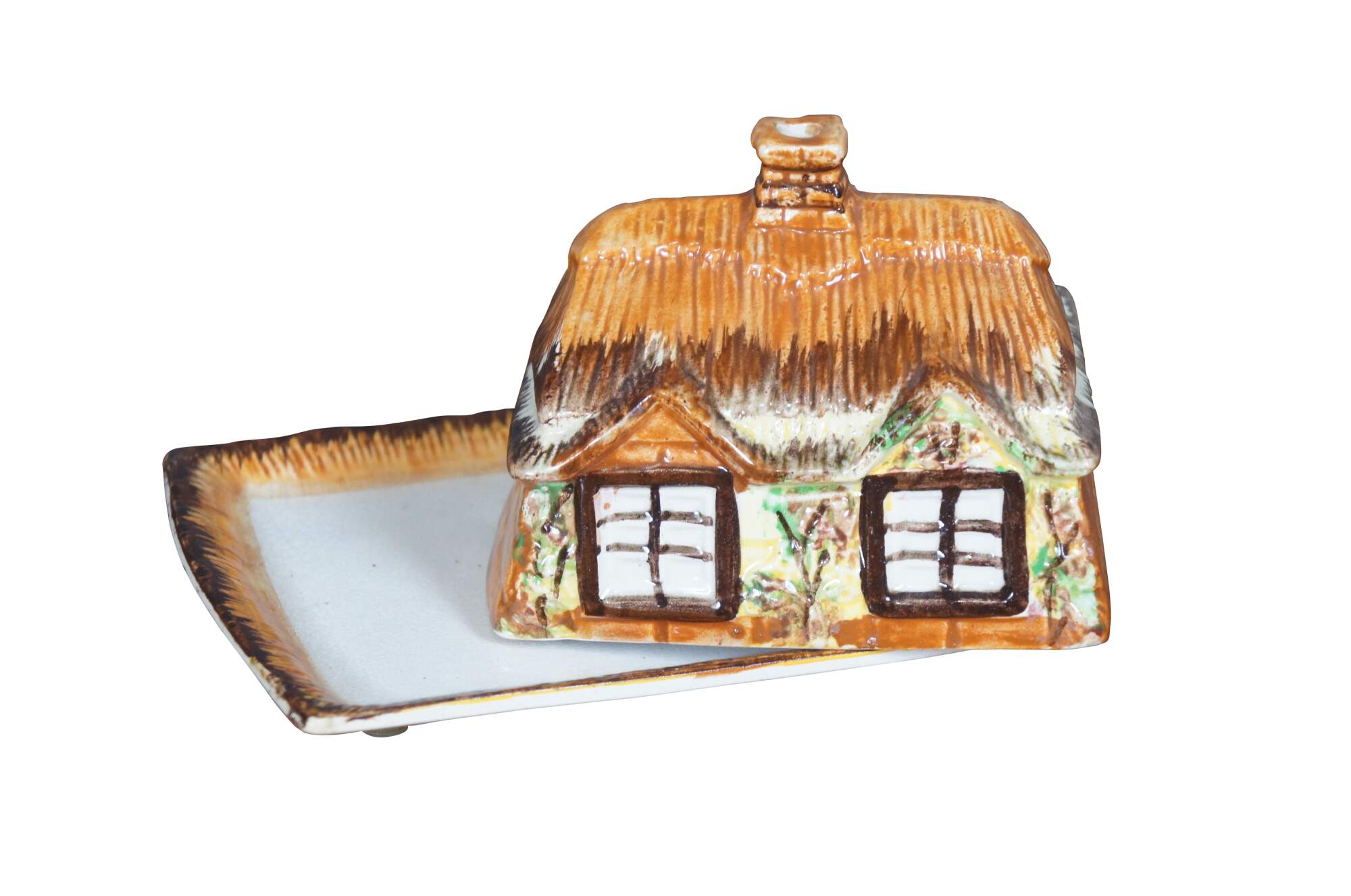 Mid 20th century Price Bros Cottage Ware porcelain butter / cheese dish. Rectangular underplate painted as if made of thatch with a thatched cottage shaped dome / lid. Made in England.