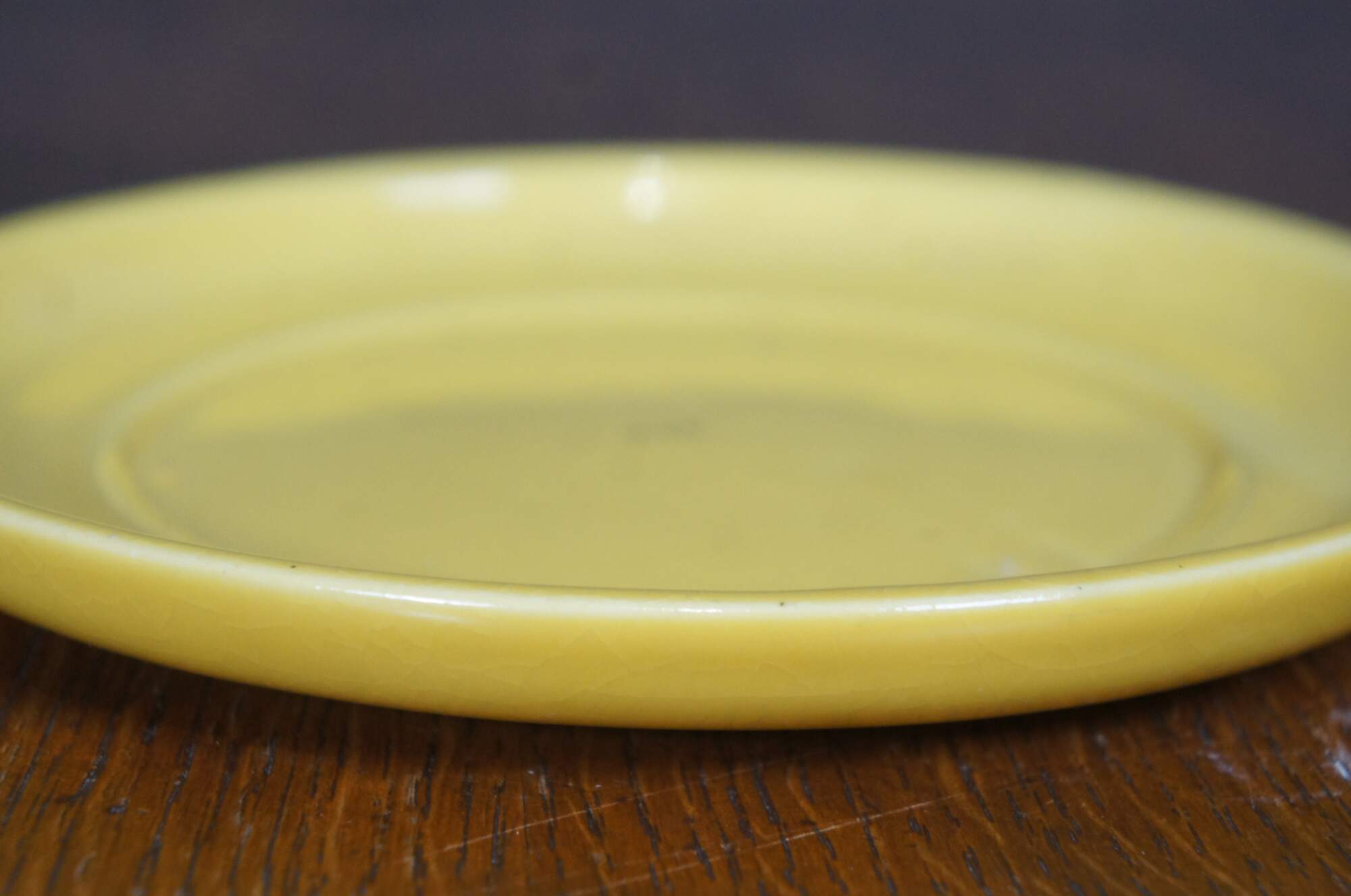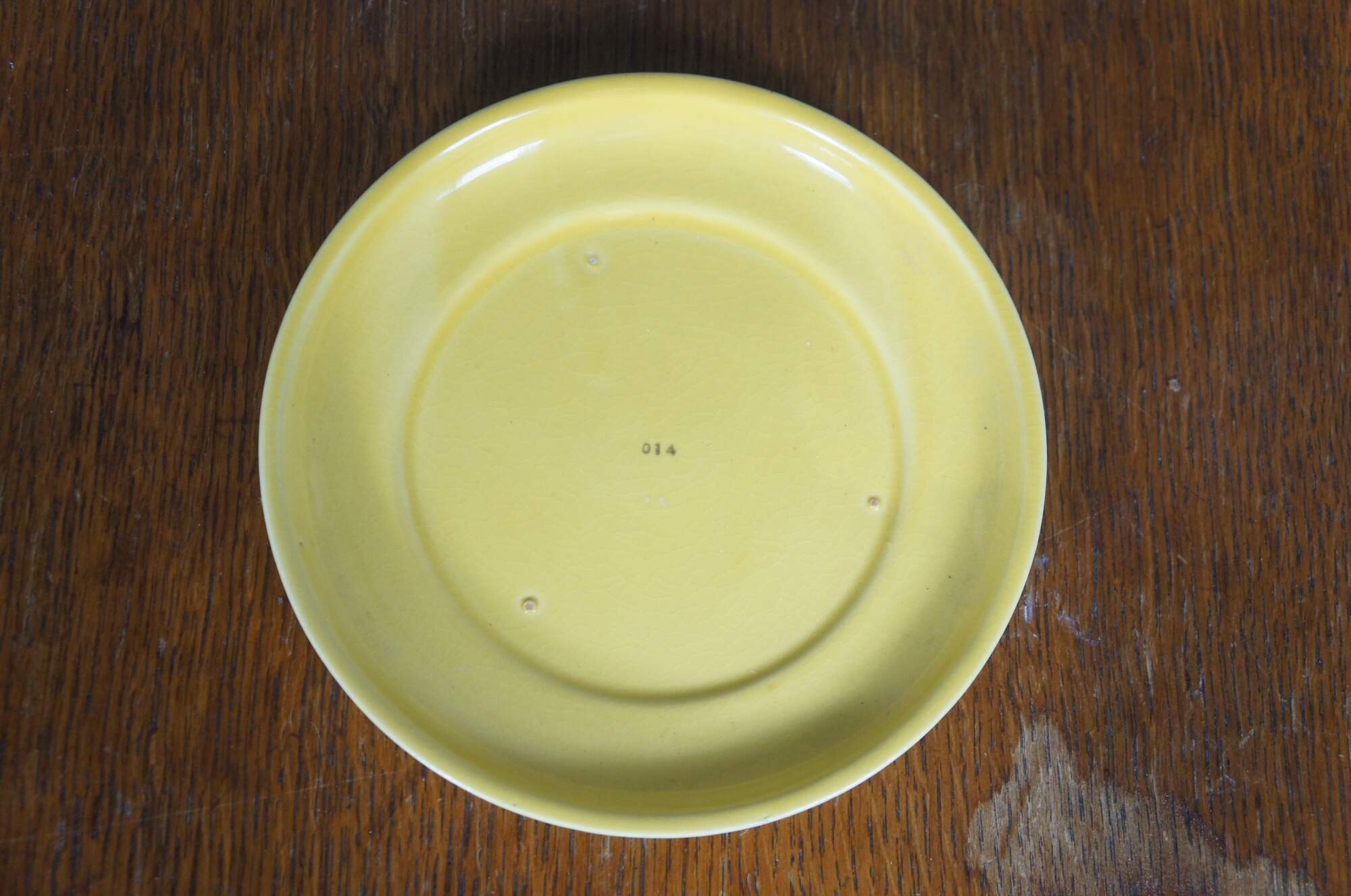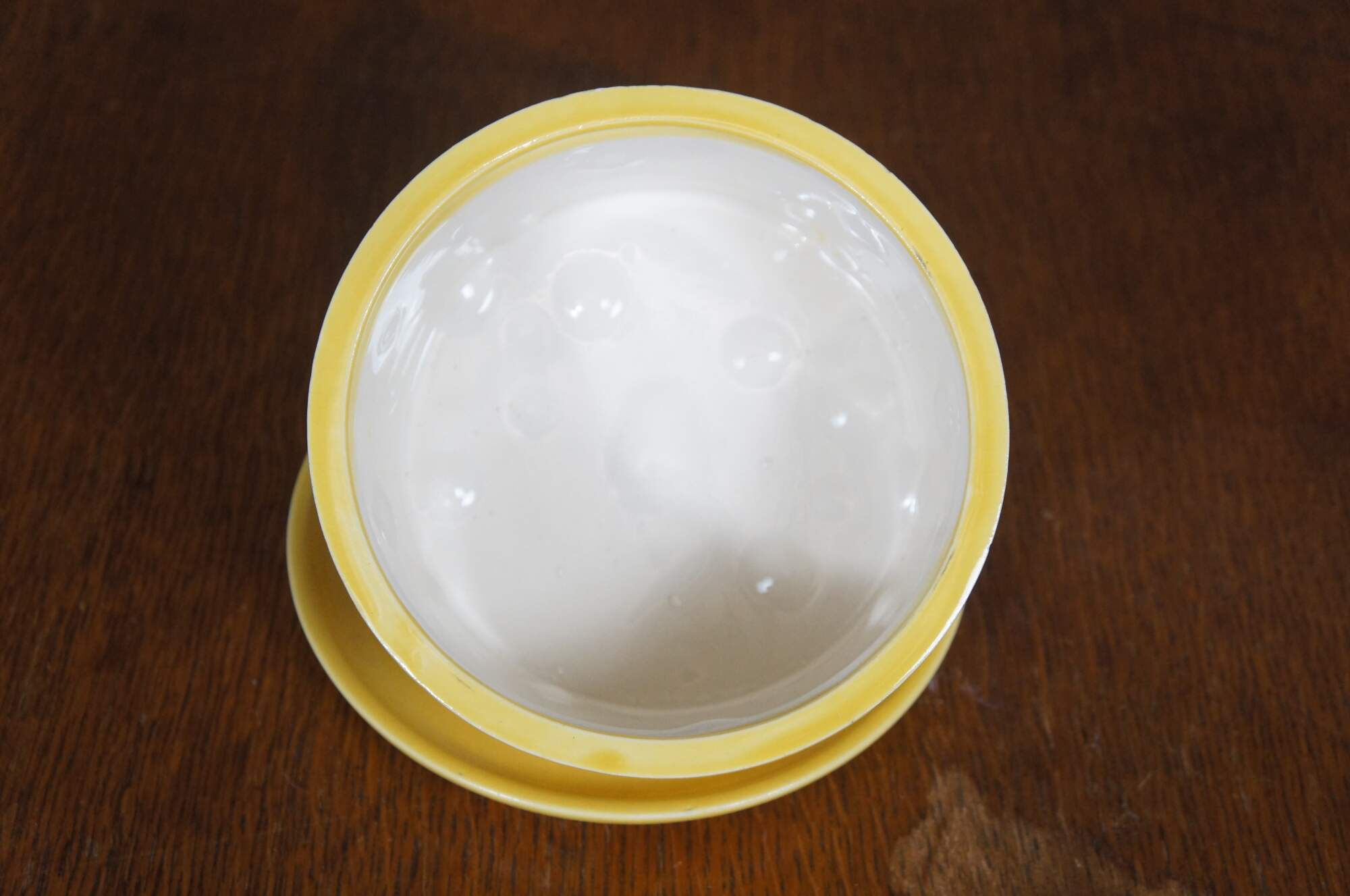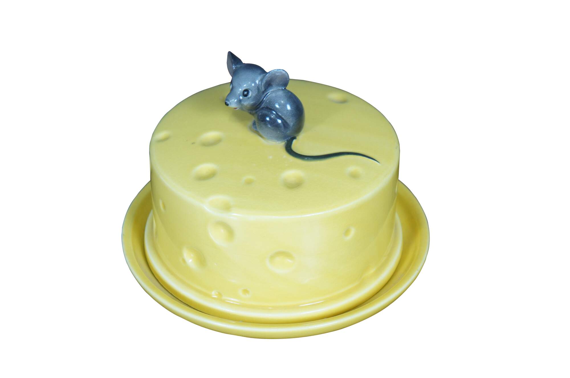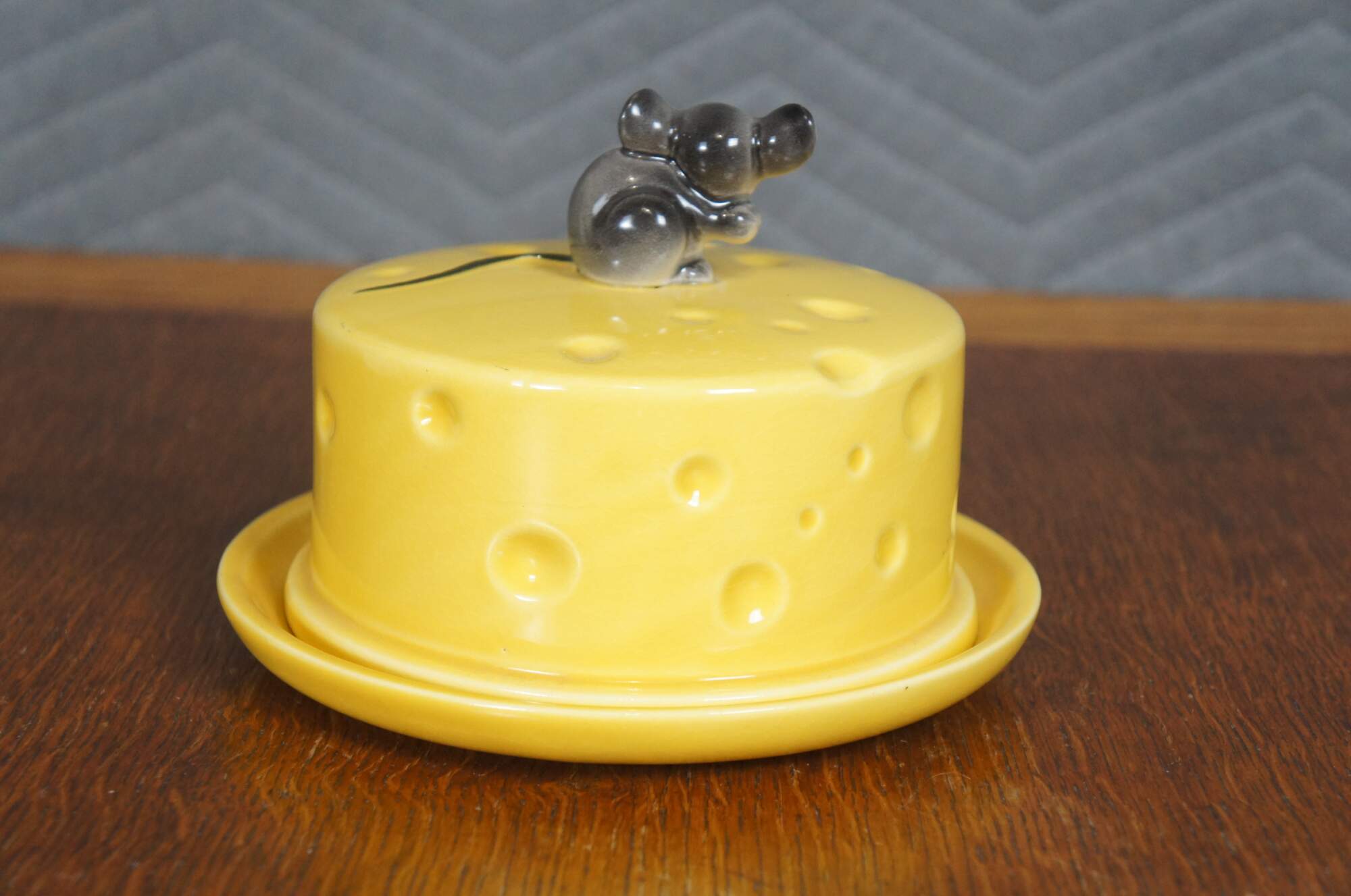 Mid 20th century ceramic cheese / butter dish. Round yellow underplate and lid / dome featuring a gray mouse perched on a wheel of swiss cheese. Underplate marked 014. Attributed to Lefton China.