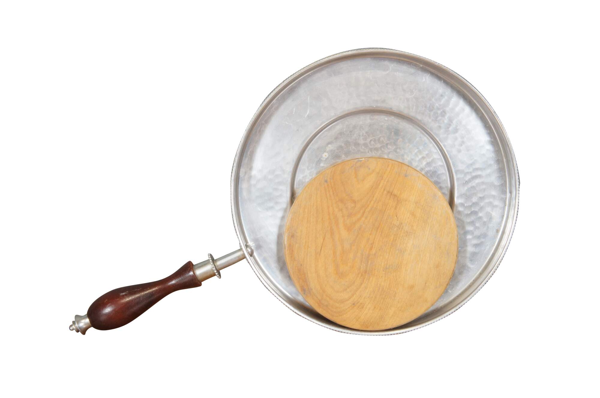 Vintage seven piece mid 20th century Buenilum hammered aluminum chafing dish set including: chafing stand with burner; double boiler pot with lid and wood handles; and low footed pan with wood insert / trivet and handle.