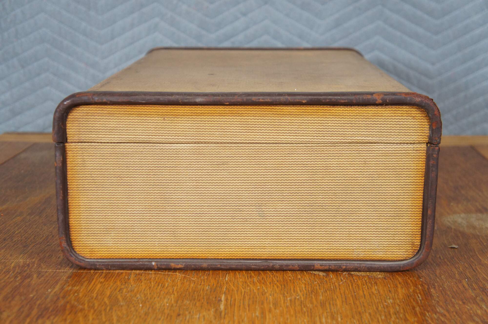 Early to mid 20th century hard sided suitcase by the Mendel Company of Cincinnati, Ohio. Light brown with dark brown leather trim and handle. Two lockable sliding latches (no key). Stamped with the initials / monogram I.C.K. in gold. Beige satin lining with two elasticized pockets in the lid and two sides of the base, plus one zippered pocket in the base.