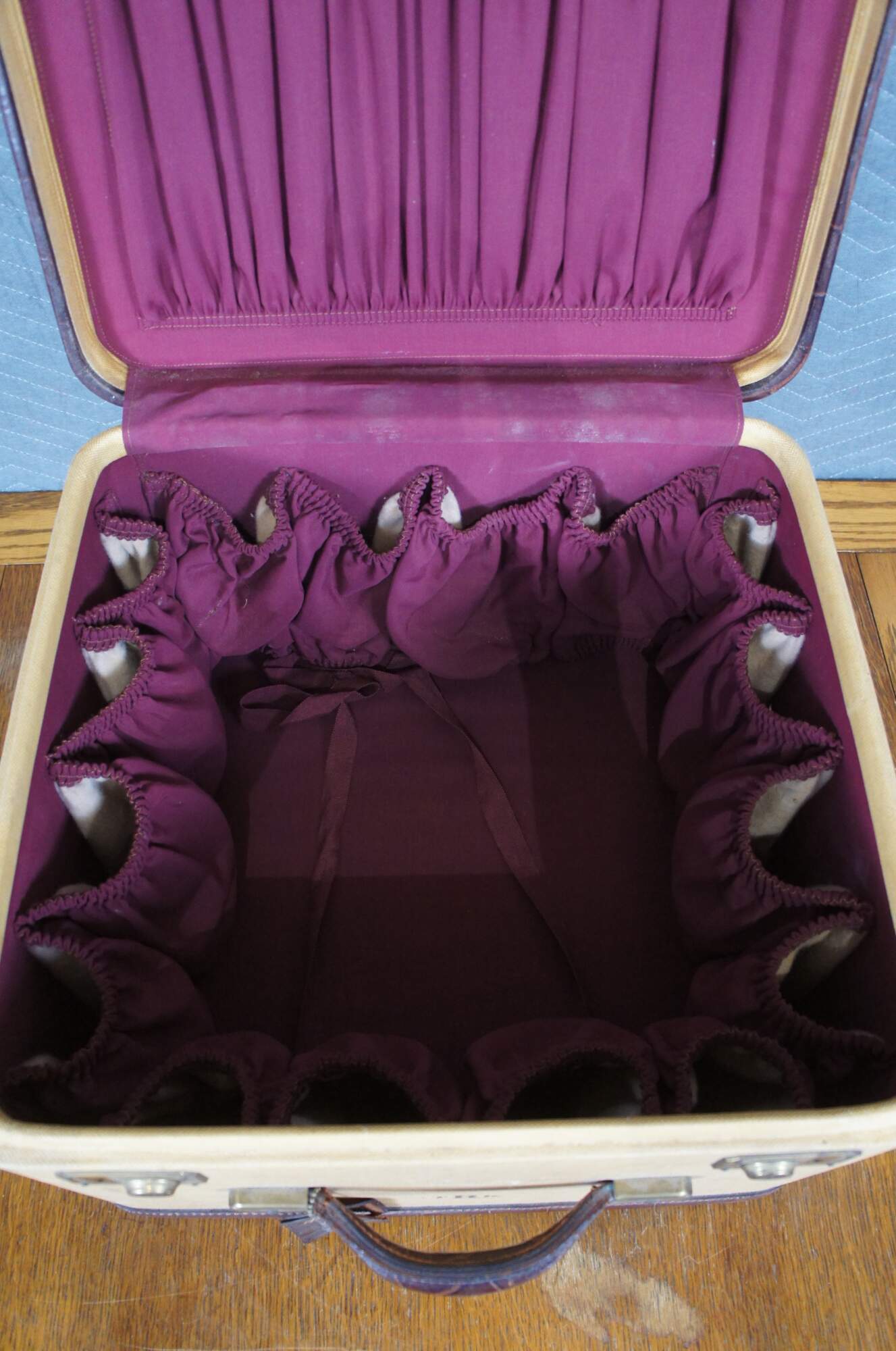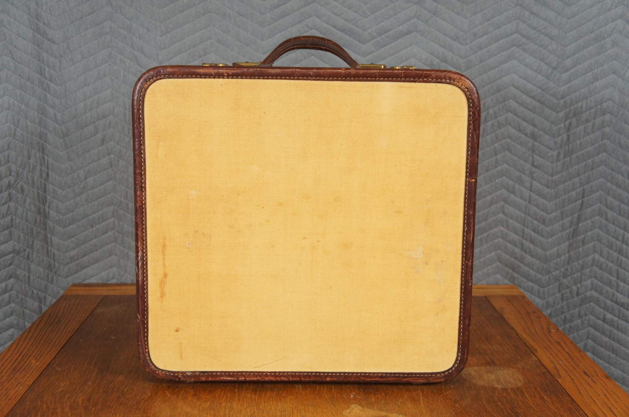 Early to mid-20th century Amelia Earhart branded hat / shoe / cosmetics / makeup luggage case. Yellowed canvase exterior with brown alligator leather trim and handle. Two lockable sliding Yale latches (no key). Stamped with initials / monogram TKR in brown. Burgundy cloth lining with elasticized slip pocket on lid, 16 elasticized shoe slots (accommodating up to 8 pairs of shoes), and ties in the center section to secure hats. Includes leather luggage tag.