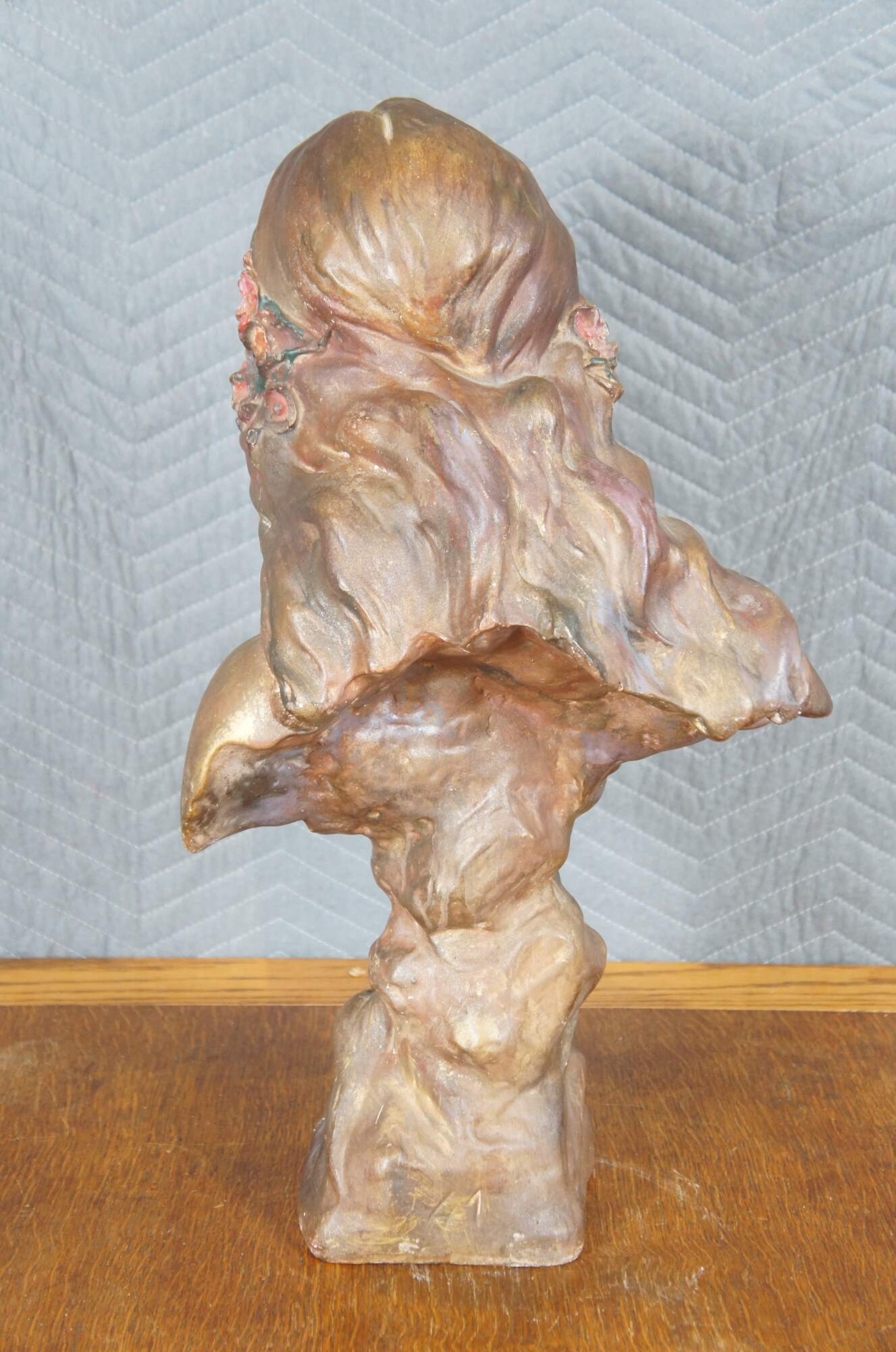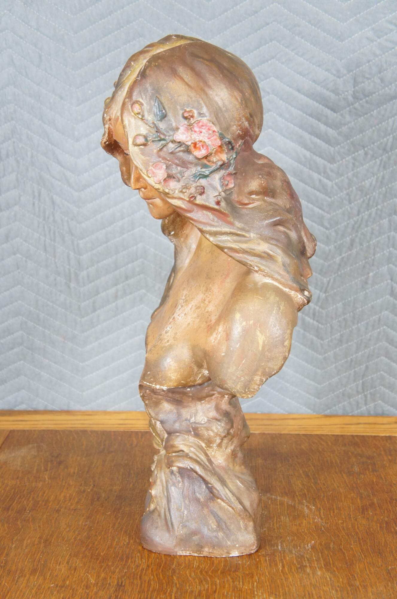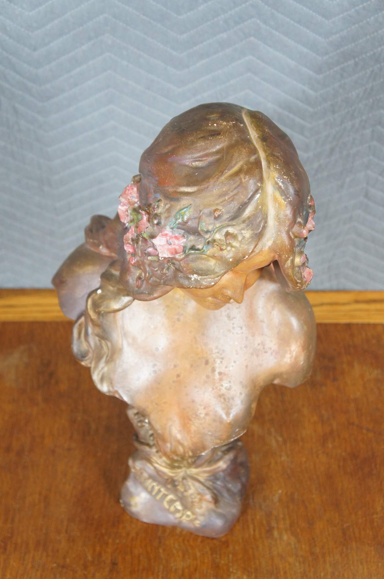 Large mid to early 20th century Art Nouveau style painted chalkware bust titled Le Printemps (Spring) after H. L. Bläsche (active circa 1900-1950). Depicts the personification of spring as a nude young woman with flowing hair trimmed with flowers.
