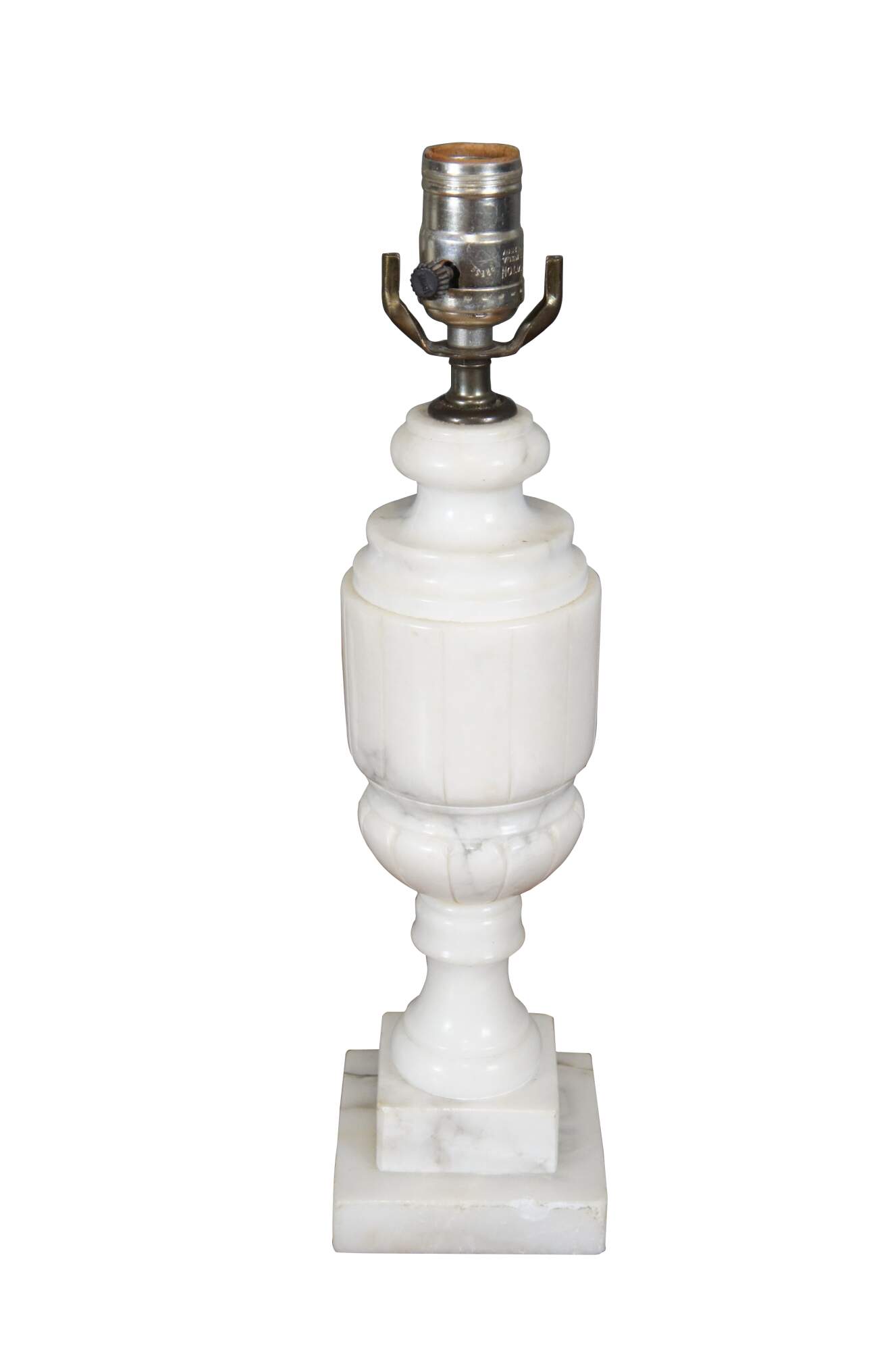 Pair of antique albaster / white marble table lamps, carved in the shape of neoclassical urns on a square base.