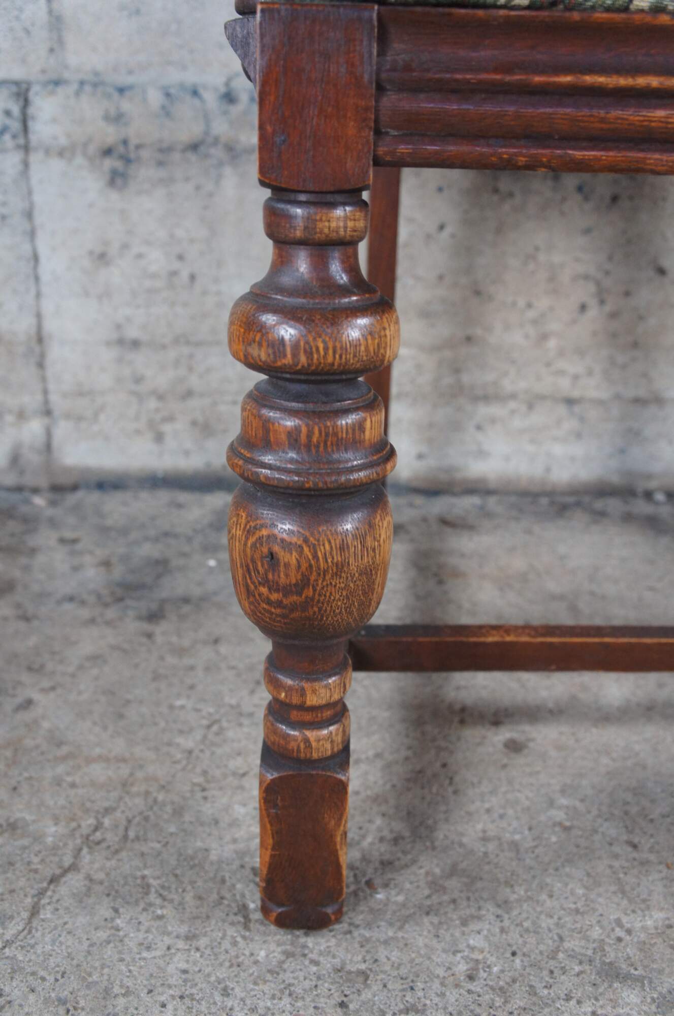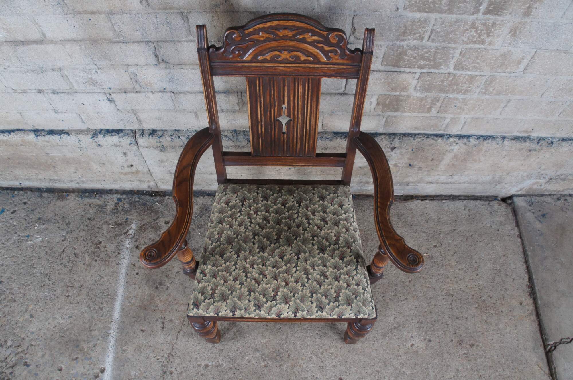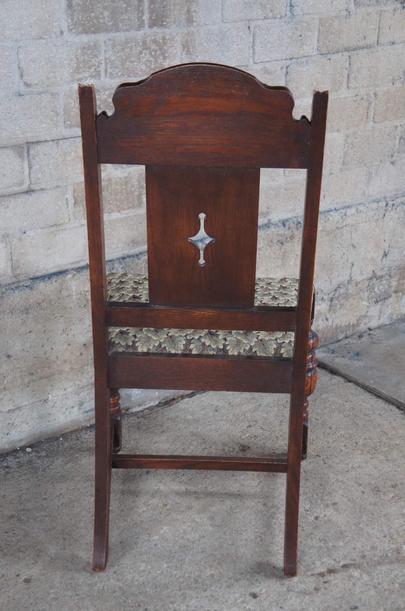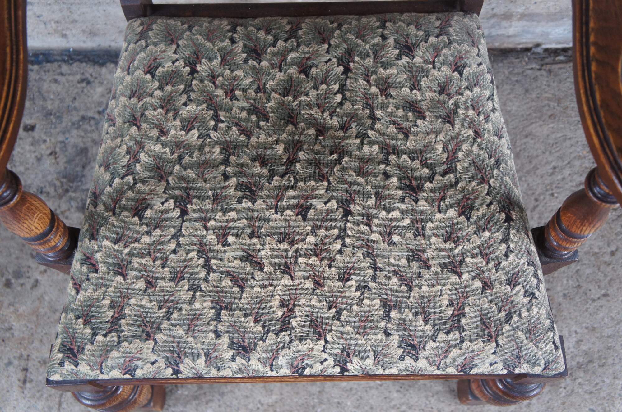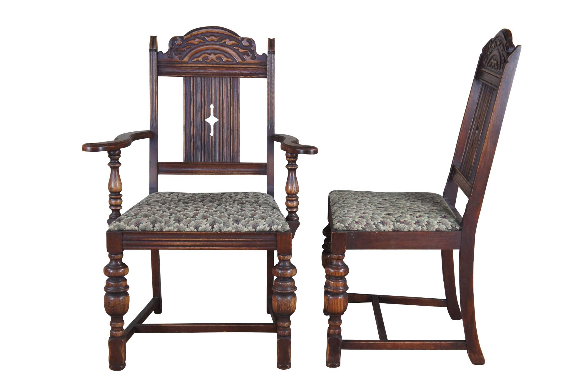 Set of 5 Vintage Jacobean style Dining Chairs by Bernhardt Furniture, circa 1930-40s. Features a carved crest rail over a pierced diamond linen fold splat. The chairs are upholstered in a floral leaf / tree pattern and supported by baluster turned legs connected by an H stretcher. Bernhardt Furniture Company operated out of Lenoir, North Carolina.