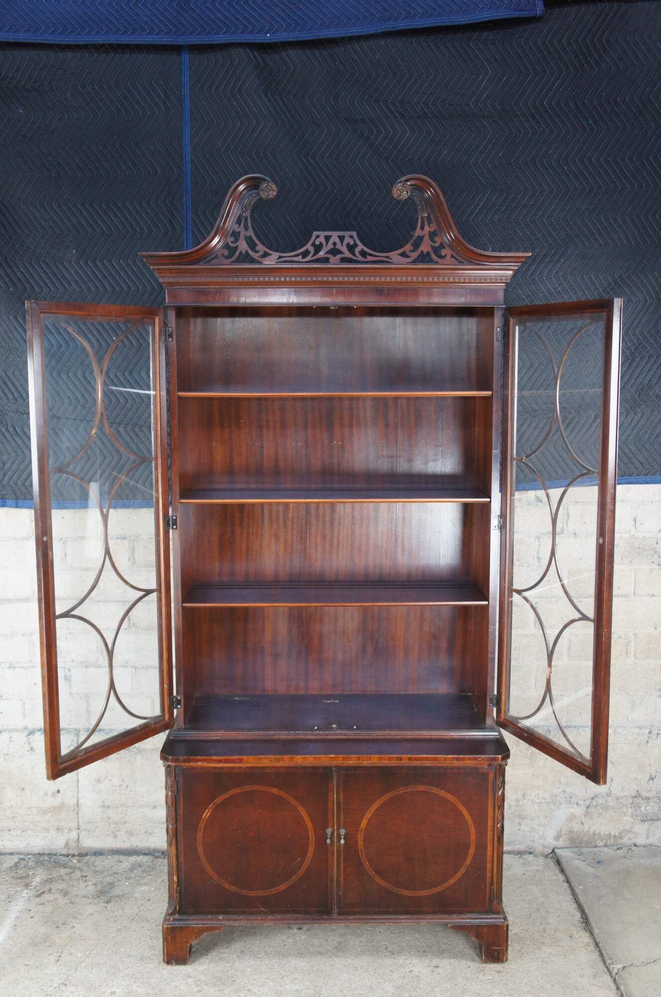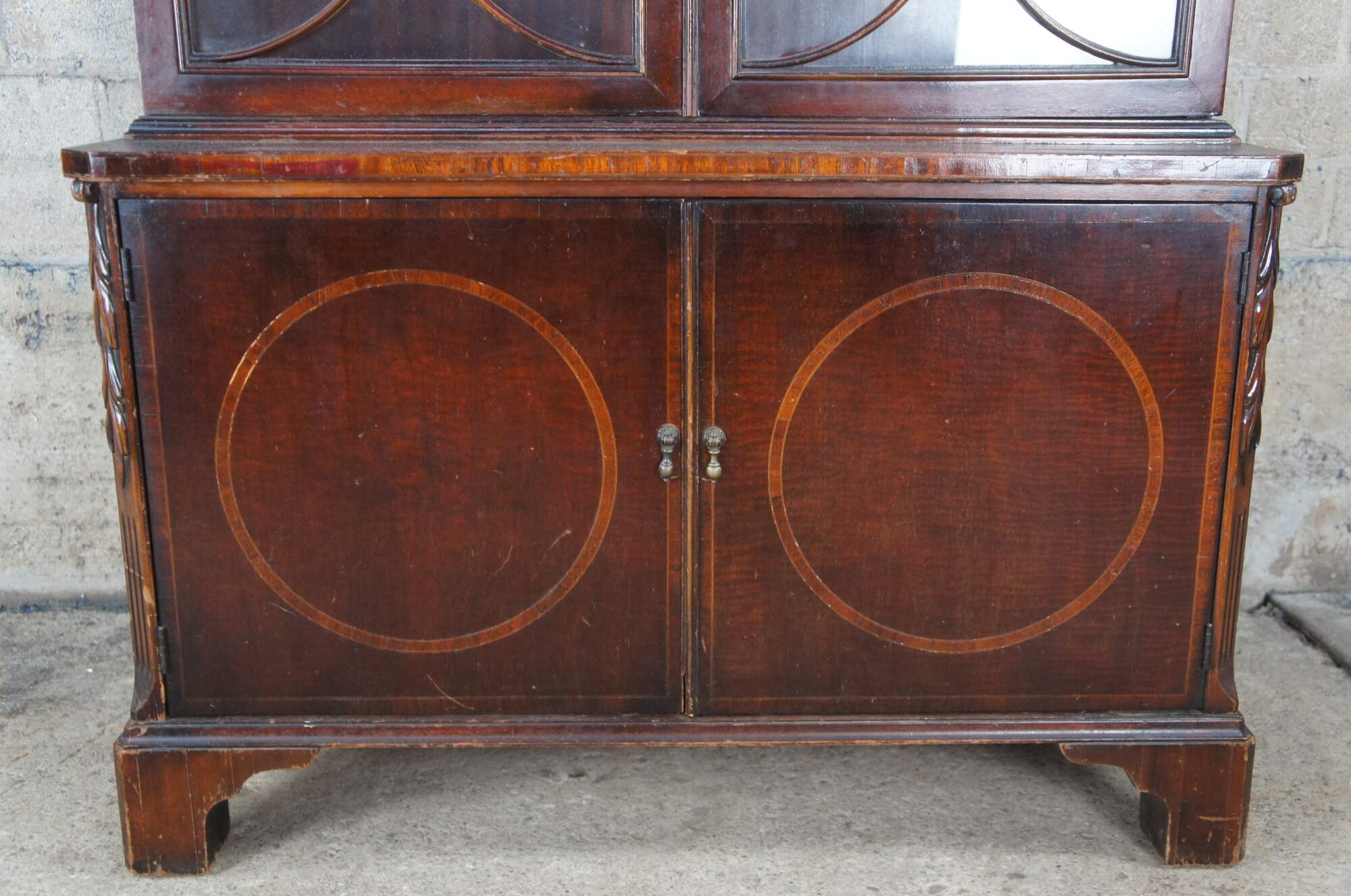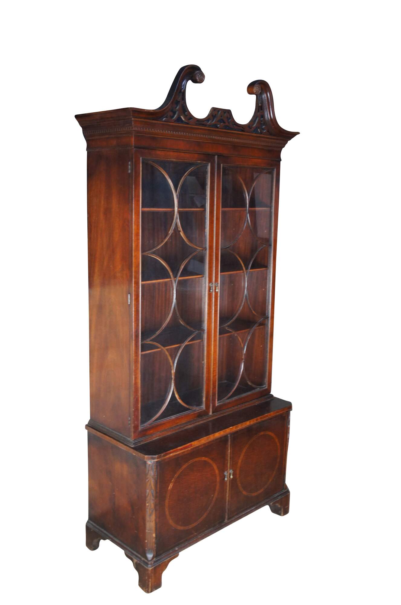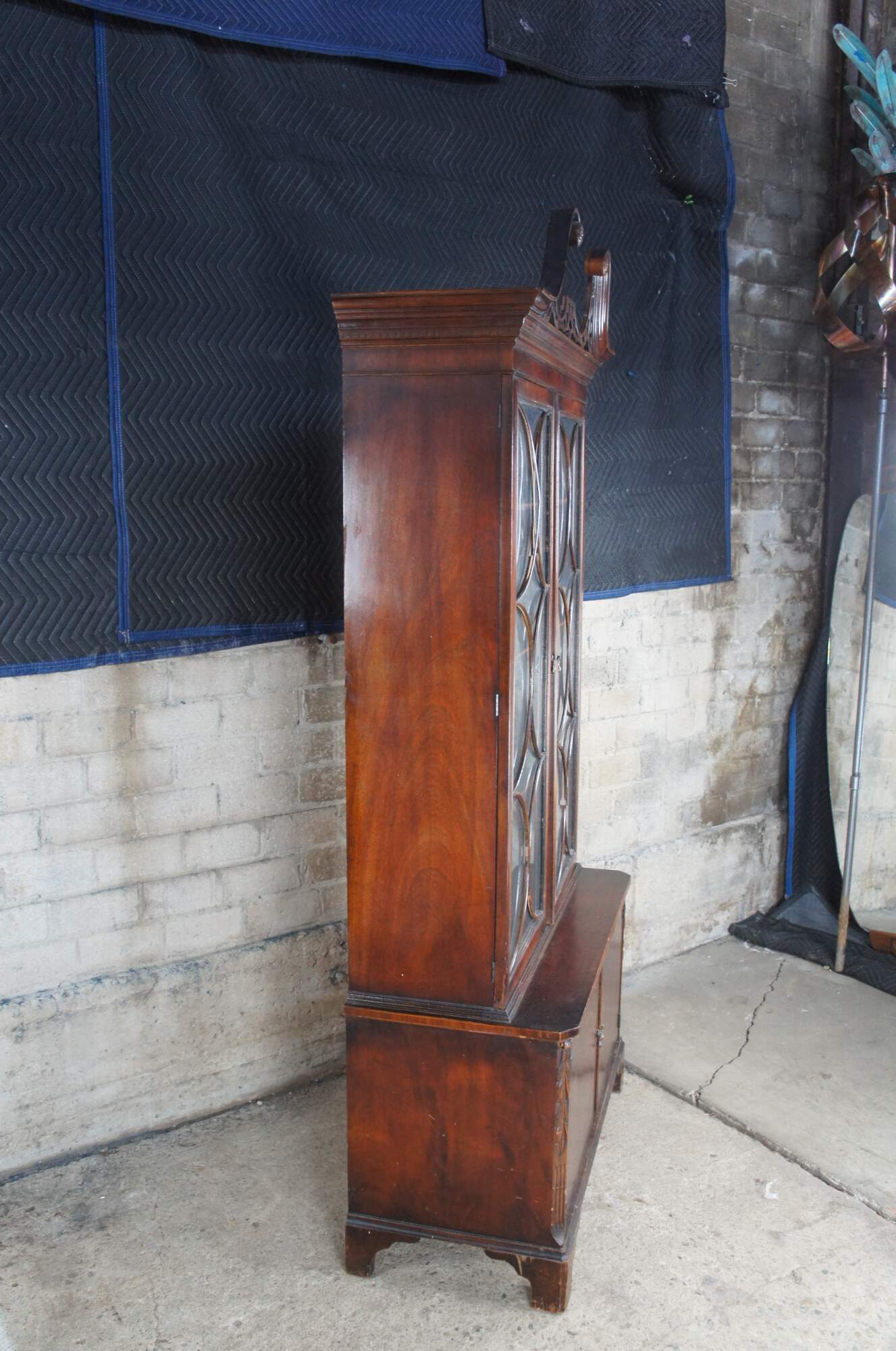 An exceptional banded mahogany China Display Cabinet or Bookcase by Union National, circa 1940s. Designed in George III styling with a beautiful interlaced open pediment crown with dentil molding over a stepback display portion showcasing diamond pattern fretwork. The interior has three shelves with plate grooves.